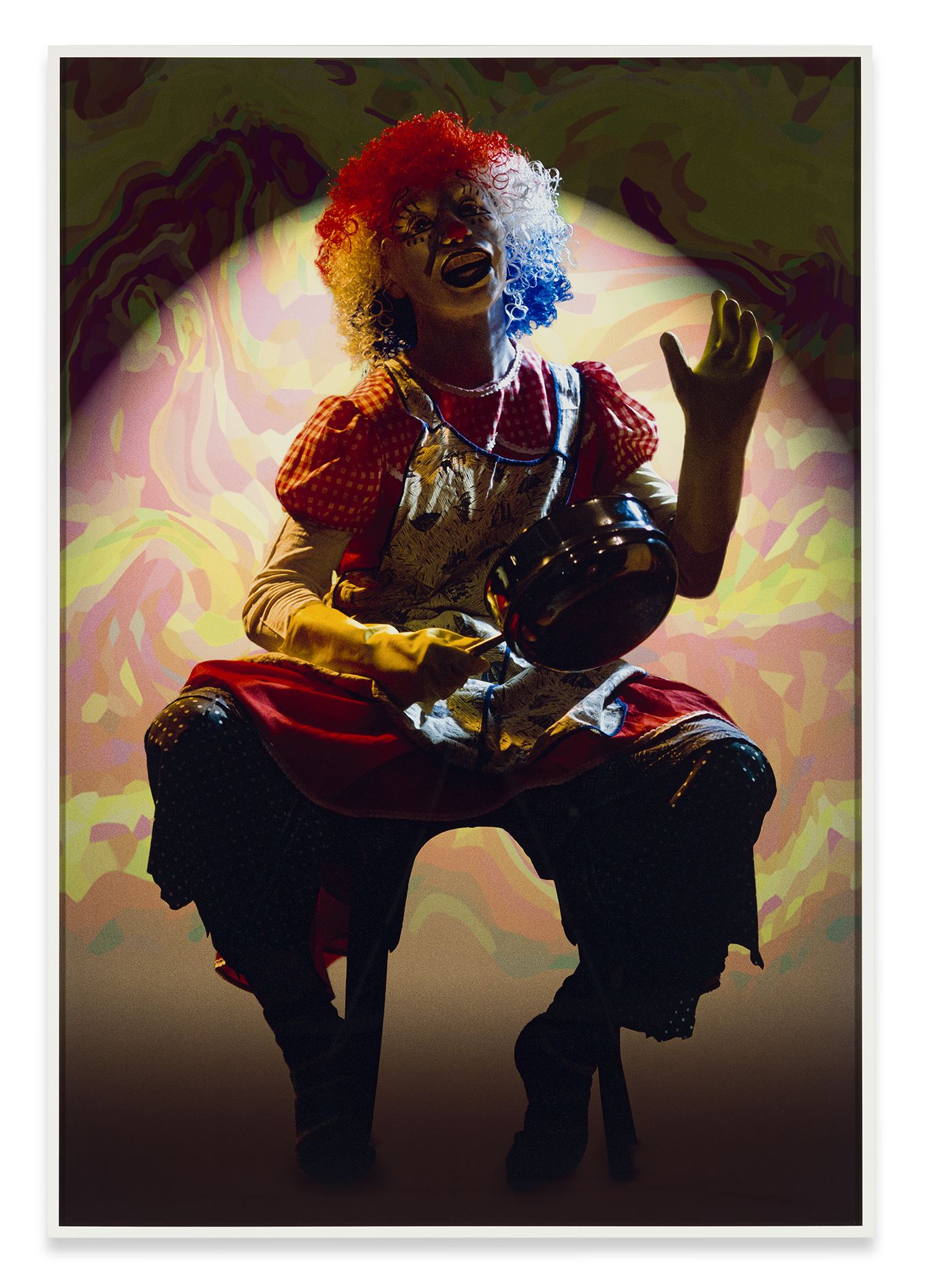 In the clown series, Sherman takes the notion of the mask and the masquerade in a new direction. Initially conceived after being approached by British Vogue magazine to guest edit their fashion section in June 2003, Sherman’s clown portraits would become a way of exploring the boundaries between clothing and costumery. Intrigued by the apparent dichotomy of the clowns’ persona and any sense of the interior, or real self, Sherman explores the society of difference in this subtly disparate group of facades.