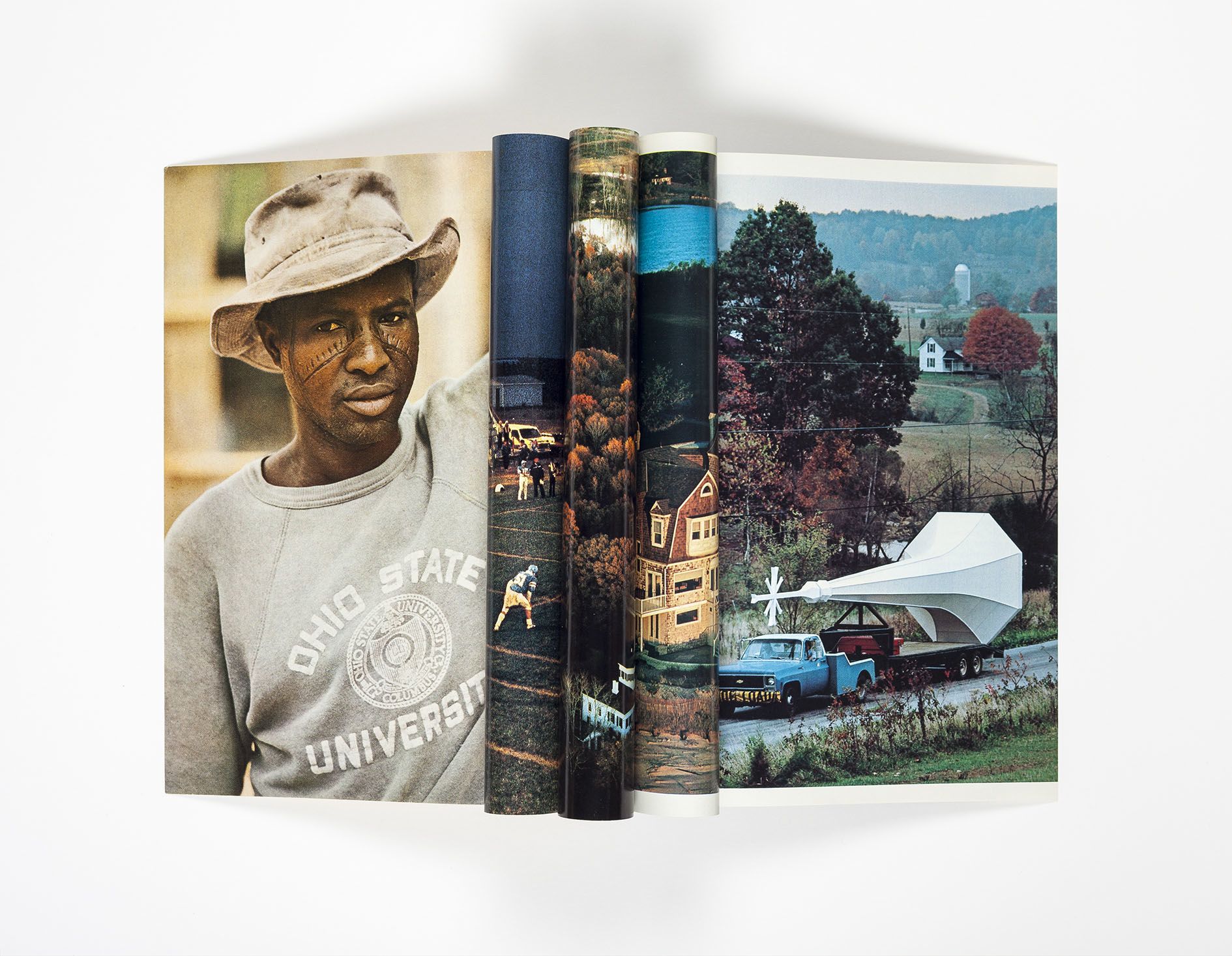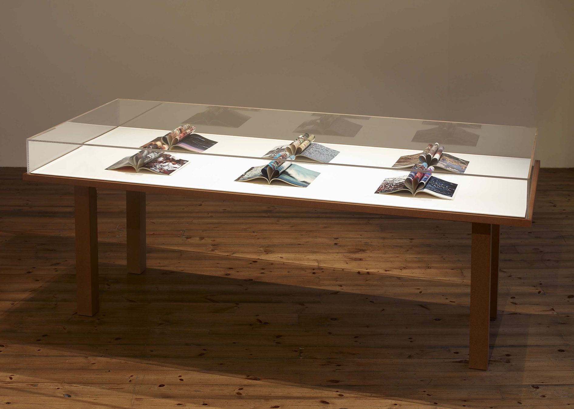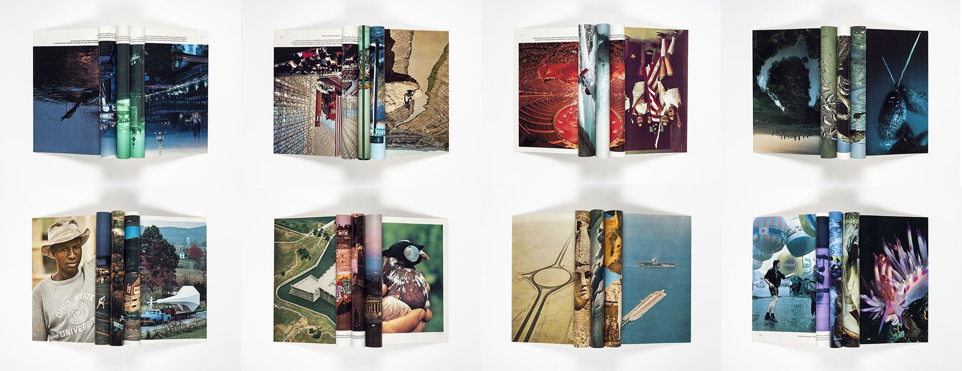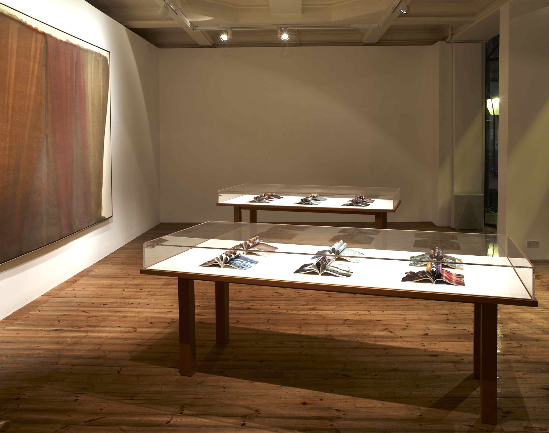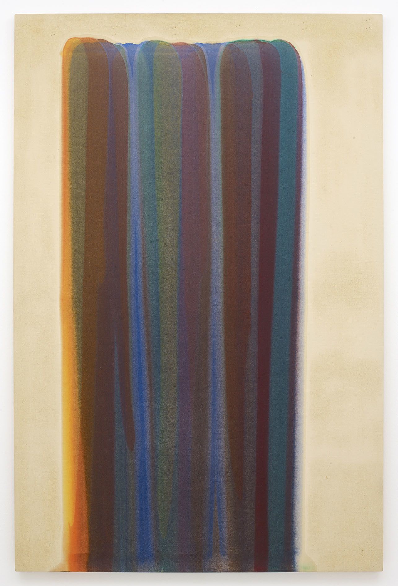 Gaillard sets up an array of formal and geographical leitmotifs throughout the exhibition. Placed in vitrines in the centre of the gallery, Gaillard displays collages made from pages of reconstructed National Geographic magazines as if they were specimens of flora. The artist took pages from the magazine’s heyday – the 1960s through the 1990s – then collaged them without glue into kaleidoscopic waves. These delicate, unfurling images become the exquisite corpses of globalisation, held together only by the internal pressure in their ridges and crevices, a tension that Gaillard detects in the paintings of Morris Louis.
