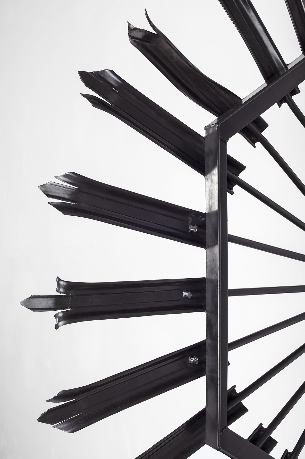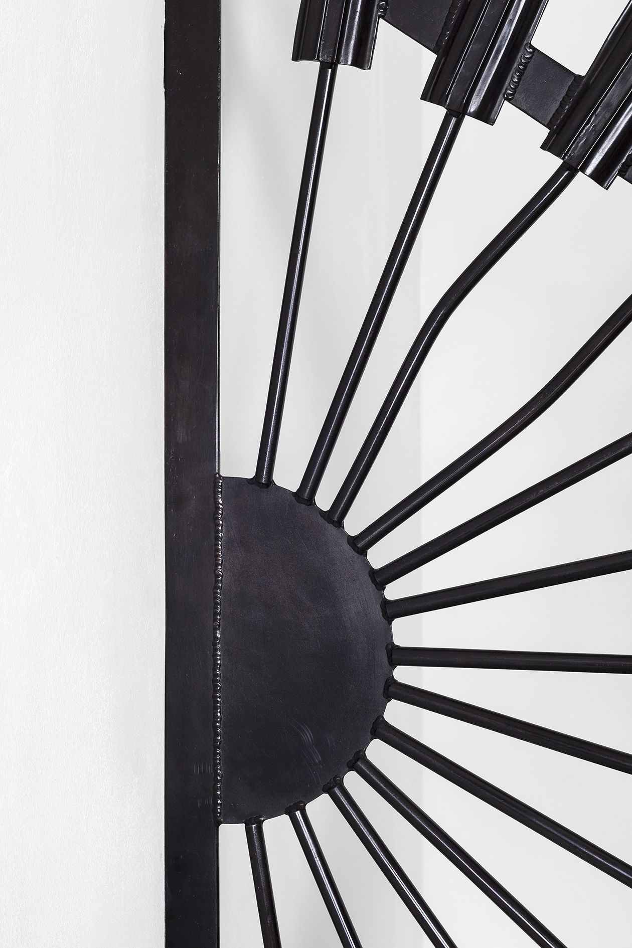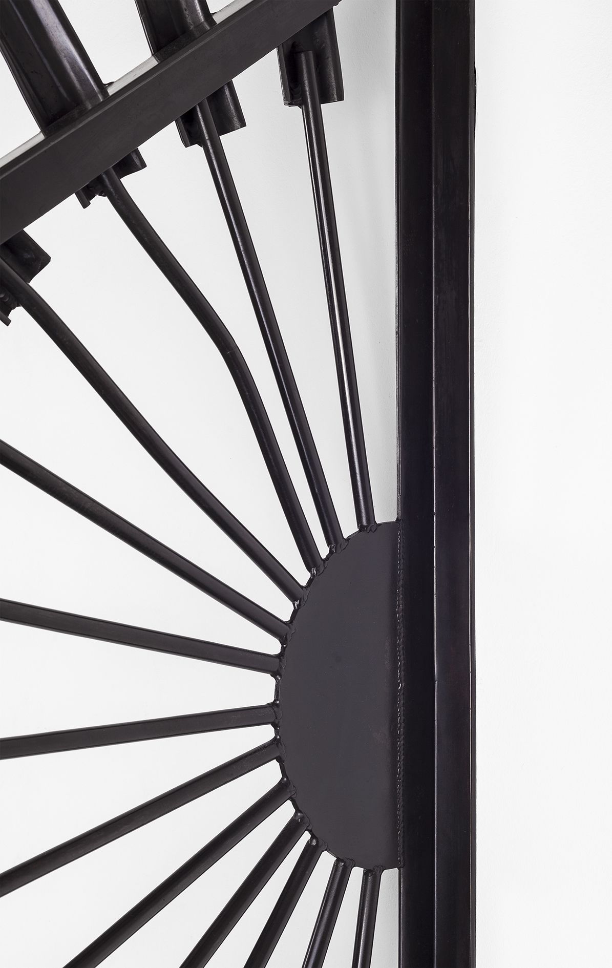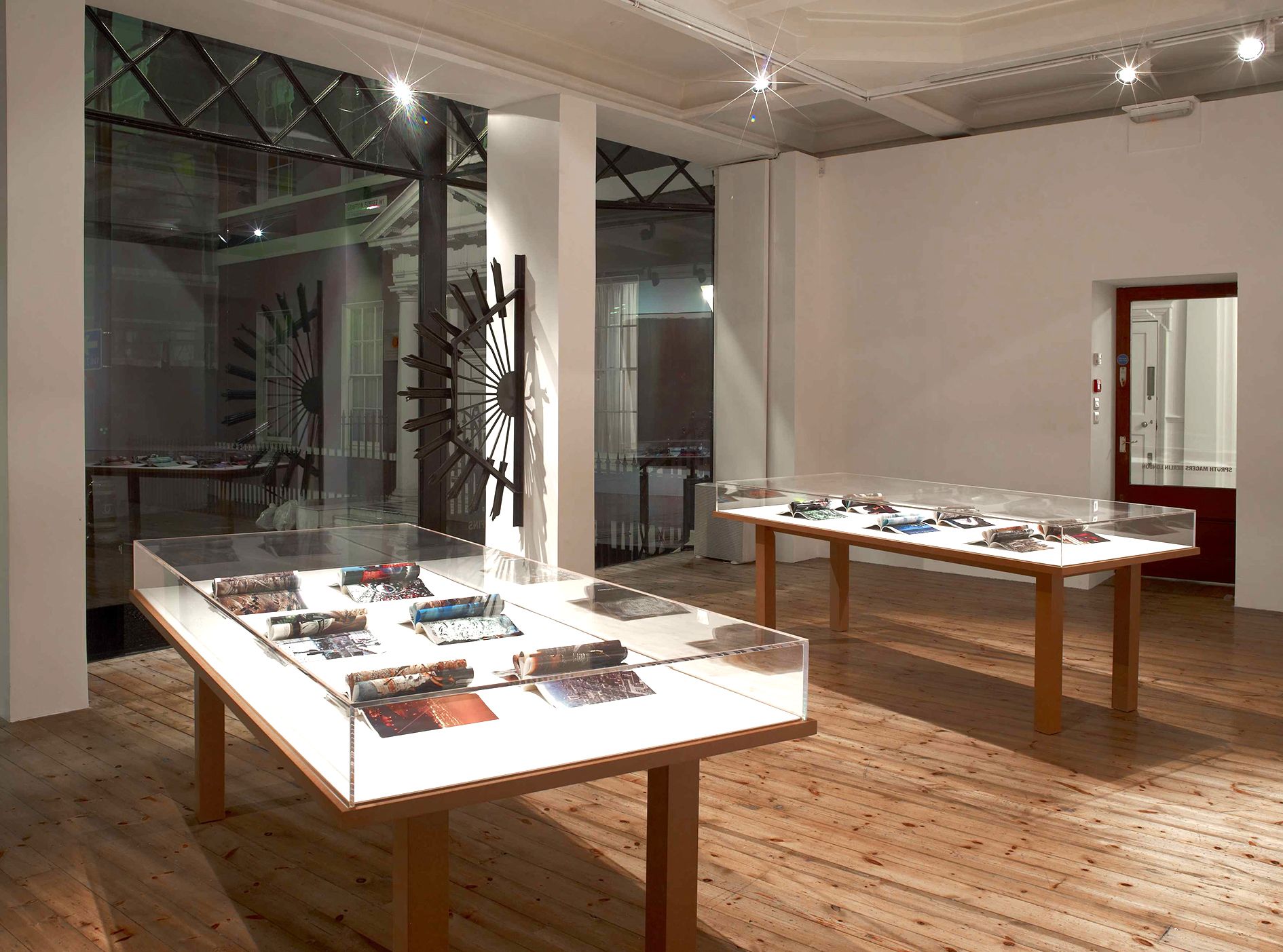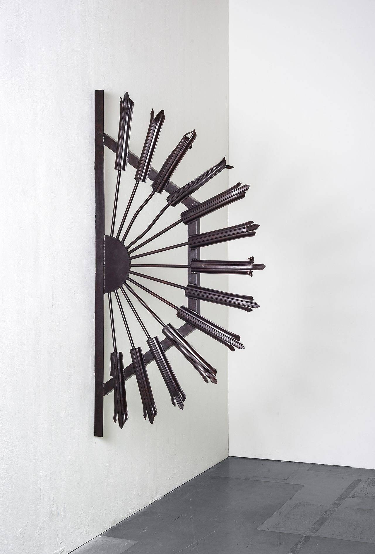 Fence (after Owen Luder) (2013) is a bronze replica of a security structure that Gaillard retrieved from the wreckage of Luder’s Trinity Square car park, Gateshead. Placed on a column in the gallery, Gaillard transforms a throwaway fragment of Brutalist architecture into a strange metallic flower, its rays and petals curled and bent, showing all the damage the object sustained when the building was slowly crushed to the ground in 2010. This ambiguous sculpture – half ornament, half threat – seems to protect the contents of the gallery and advertise its presence at the same time. Yet it is also infused with loss. Luder, once the president of RIBA, has lived to see almost all of his buildings destroyed. As Tom Morton writes in his catalogue essay, ‘Fence (after Owen Luder) is a sculpture that is preoccupied with rising and falling, with dawns and with dusks. The original sunburst of palisade fencing was put in place to prevent Tyneside kids scaling the car park’s façade as though it were an urban Everest, a building that perhaps more than any other spoke of a brief, hopeful morning in which Modernist mountains rose up from Britain’s conservative soil.’