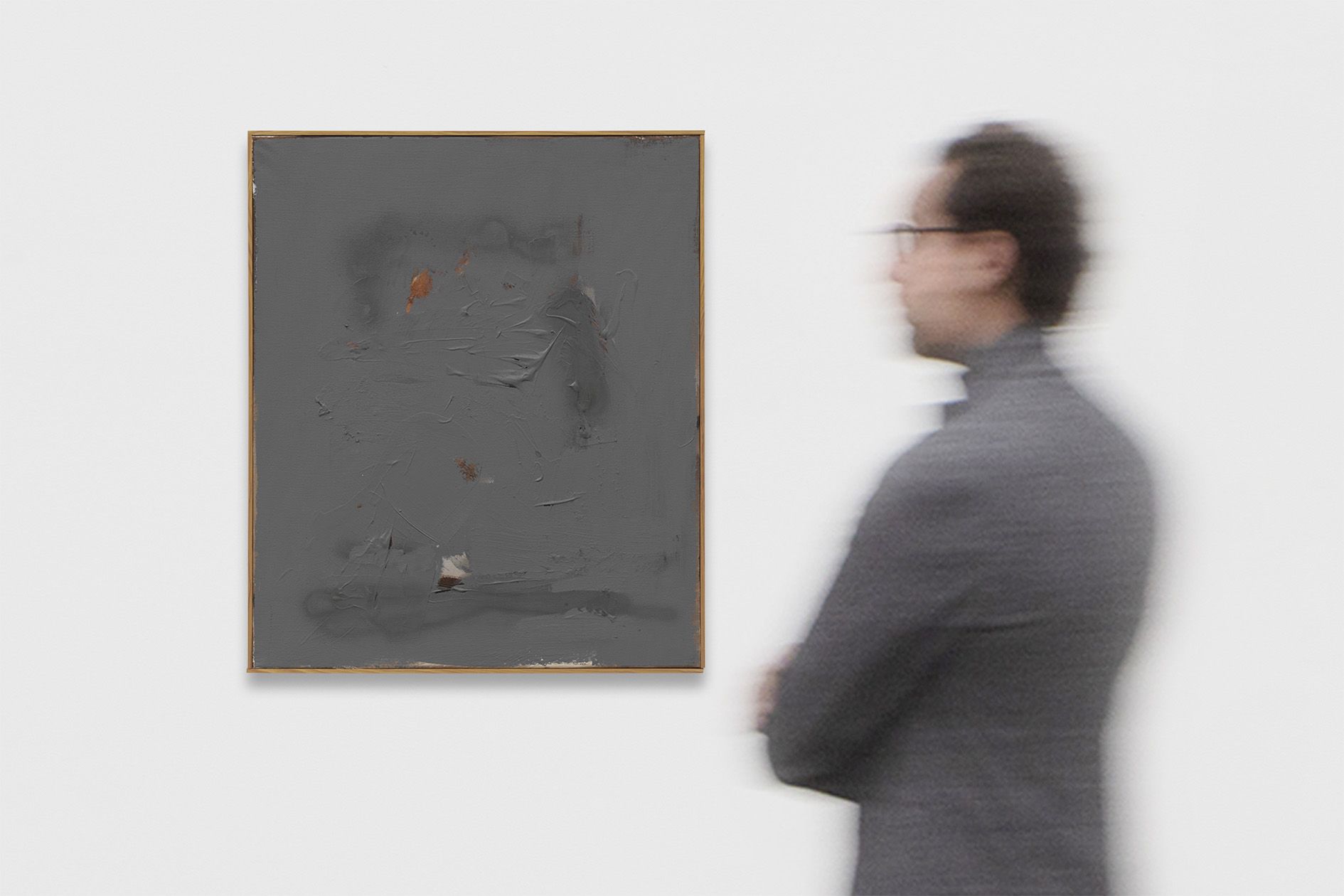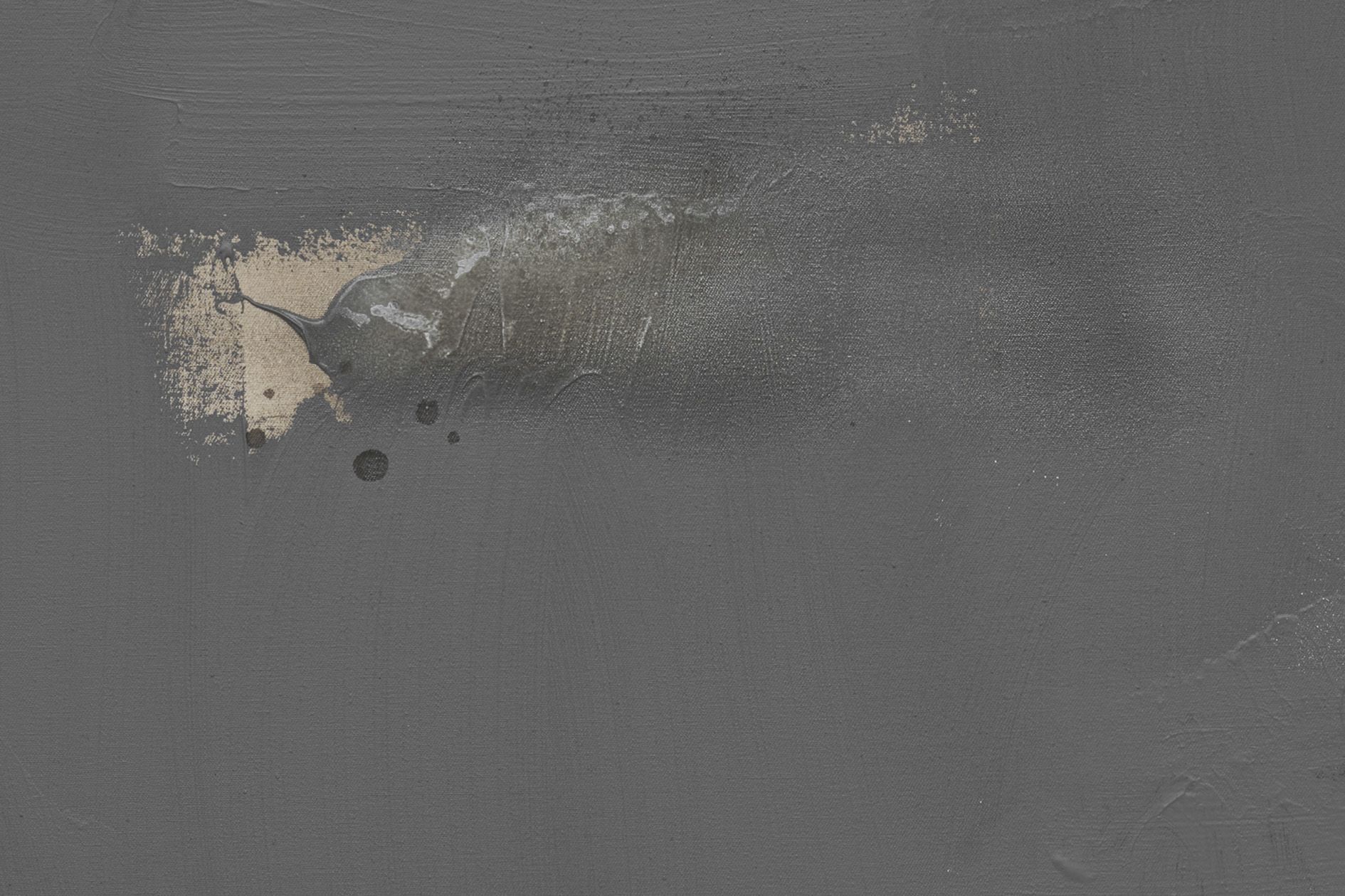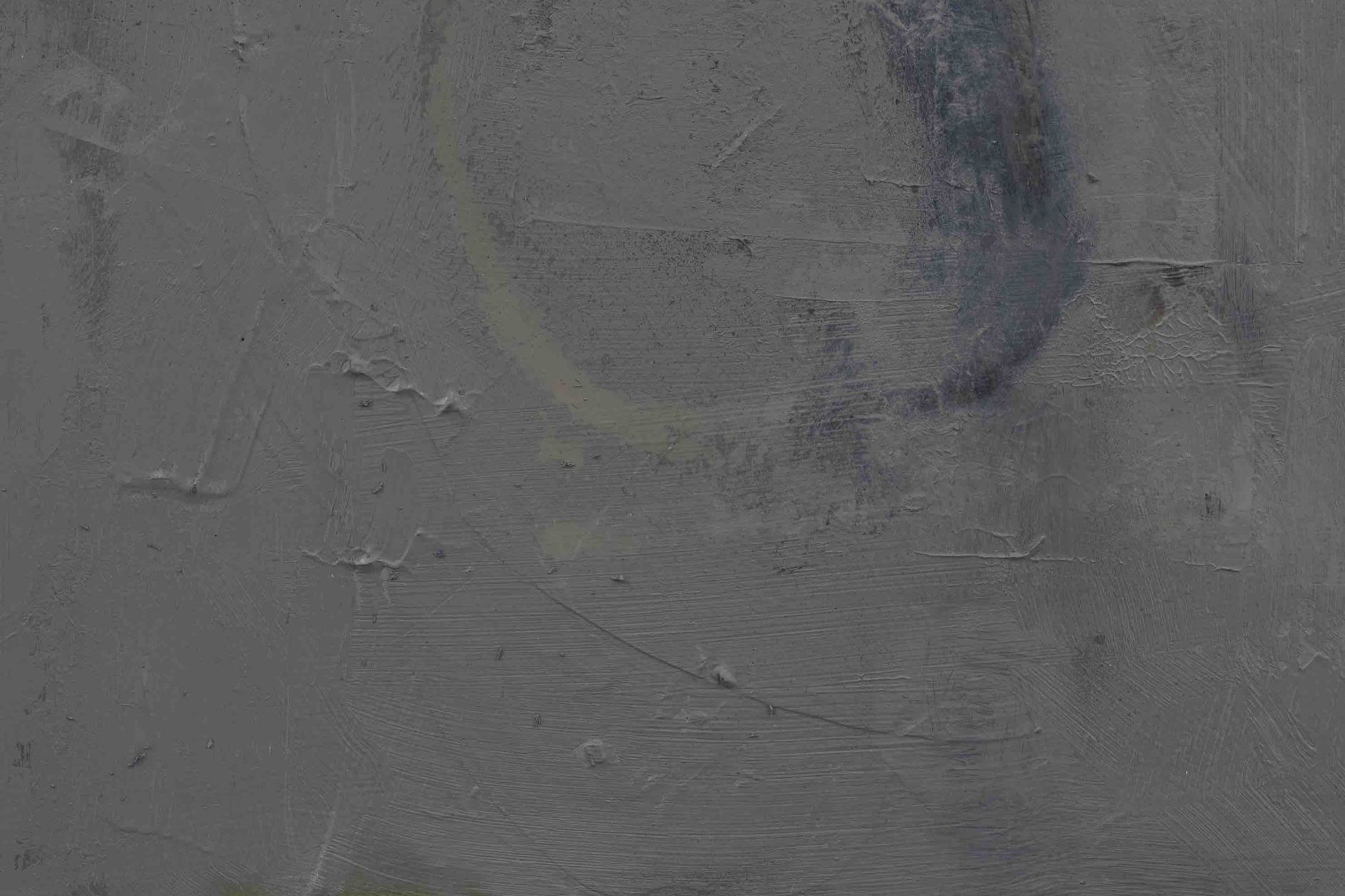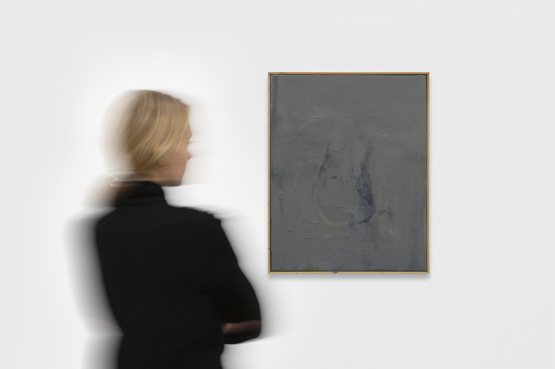 The revealed underpainting becomes something of a window that both enables a peek behind the gray façade and underscores the sense of depths. It lends the work a certain three-dimensionality, and creates moments in which the surrounding space come to bear in the composition.