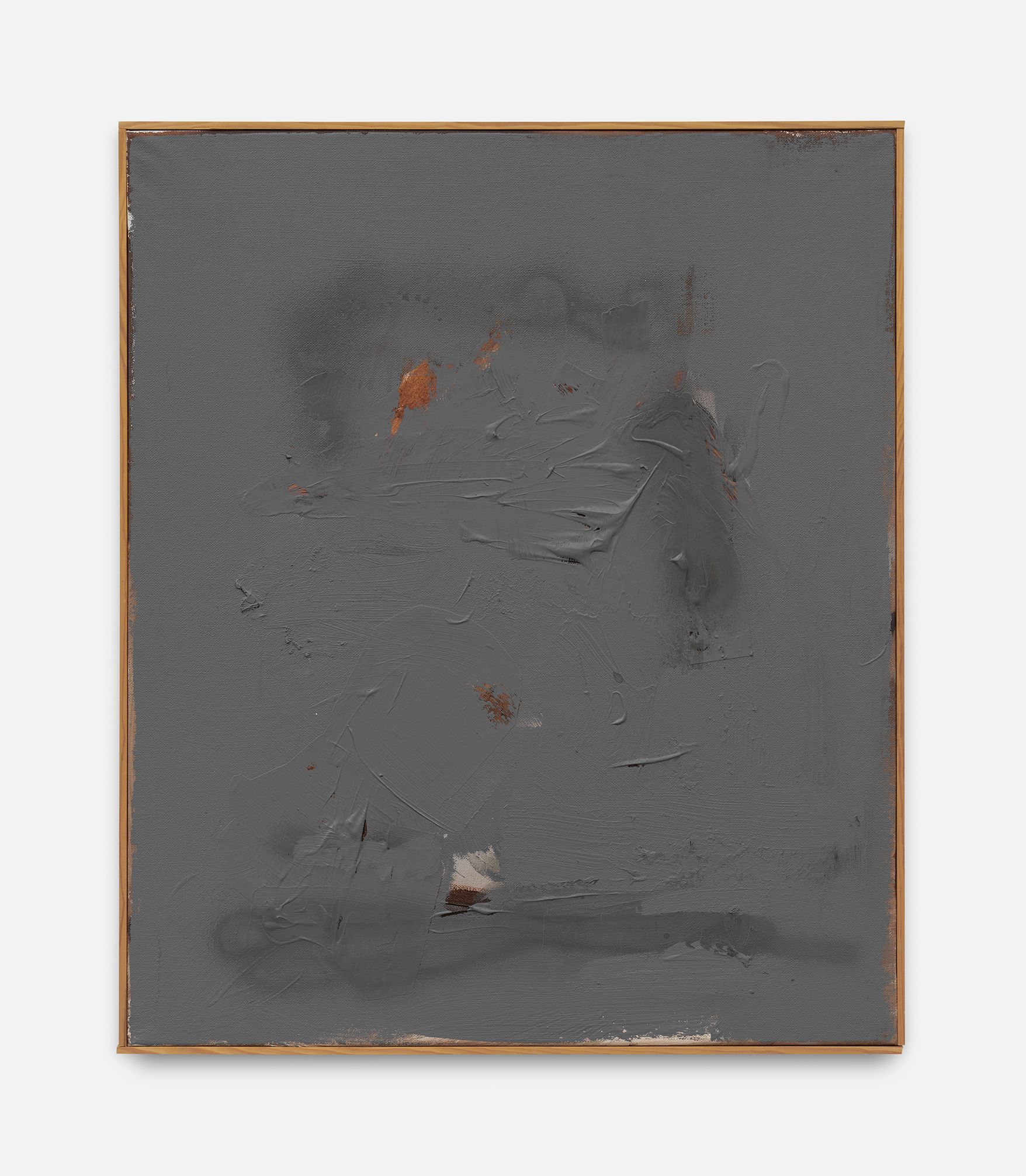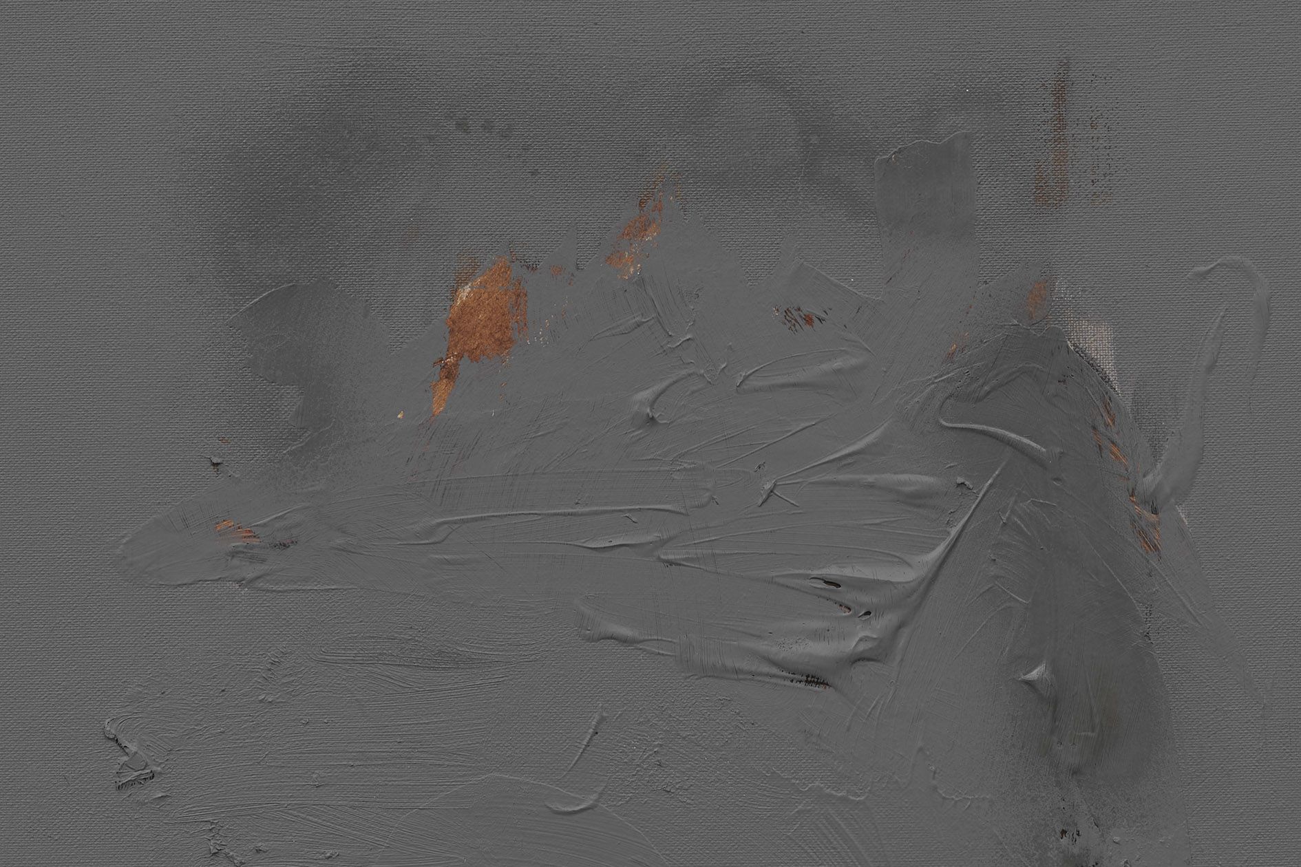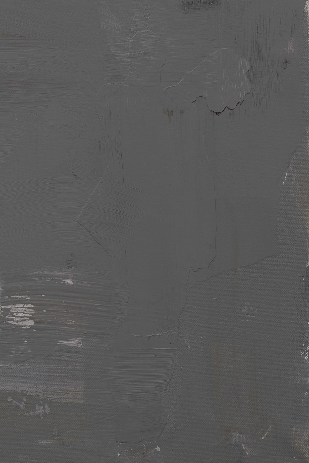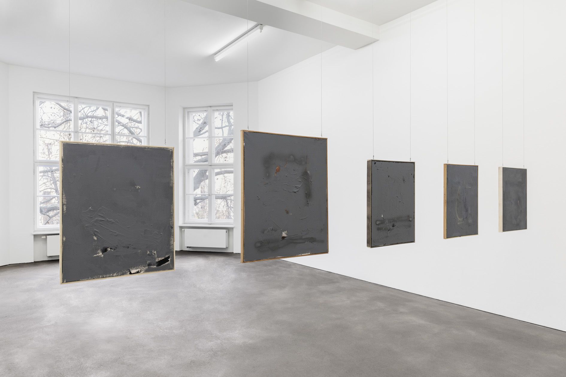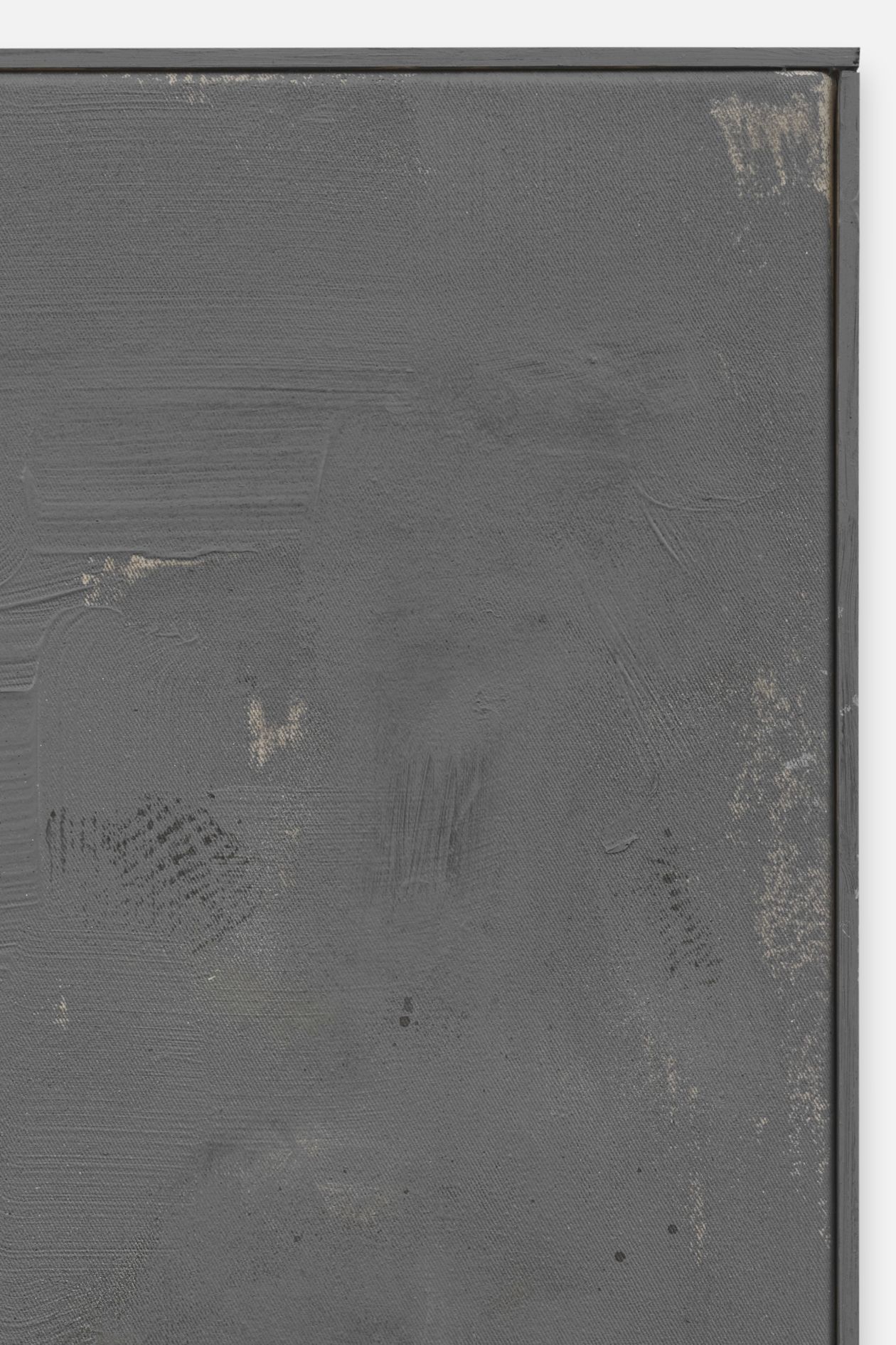 The revealed underpainting becomes something of a window that both enables a peek behind the gray façade and underscores the sense of depths. It lends the work a certain three-dimensionality, and creates moments in which the surrounding space come to bear in the composition.