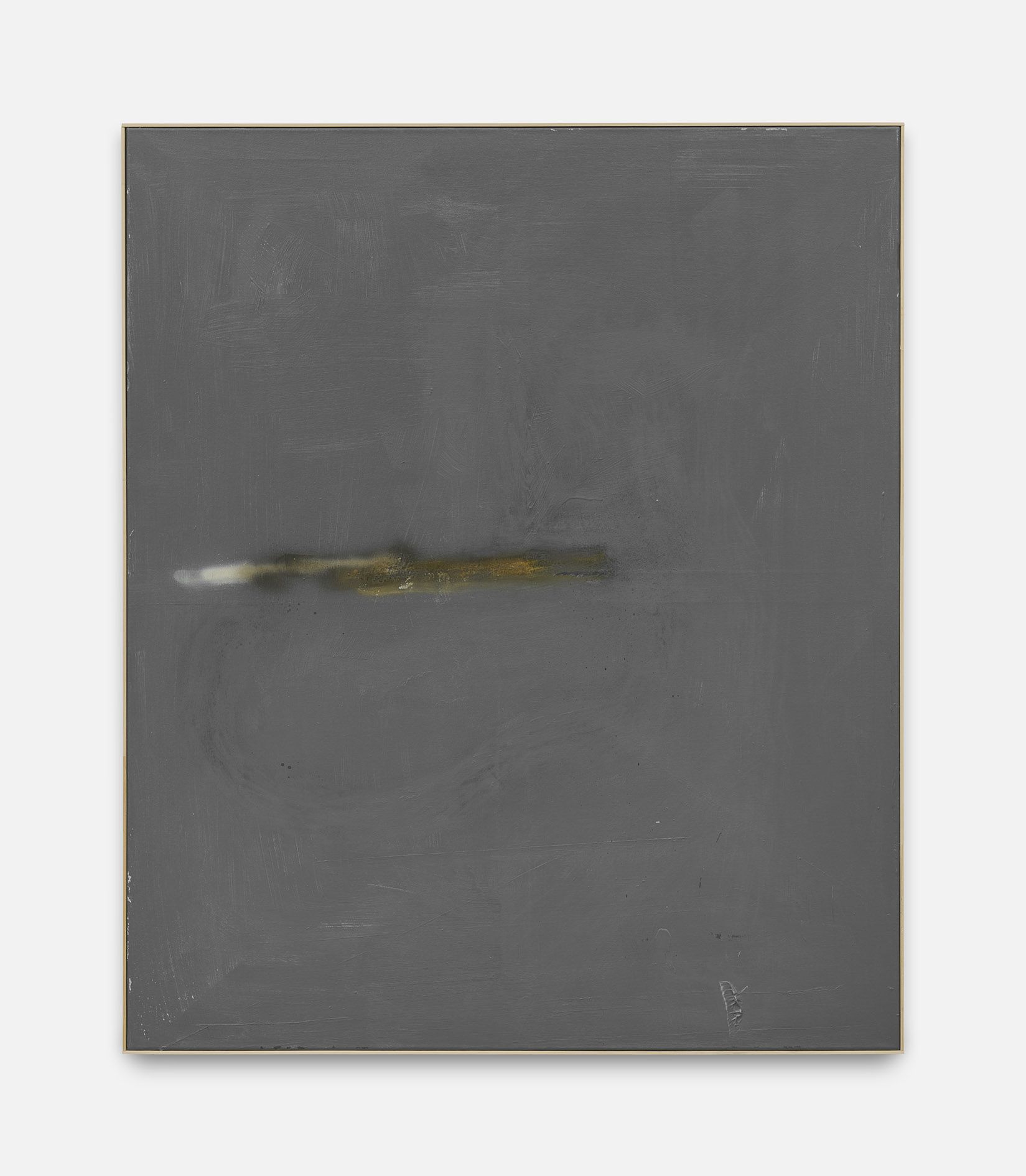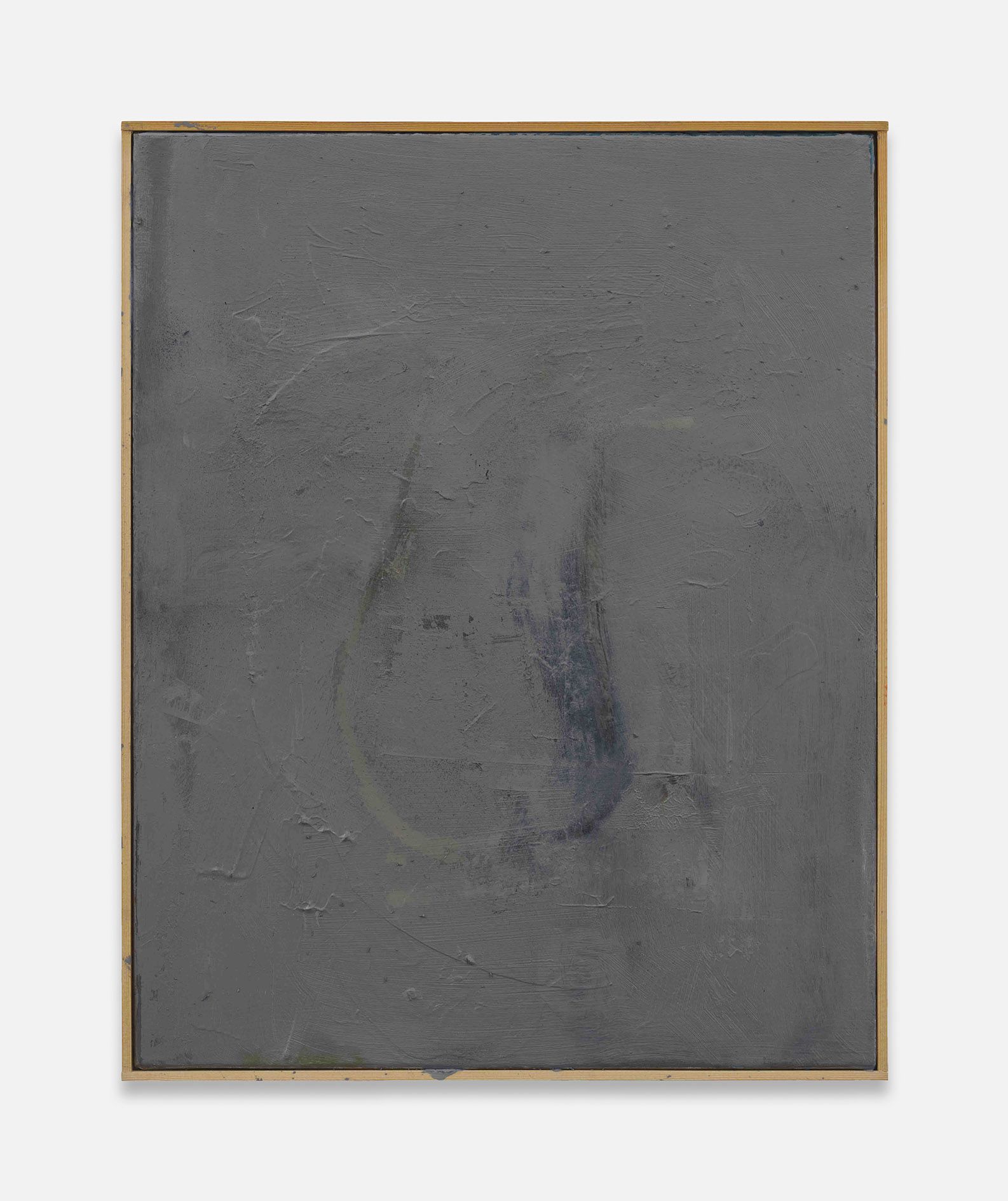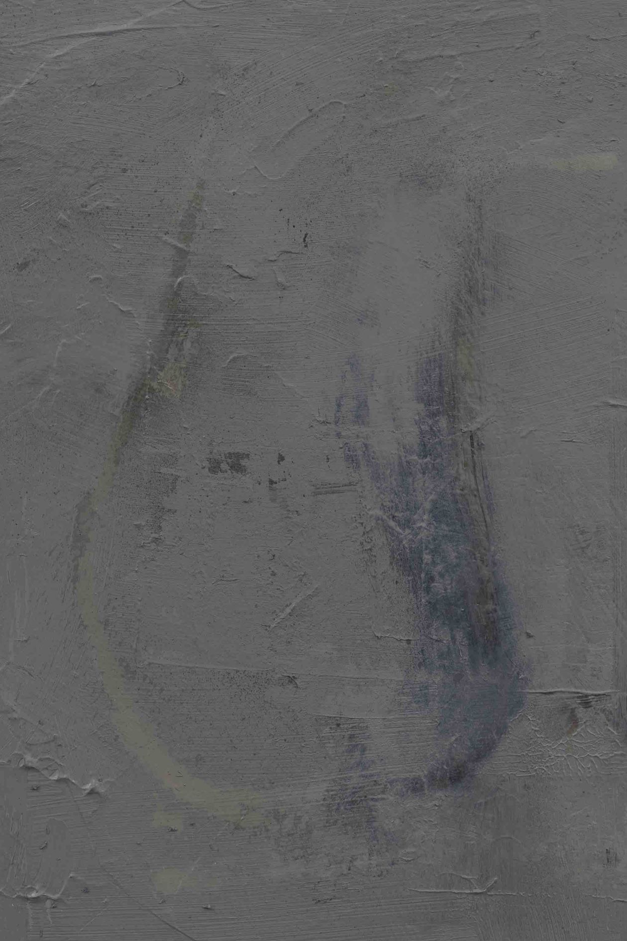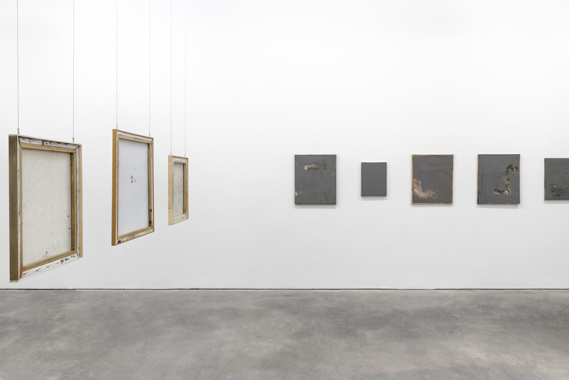 The revealed underpainting becomes something of a window that both enables a peek behind the gray façade and underscores the sense of depths. It lends the work a certain three-dimensionality, and creates moments in which the surrounding space come to bear in the composition.