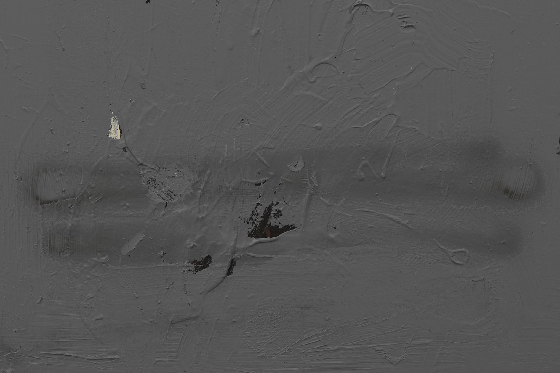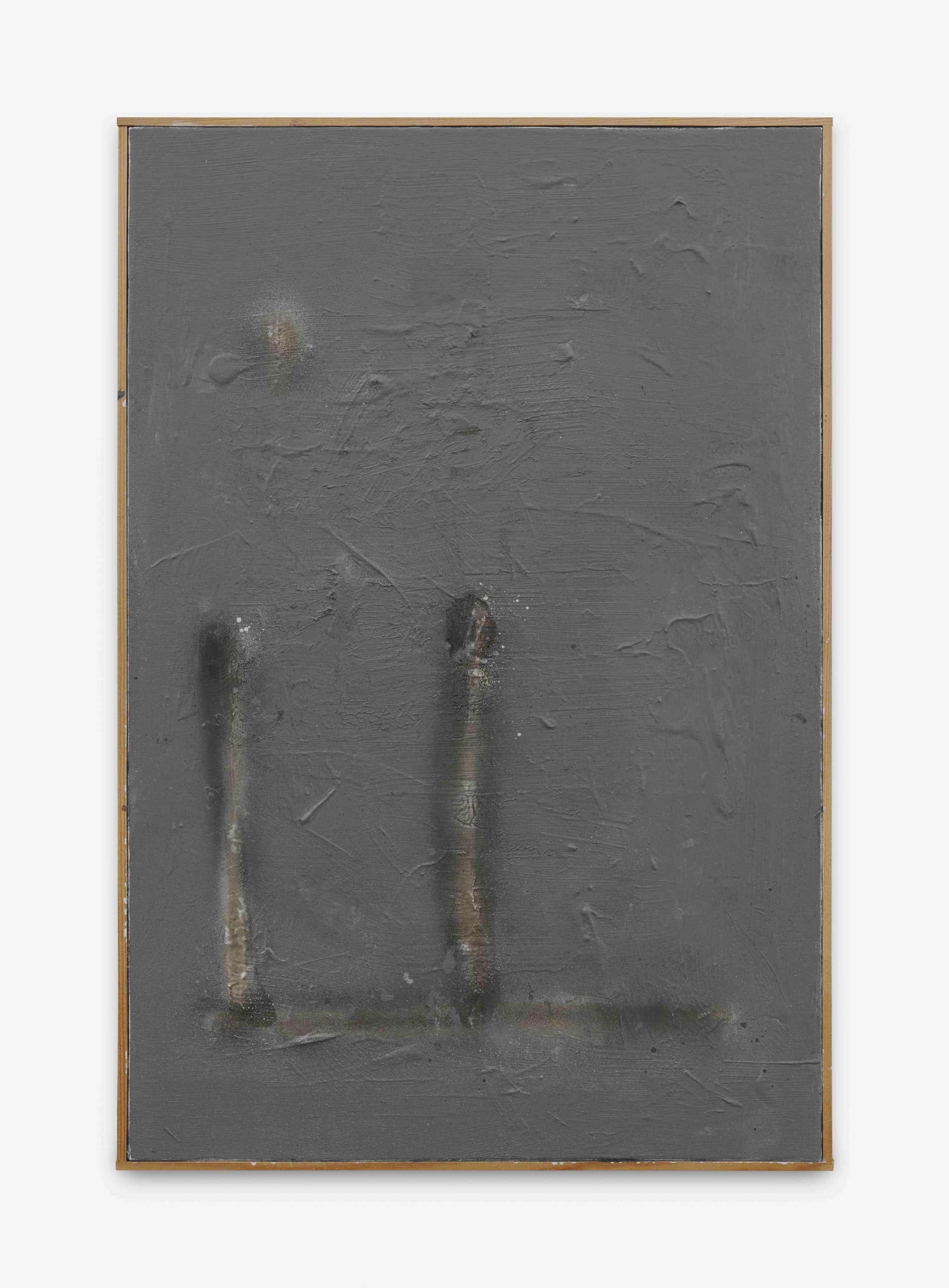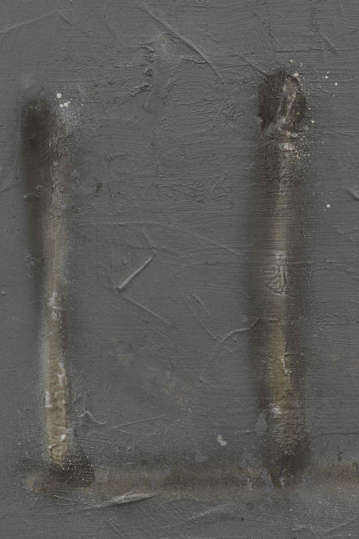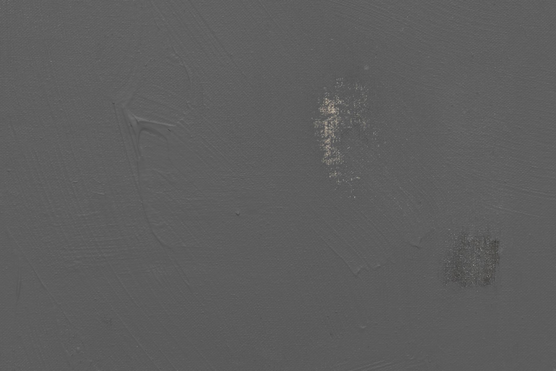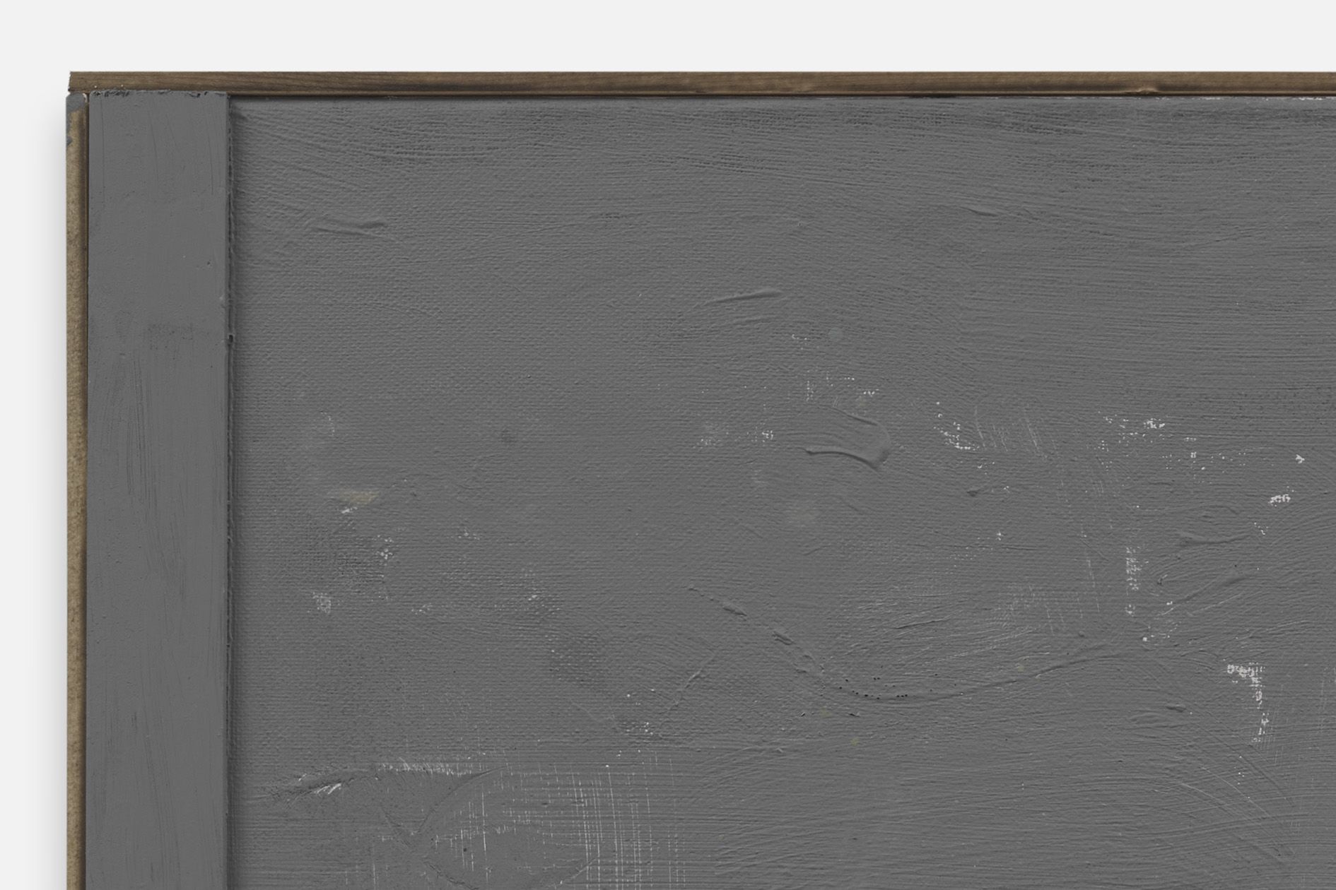 The revealed underpainting becomes something of a window that both enables a peek behind the gray façade and underscores the sense of depths. It lends the work a certain three-dimensionality, and creates moments in which the surrounding space come to bear in the composition.