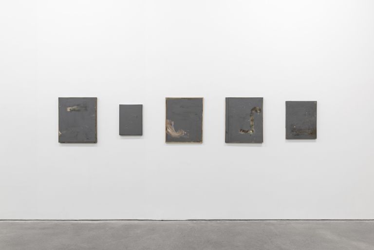 What might at first glance appear to be a monochrome surface is upon closer inspection multi-layered and complex. Copious layers of paint are applied to differently sized, but mainly rather small canvases – some new, some reused.