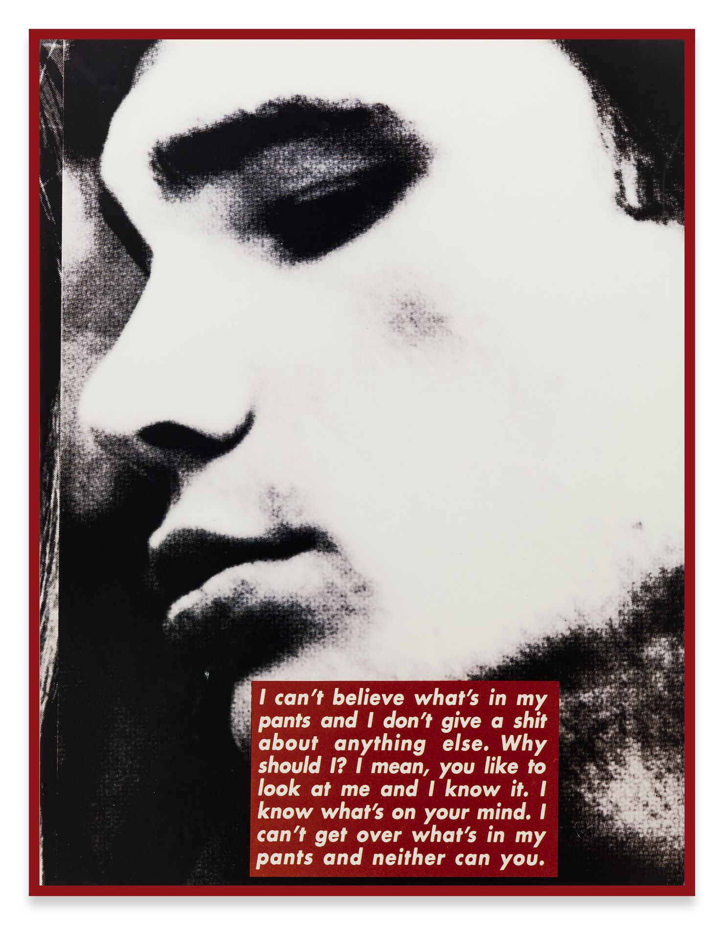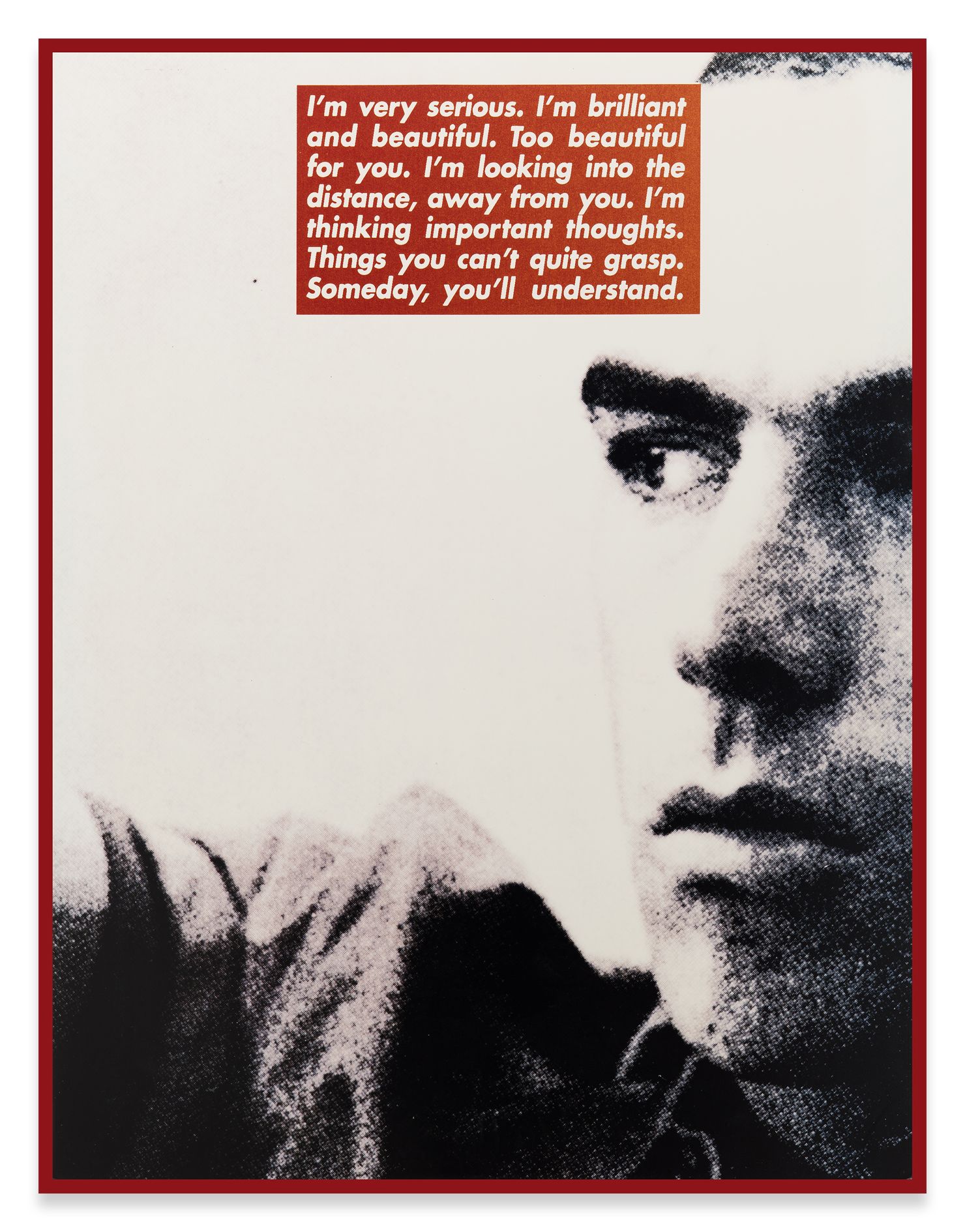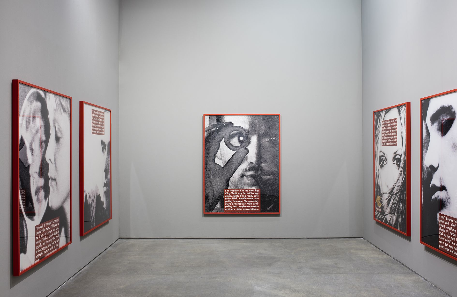 In 1996, Barbara Kruger produced a series of grainy black-and-white prints as templates for a project in the British magazine Dazed & Confused. These full-page portraits also featured vibrant red text boxes that appear to reveal the thoughts of the depicted person. The original prints are exhibited here, in a new order that the artist revised for the exhibition.