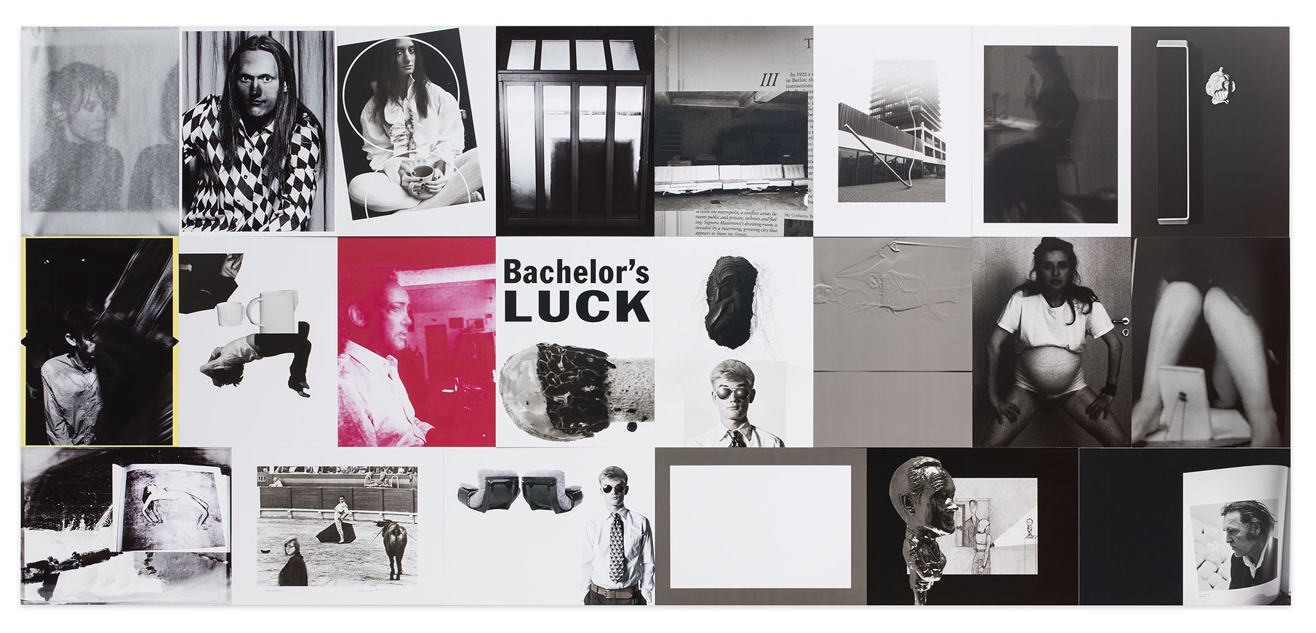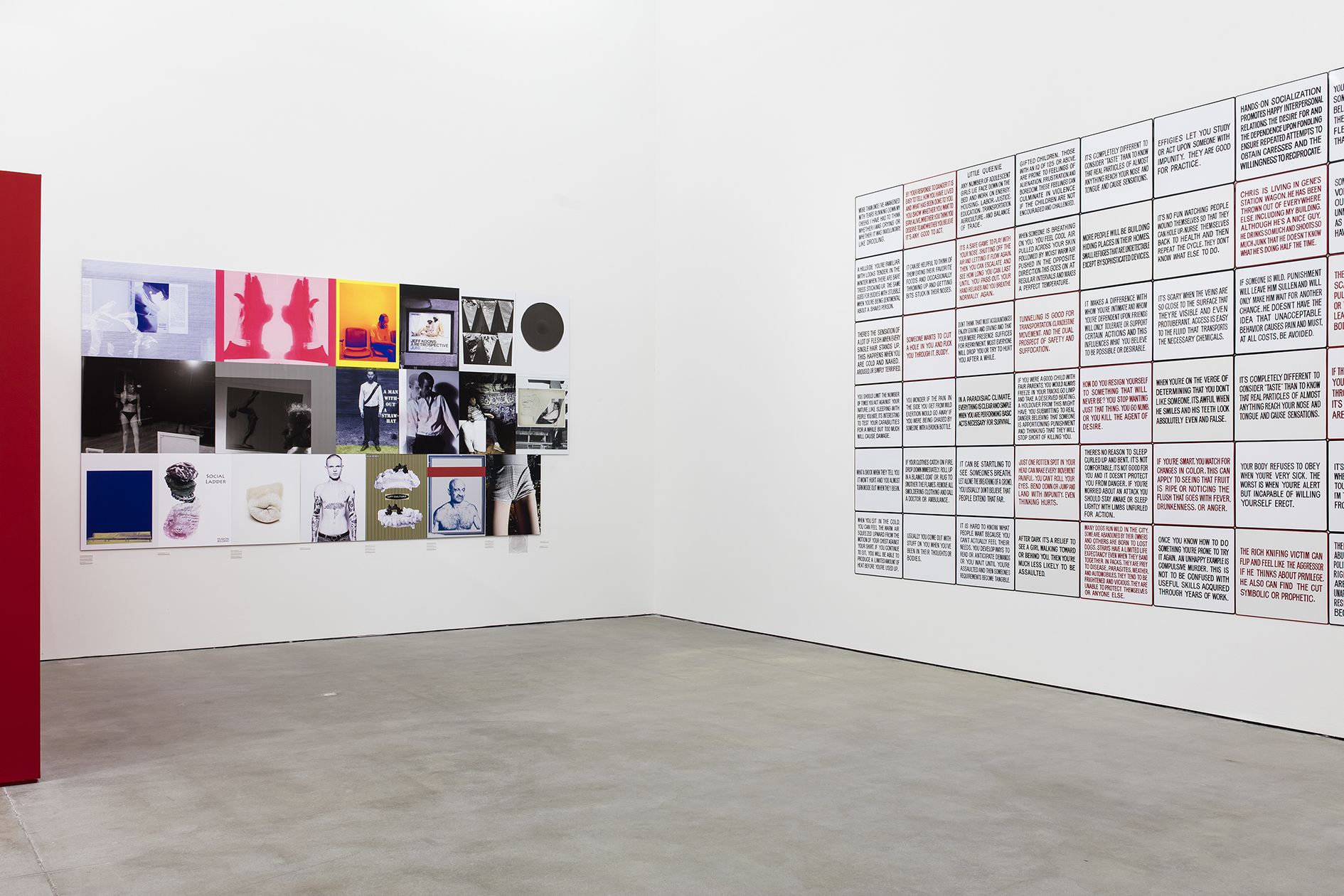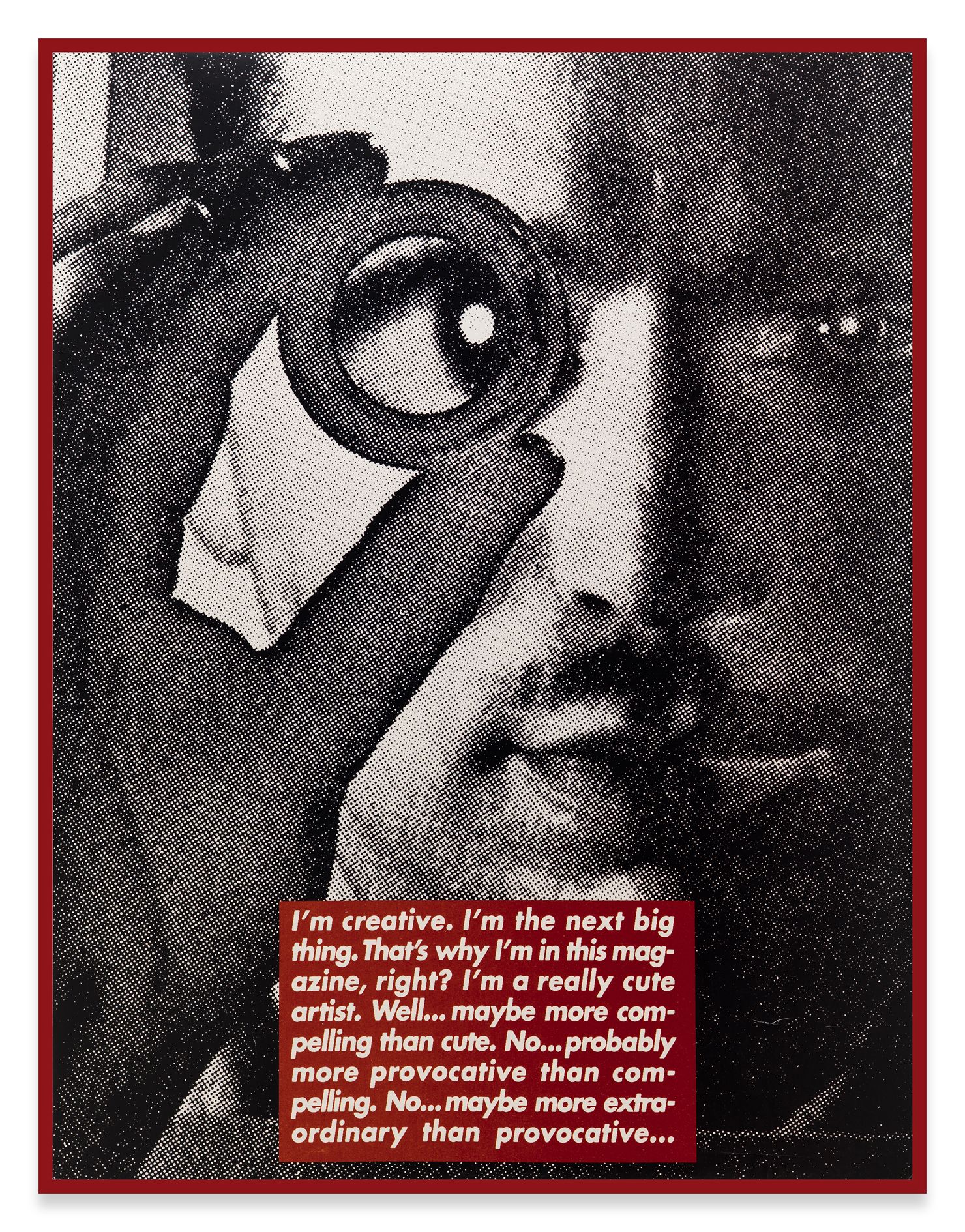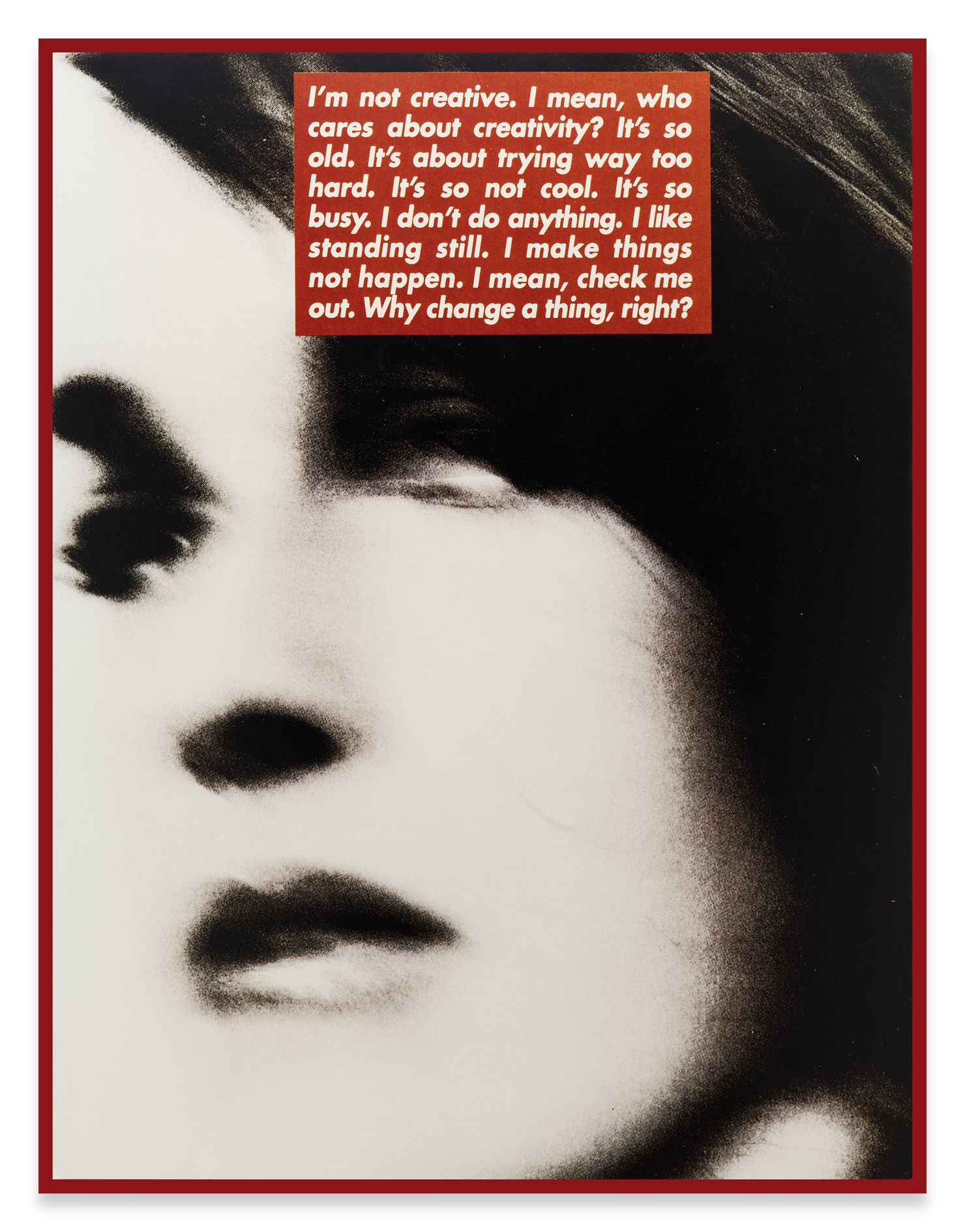 In 1996, Barbara Kruger produced a series of grainy black-and-white prints as templates for a project in the British magazine Dazed & Confused. These full-page portraits also featured vibrant red text boxes that appear to reveal the thoughts of the depicted person. The original prints are exhibited here, in a new order that the artist revised for the exhibition.