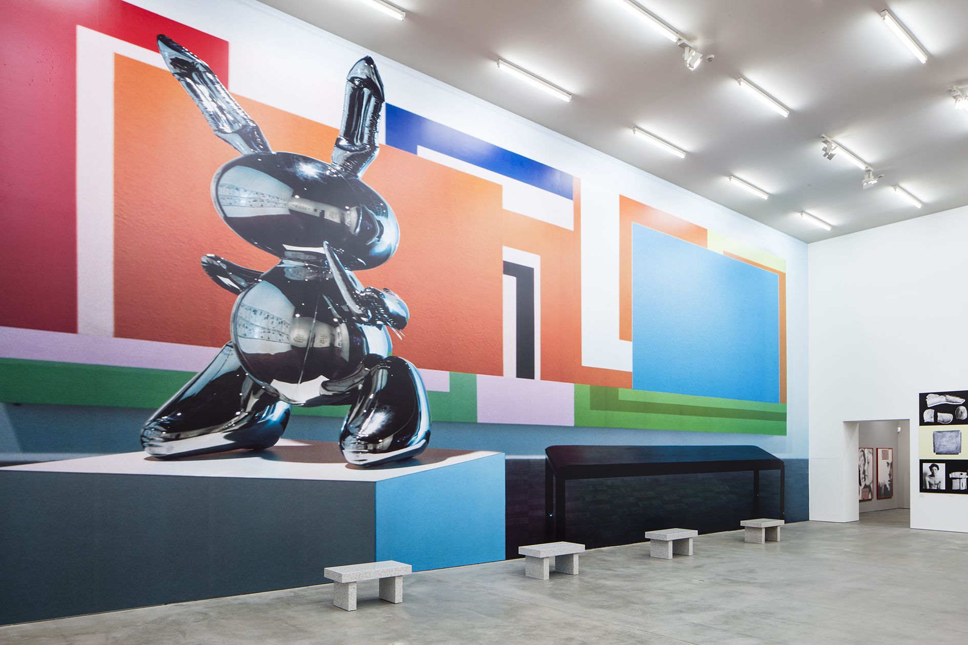 Perspectives and viewpoints have always been key to the work of Louise Lawler, and never more so than in the 'adjusted to fit' works, where she remakes existing works as wall vinyls, expanding them to the available architecture and wall space. (Bunny) Sculpture and Painting (adjusted to fit) (1999/2015) shows a view in the Whitney Museum of Jeff Koons’ Rabbit (1986) and Peter Halley’s The Acid Test (1991-92).