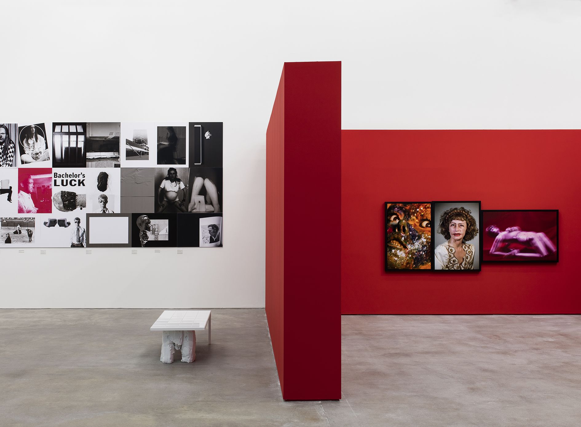 Shown this year at the Kunsthaus Bregenz, Rosemarie Trockel divides her prints into three major groups, calling each selection of motifs and forms a 'CLUSTER'. She has created a new set of combinations for the exhibition. Emerging from snapshots of her daily studio life as well as images that reference her own past artworks, she carefully combines these pictures with images of artists, friends, historic figures and events. The resulting groups of digitally altered images conjure a diverse range referential systems and ideas. Tisch 7 (2008), exhibited amongst the prints, is a white ceramic table with two thick, human-shaped legs that evoke the limbs of a kneeling figure.