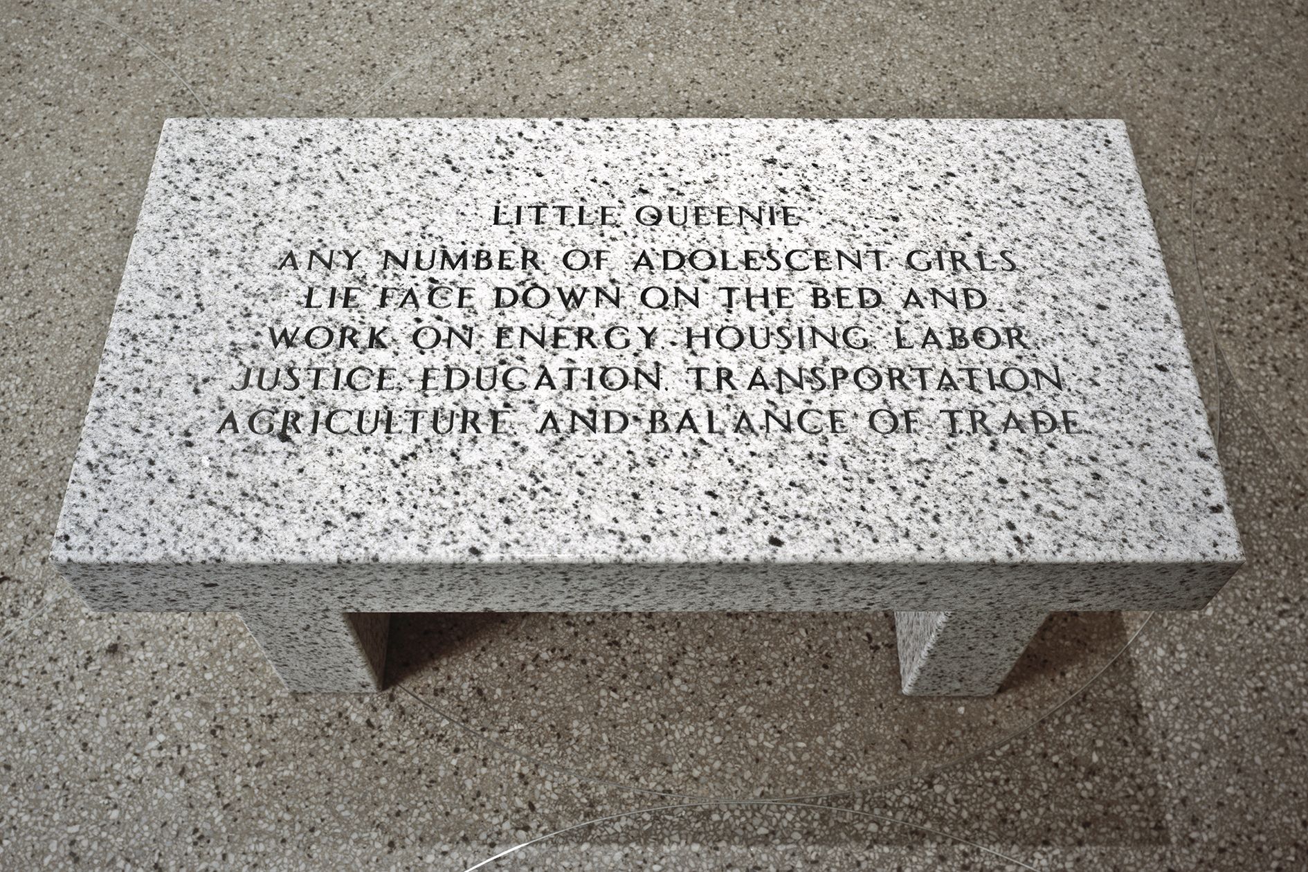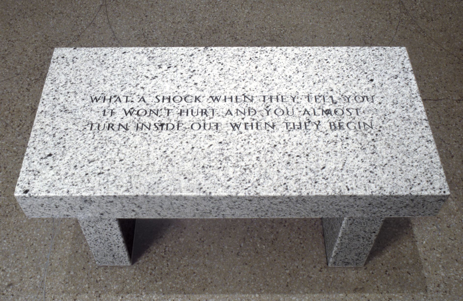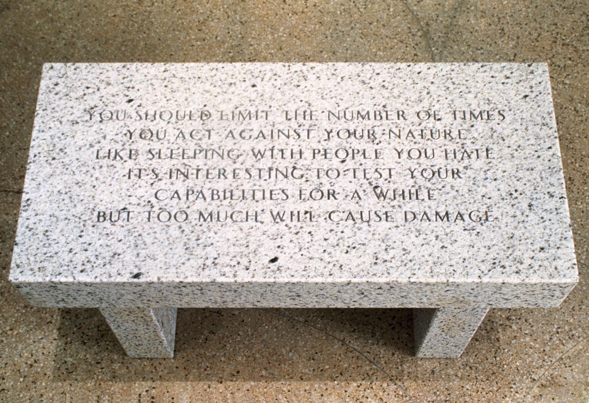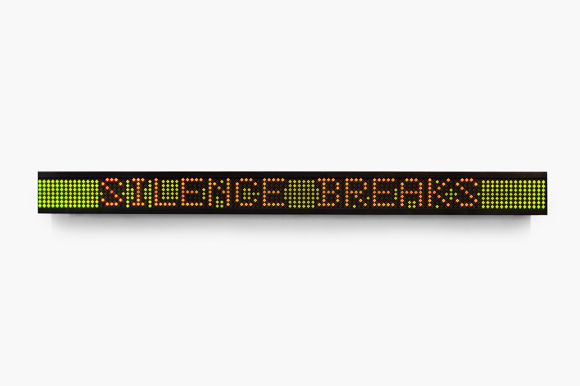 The 60 hand-coloured enamel plaques by Jenny Holzer were created in parallel to her Living series, between 1980 and 1982, and are shown here as a large, coherent block. The square white plaques contain red and black text, written in the tone of a factual report, with observations, hints or warnings about the perception of the body, oneself, relationships, people and landscapes, rules, expectations, and everyday desires and fears. These texts also appear inscribed on granite benches, which stand in a row in front of Lawler’s wall work, while also interacting with Trockel’s ceramic table. The LED, with its black casing and green and red text, belongs to the series Under a Rock (1986). This series outlines the effects of the era’s escalating militarism, and the machismo that fuels that escalation.