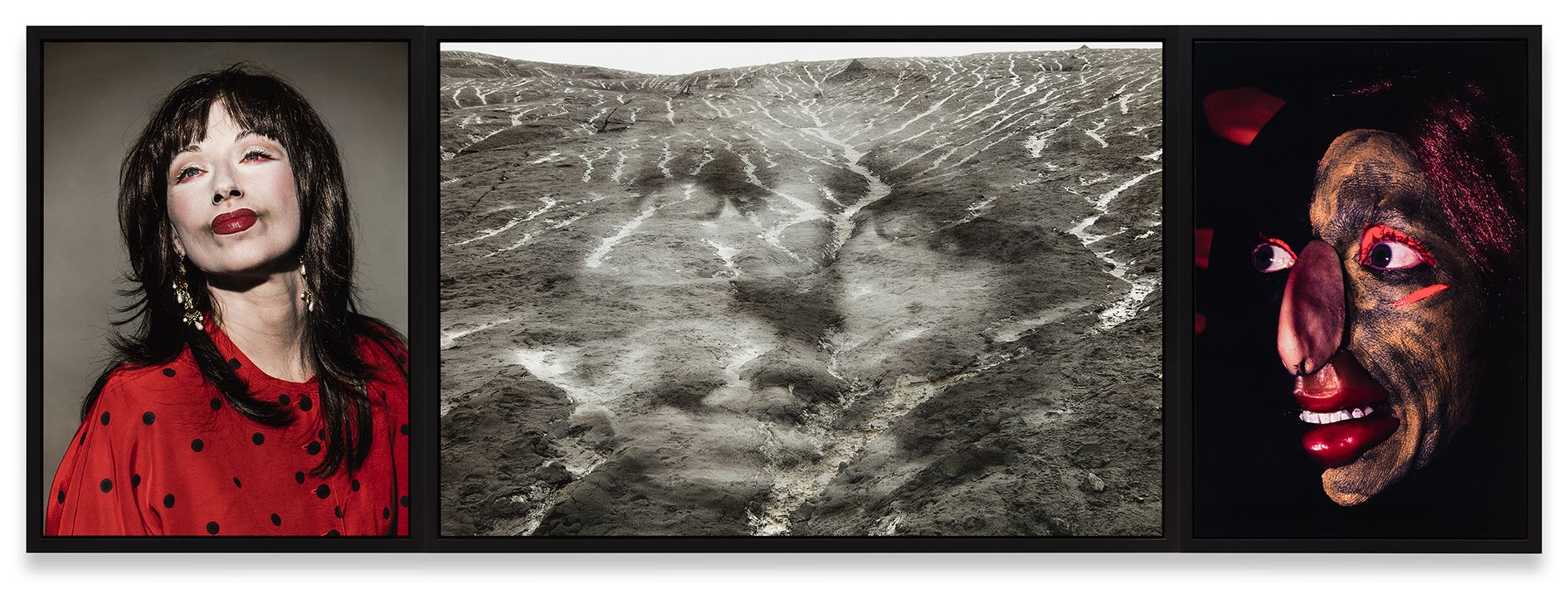 Cindy Sherman often uses abrupt shifts in composition to create a mood of disquiet, a practice she has expanded for a new body of photographs. Adapting unpublished images from previous series, the artist constructs new multi-image or multi-panel works. Sherman’s interest in the bizarre and grotesque achieves particular intensity here, where she revisits the tightly clustered hang approach of her travelling exhibition Untitled Horrors (2013/2014).