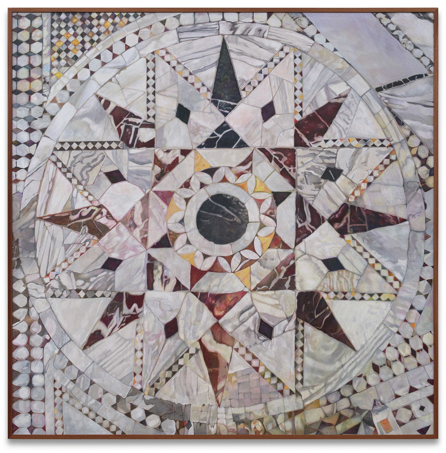 Drawing constitutes a fundamental aspect of Porras-Kim’s practice, wherein her intricately detailed images serve as a way to examine and reconsider historical objects and their contexts. On the gallery’s ground floor hang two colour pencil drawings depicting marble tiles in Ravenna, Italy. The large-scale works San Vitale, Ravenna, marble floor reconstruction (both 2025) show portions of the church of San Vitale’s marble floor, which contain generations of conservation interventions.