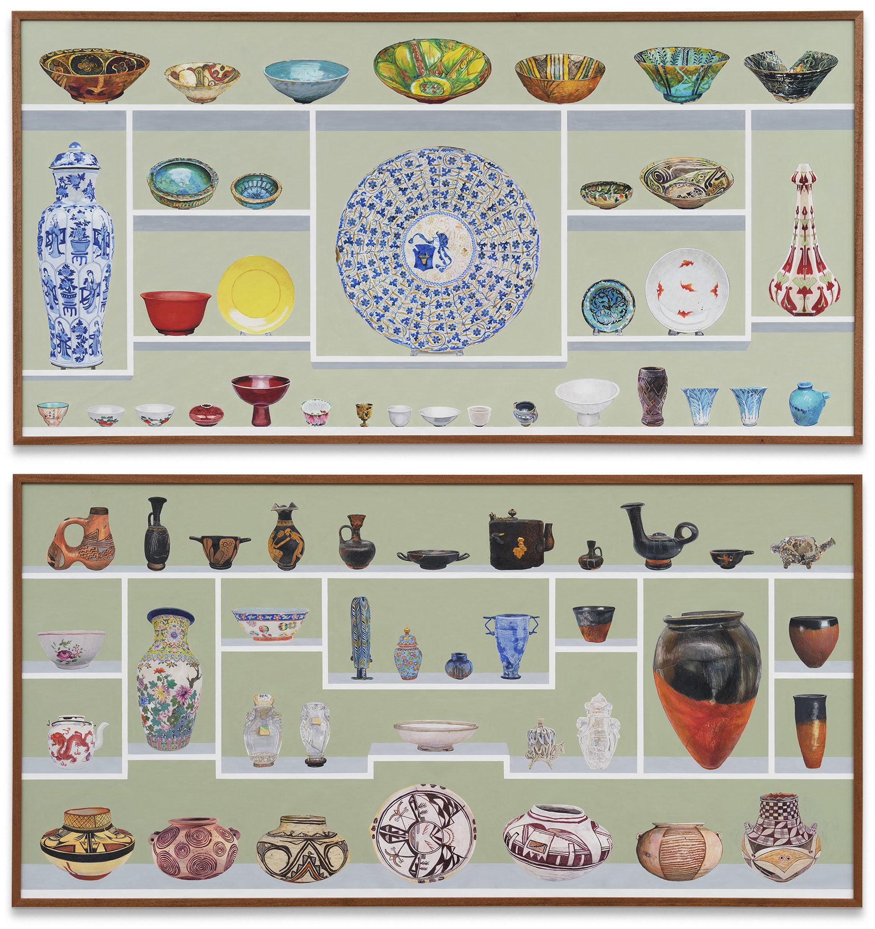 In the diptych 69 containers at Carnegie Museum of Art or at Carnegie Museum of Natural History (2025), the artist portrays vessels which are divided by their categorisation into the respective collections. These images challenge the distinctions made between ‘art’ and ‘object’, revealing how bound these definitions are to the spaces that exhibit them. 51 Snuff boxes at Carnegie Museum of Art (2025) presents snuff boxes whose function changed upon their transfer to the art museum, fundamentally altering the context in which they are read.