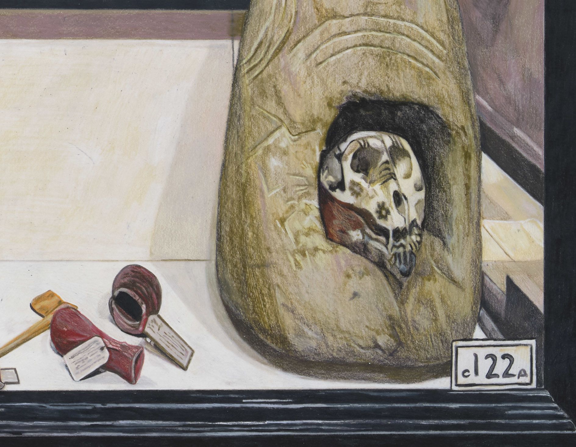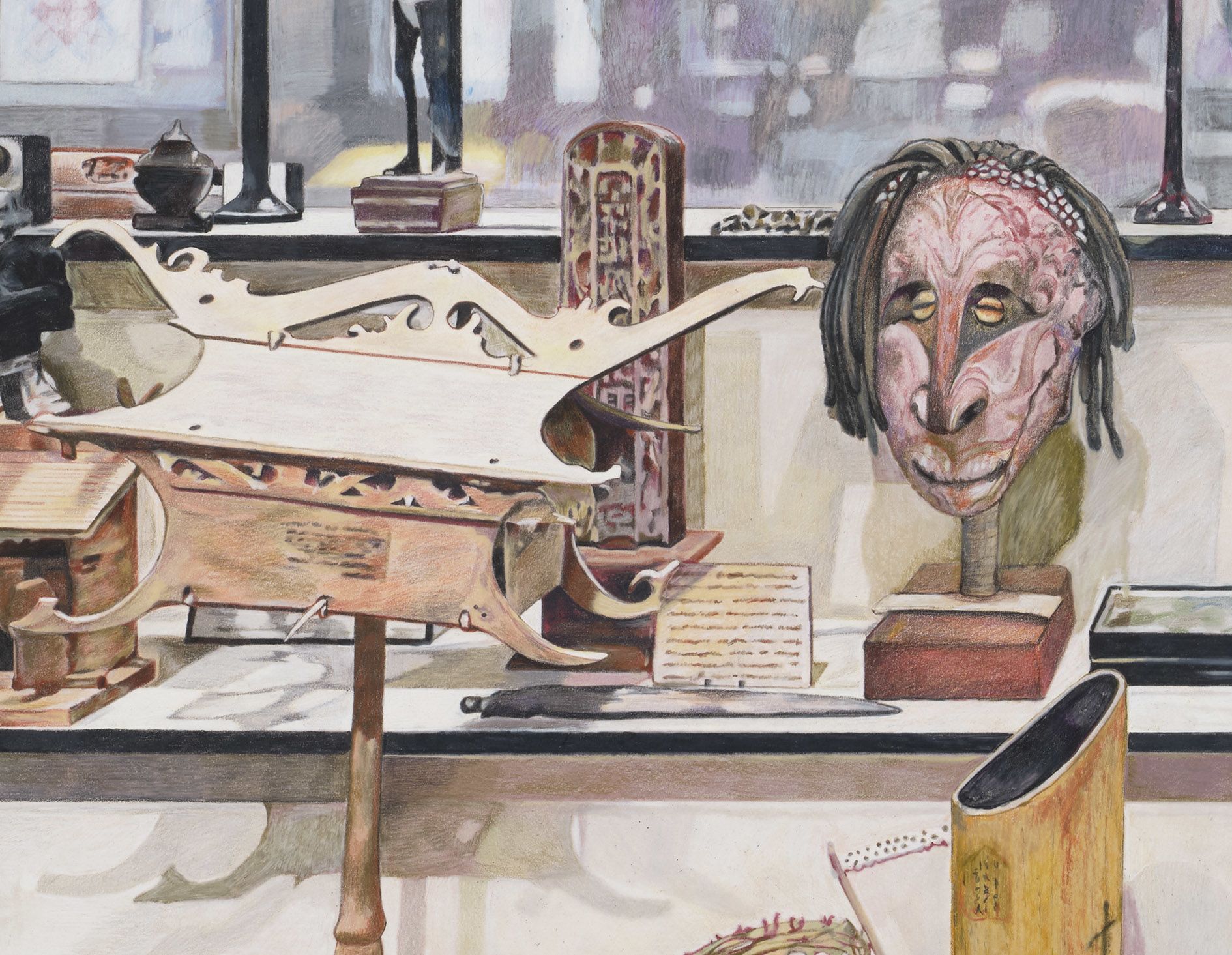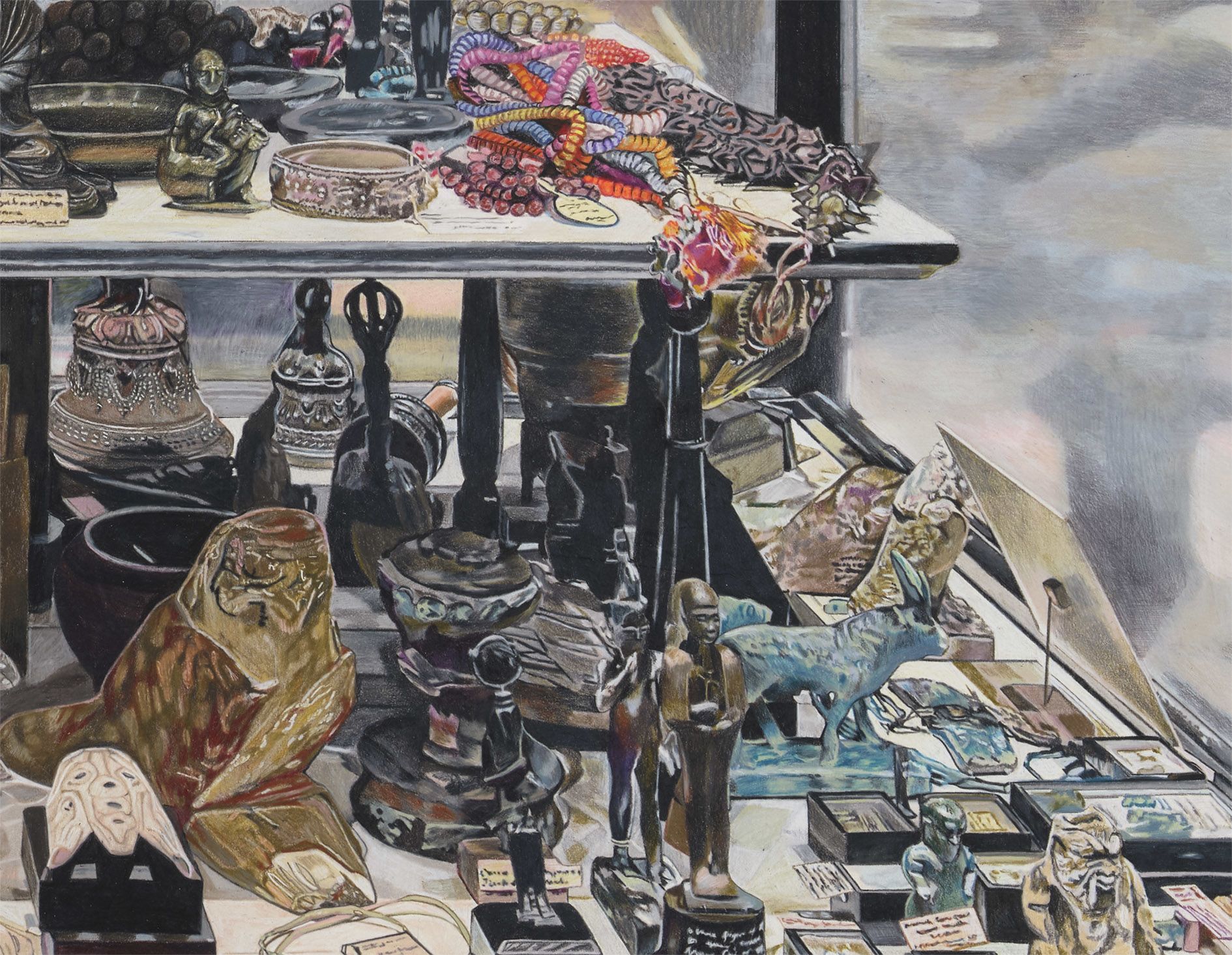Five smaller drawings concern themselves with collection drawers, which previously served as ‘overspill’ storage for items from the Pitt Rivers that are now accessible to visitors. The displayed artefacts are secured in foam cutouts that place them within a composition. 1 Drawer C.61.14 with 2 Amulets, Charms and Religious & Divination Artefacts & House Ornaments – Asia at Pitt Rivers Museum (2025) depicts two amulets bound at their necks, arms, waists and feet by black bows, securing them within their storage drawer. The remarkable image visually represents the constraints imposed upon these objects, inviting viewers to contemplate their original purpose.