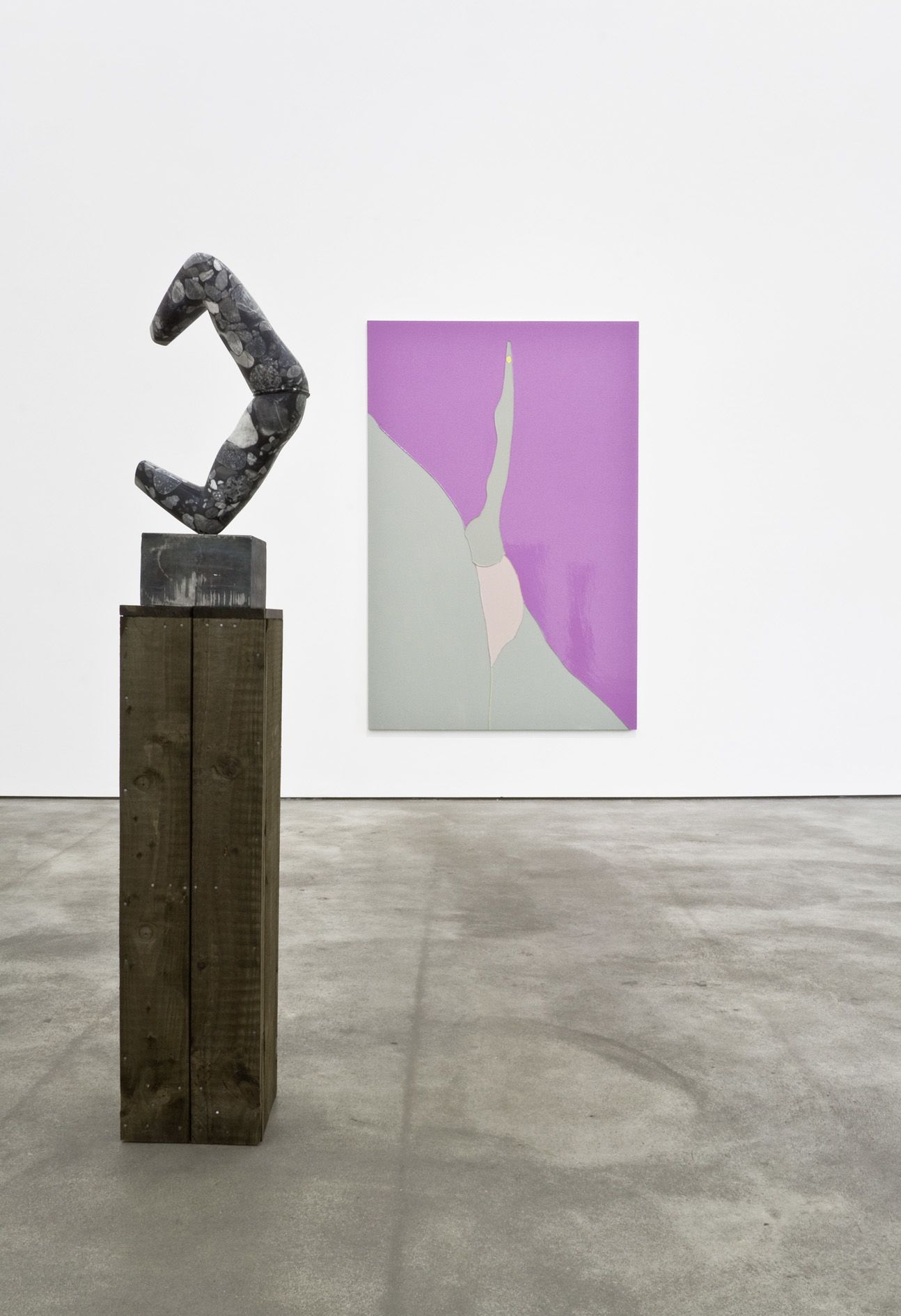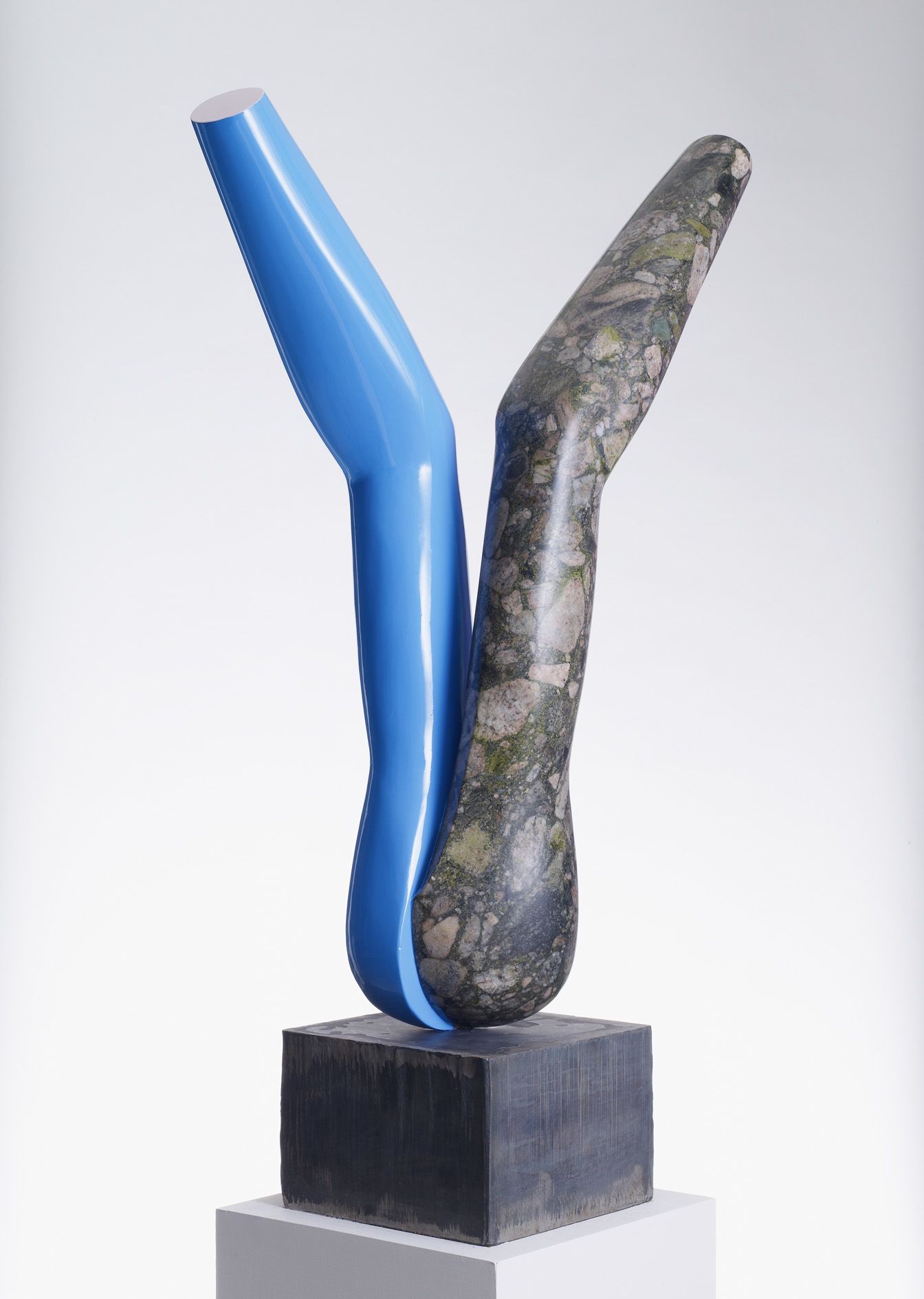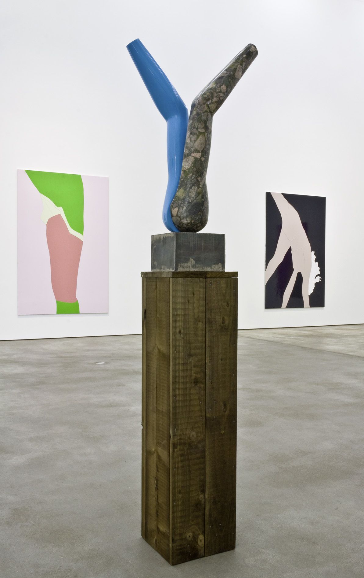 The beautifully shaped and tactile sculptures are conceived from mannequin parts, the human body in ideal universal form. Hume fuses the powerful limbs into static shapes latent with movement, and the vulnerability that their prone position conveys. Hume makes a model of the sculpture, the marble is then carved by hand and laboriously finished with sandpaper. One or more surface is covered in bright gloss paint, creating a strong contrast between materials.