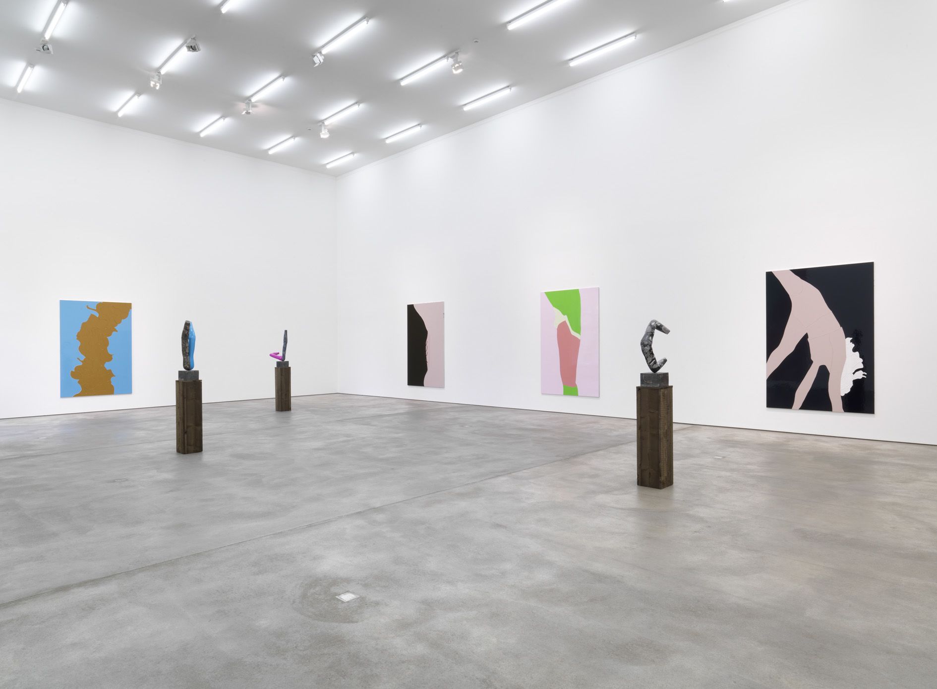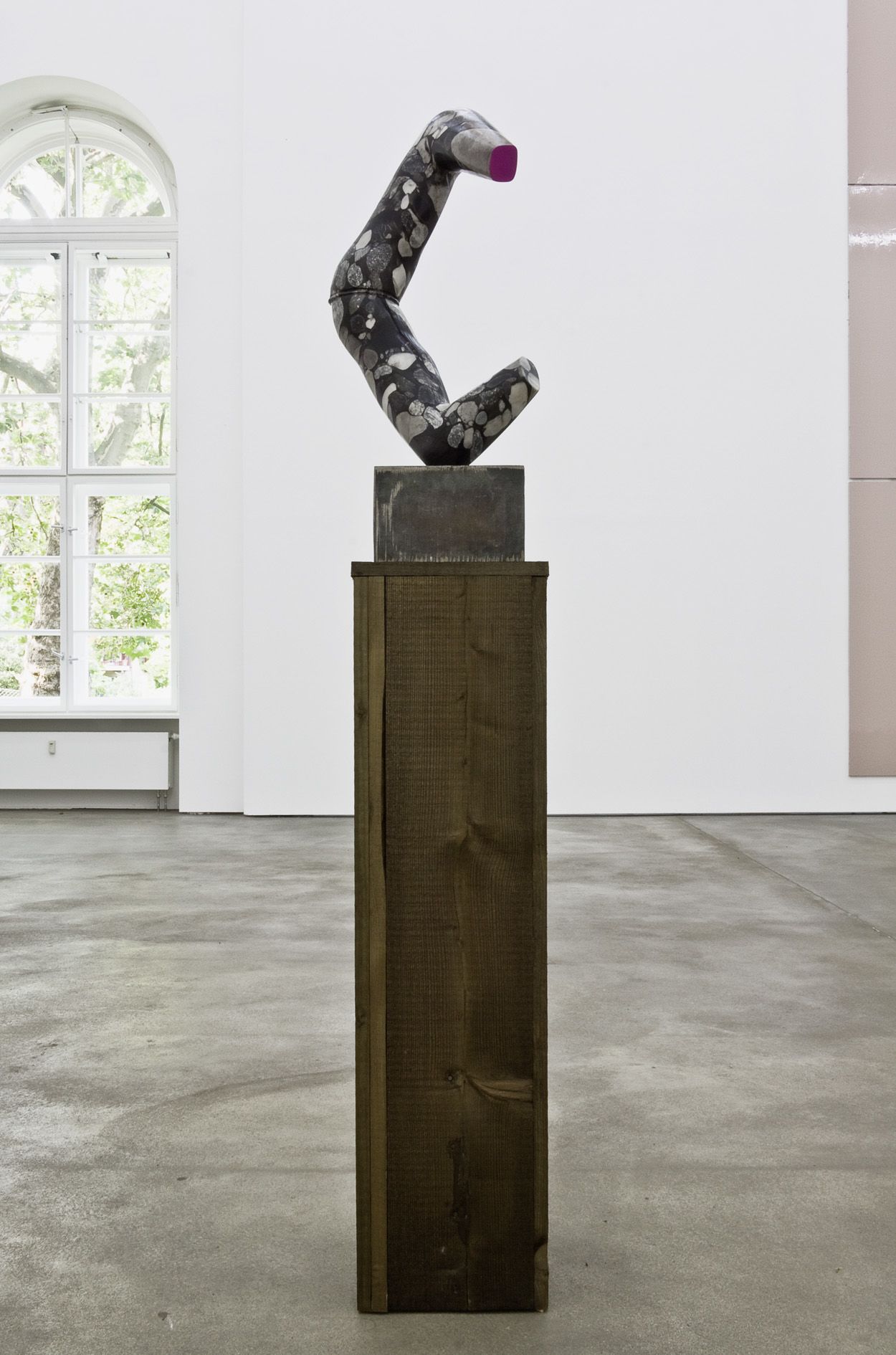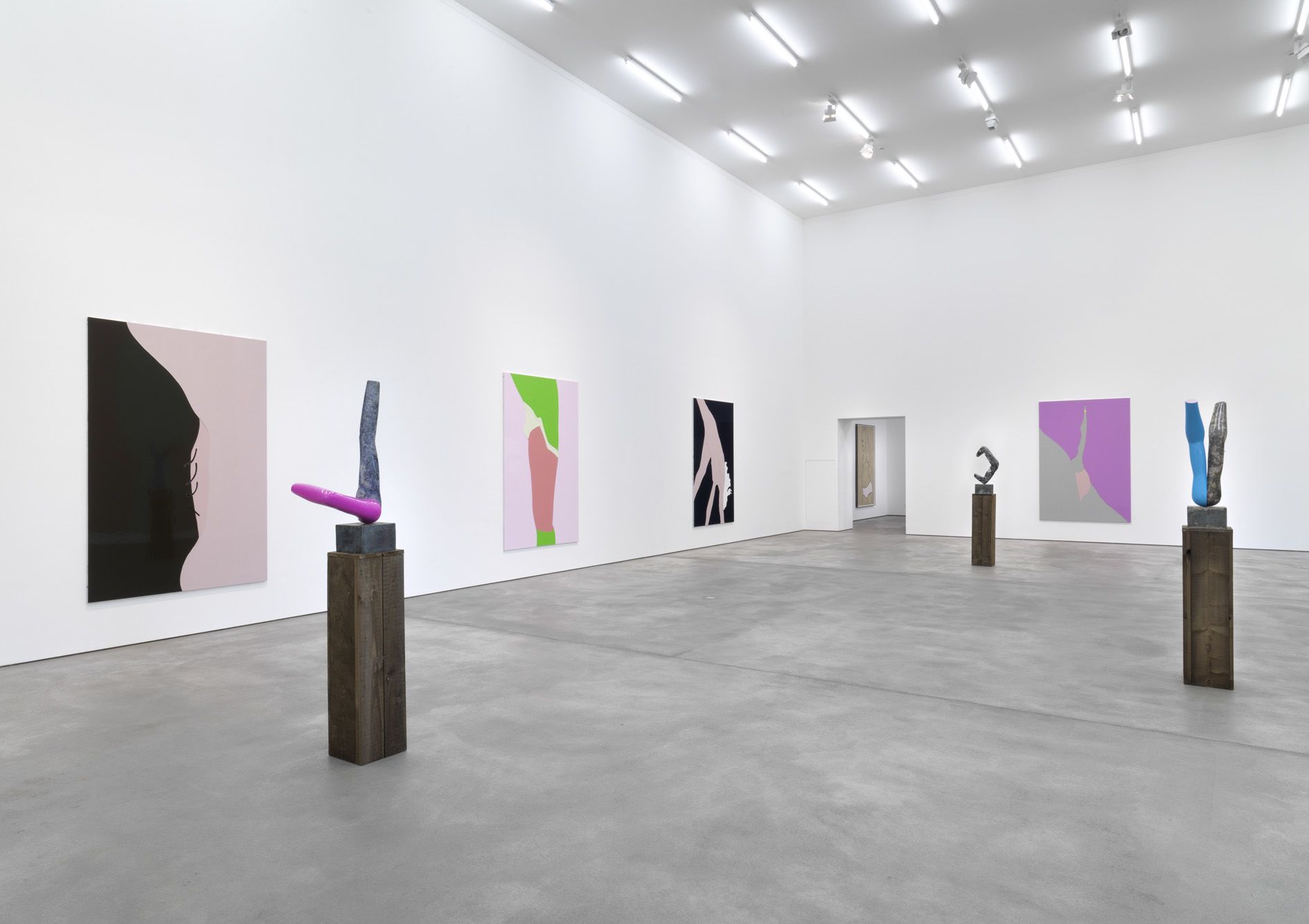 The beautifully shaped and tactile sculptures are conceived from mannequin parts, the human body in ideal universal form. Hume fuses the powerful limbs into static shapes latent with movement, and the vulnerability that their prone position conveys. Hume makes a model of the sculpture, the marble is then carved by hand and laboriously finished with sandpaper. One or more surface is covered in bright gloss paint, creating a strong contrast between materials.