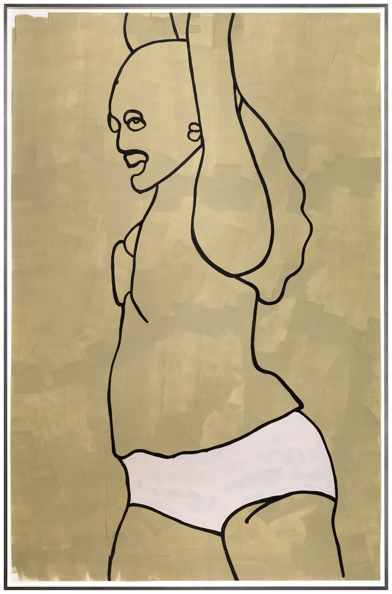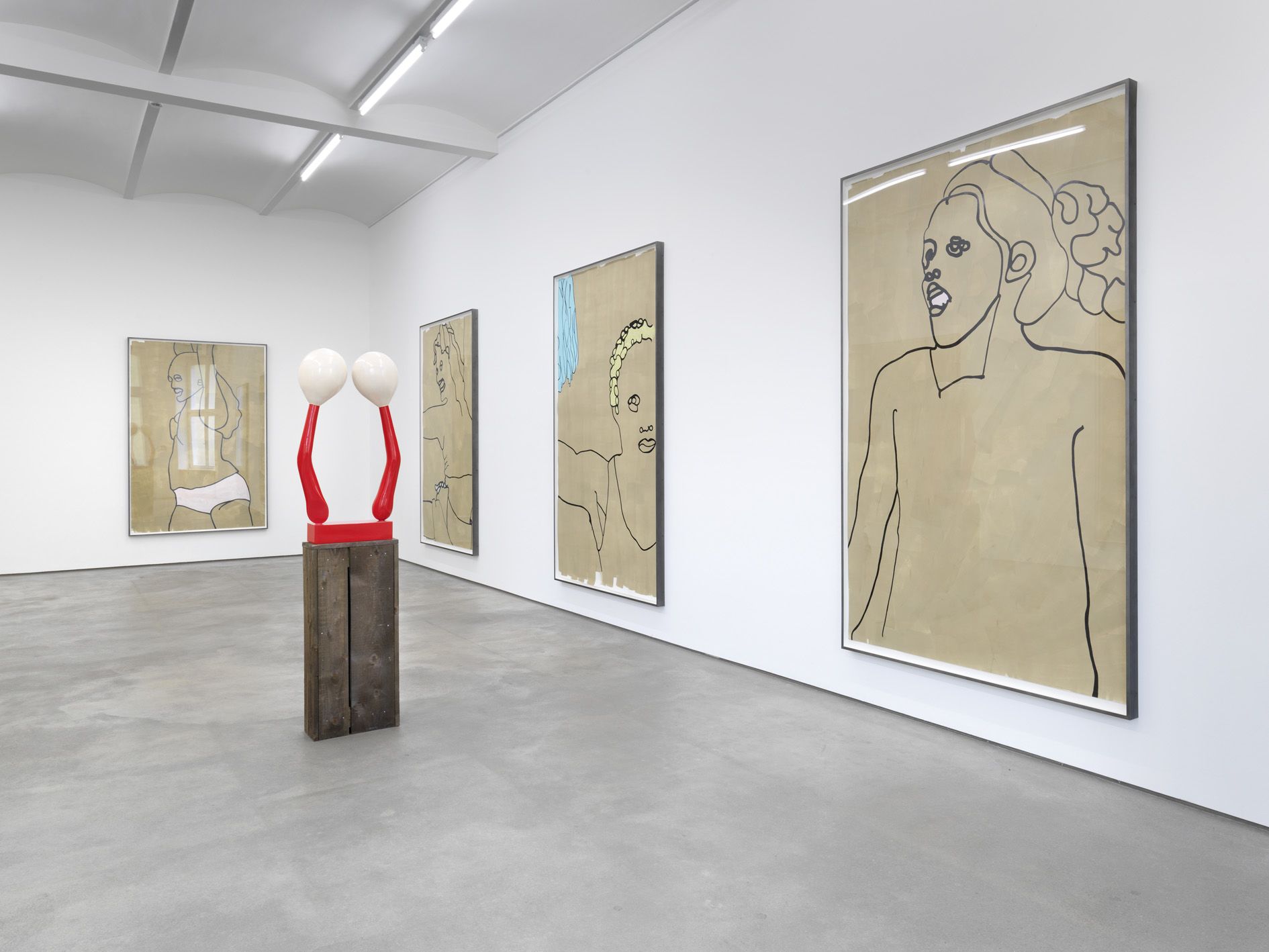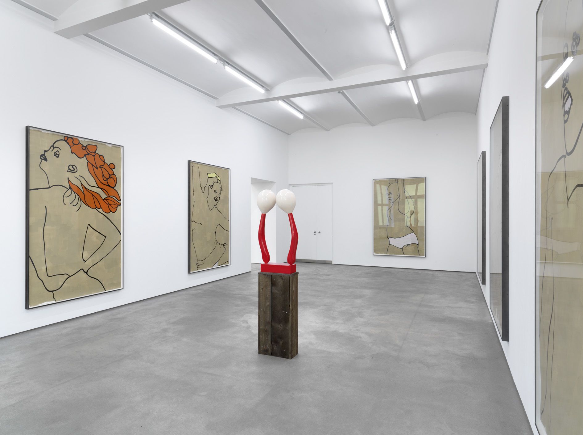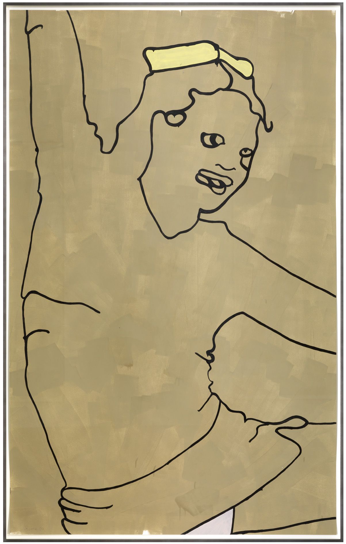 These new paintings relate to the earlier American Tan series, which was described as follows in a press release: ‘Hume finds ambivalence in this most iconic of American art forms: simultaneous desire and repulsion, overt sexuality colliding with playful innocence, power and pride wrapped up in exuberant kitsch’. The new drawings are less closely cropped than the paintings and present instantly recognizable images of women in strong poses. Works like Untitled (2009) present a body and face in strong outline on a neutral background that contrasts and highlights the fiery red color of the figure’s hair.