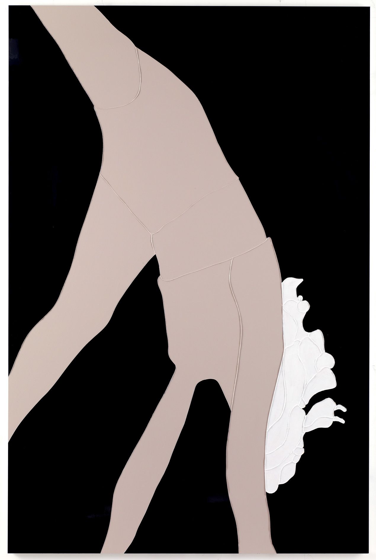 The six paintings form a series of large-format works painted with Hume’s trademark seductive bright colors, given extra luminosity through the use of gloss paint on aluminum. The images are stripped to their essential shapes imbuing any details with increased significance. This allows the works such as The Bridge (2009) to be read both as representation as well as abstract interlinking shapes. The source images are taken from cheerleader magazines, with the unusual viewpoints and angles capturing the movement of the bodies, and closely-cropped images providing a visual challenge to the eye. The contrast of the pastel colors and flesh tones with the cropped images of dissected bodies conveys a sense of dislocation and the disquiet at the heart of representations of American beauty.