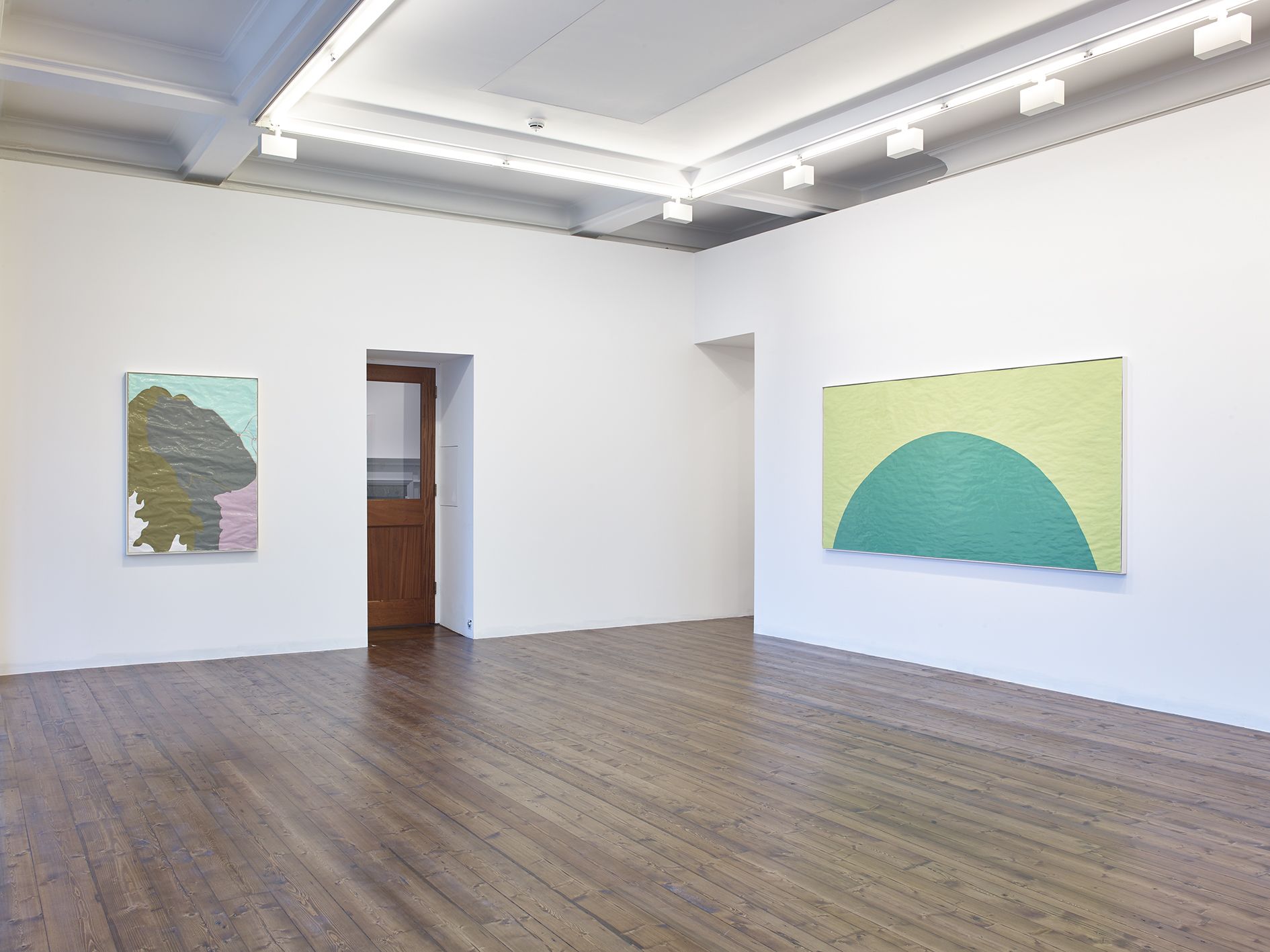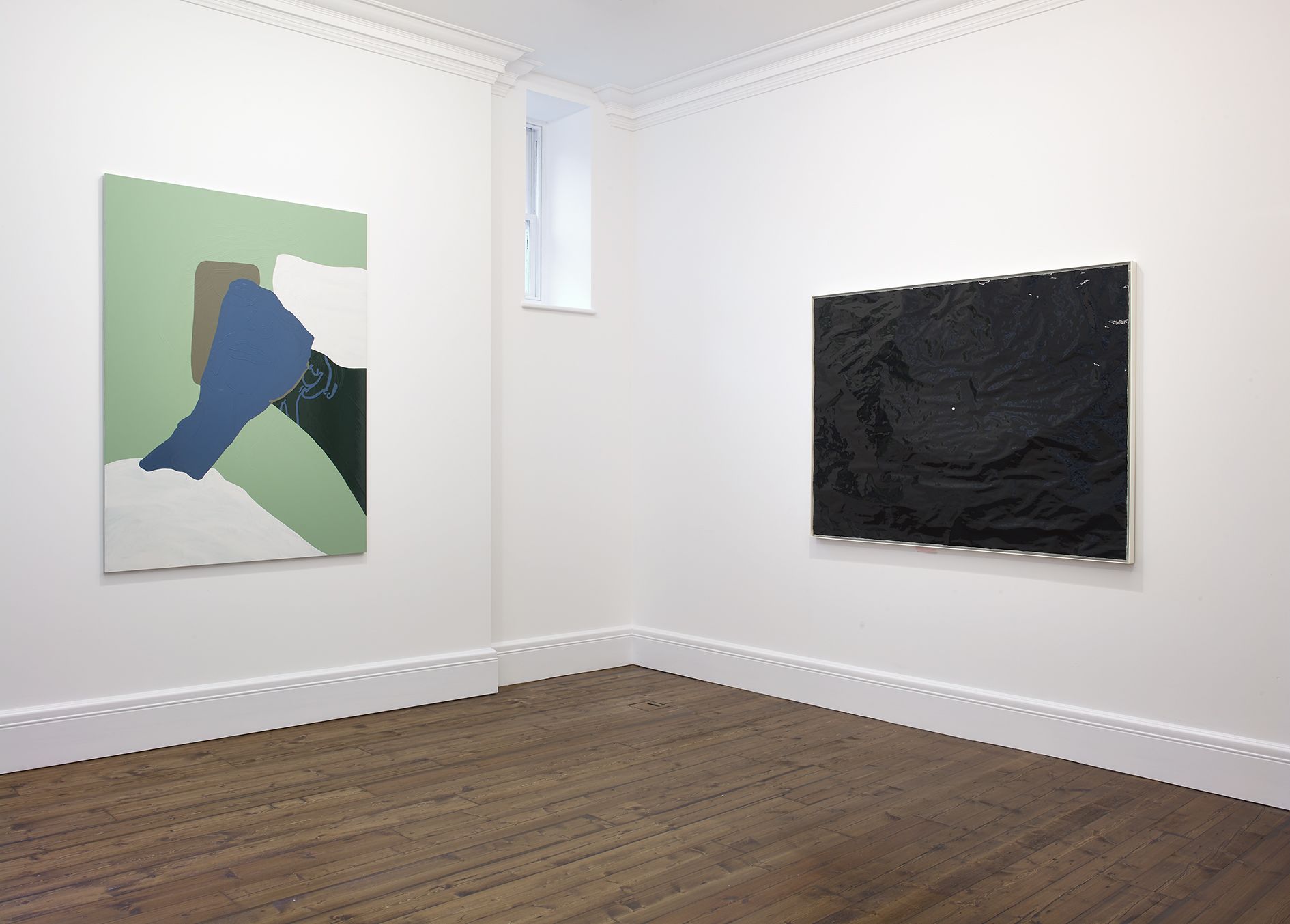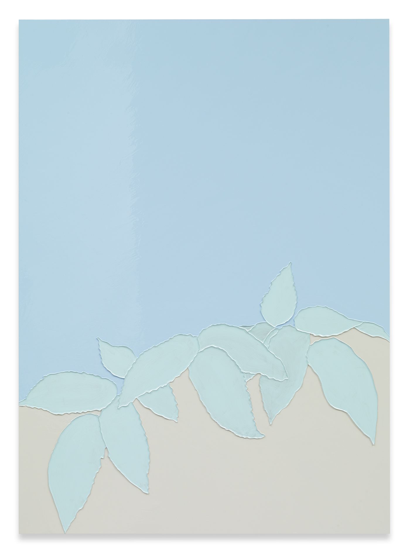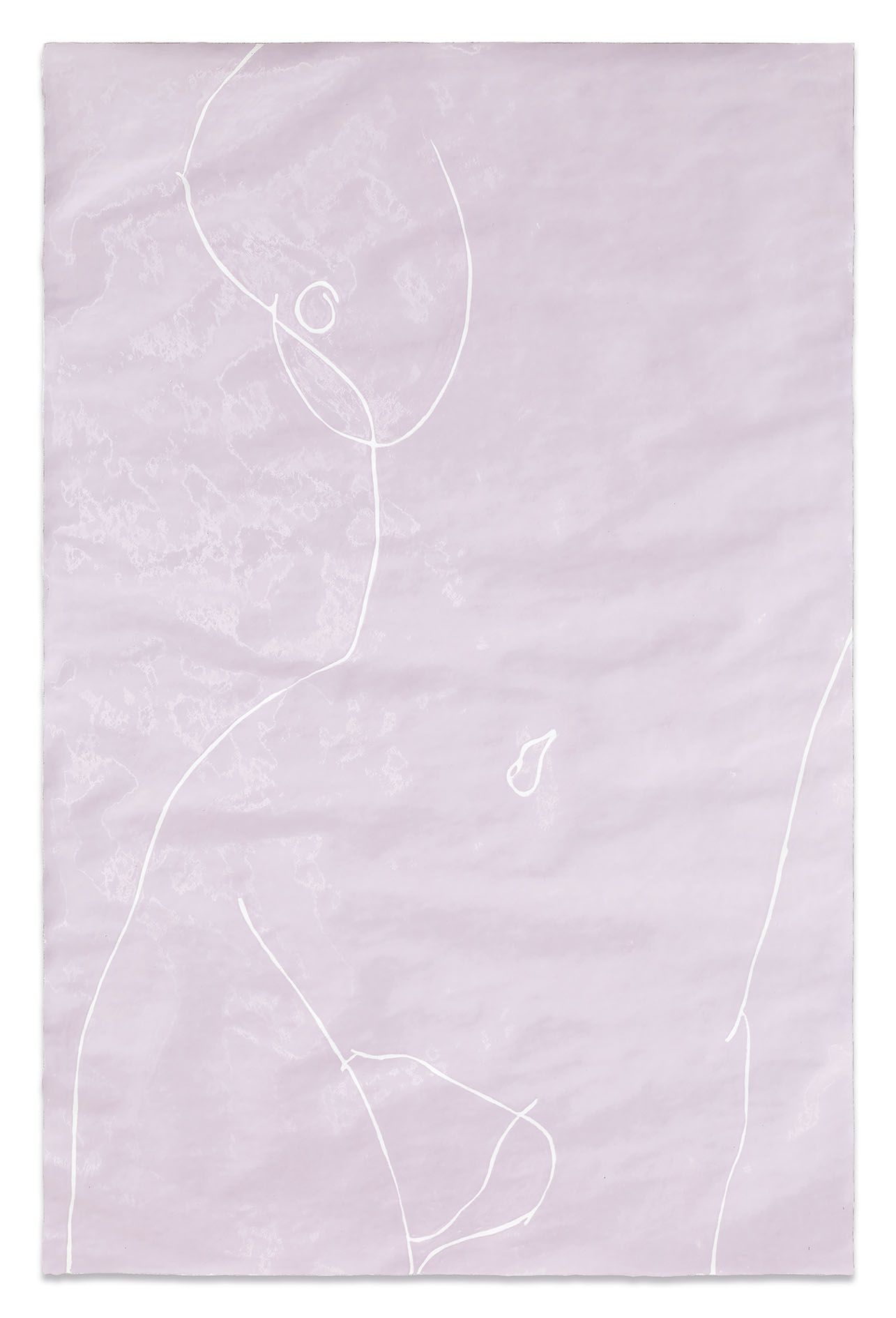 Gary Hume’s new body of works on paper mark a critical shift in his practice. Emerging from preparatory sketches, they revealed themselves as a unique and compelling body of work that has led the artist to develop an entirely new painting method. The use of domestic gloss paint is indicative of Hume’s practice, yet its effect on the paper ground enables a distinctive interplay between light, depth, and texture that stands in stark contrast to his characteristic aluminium paintings. The paper warps beneath the density of the paint, forming an undulating surface that departs from definitive flatness of his earlier works and creates a diffused reflection of light favouring ambiguity and openness. The formal properties of the new material prevent the artist from being able to scrape back the paint and rework an image as he can with aluminium. Without room for revision, the paintings on paper are much more akin to the medium of drawing, and develop only through the artist’s clear perception of the finished image. They are set in very thin aluminium tray frames, and their sculptural surface is unmediated by glass.