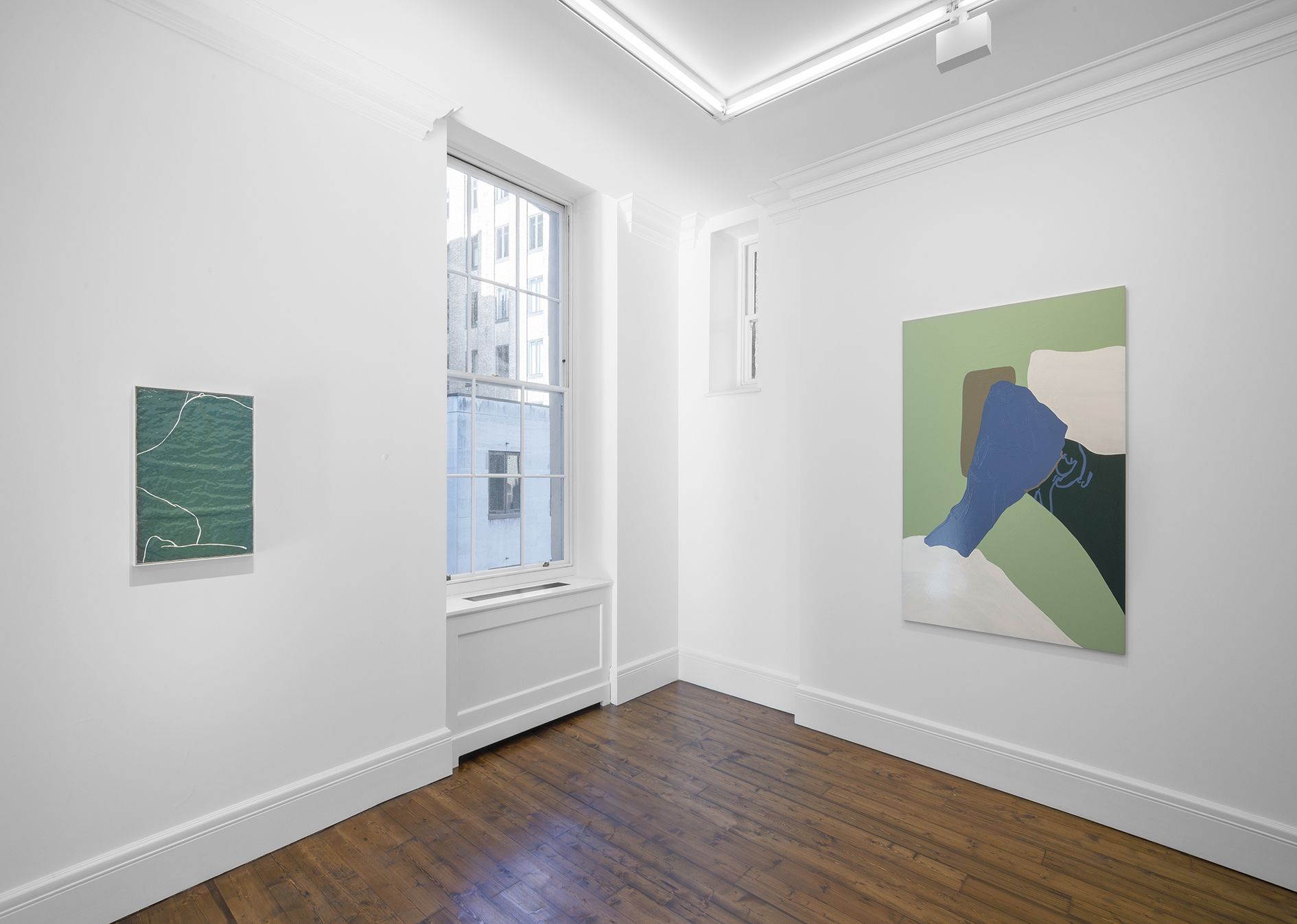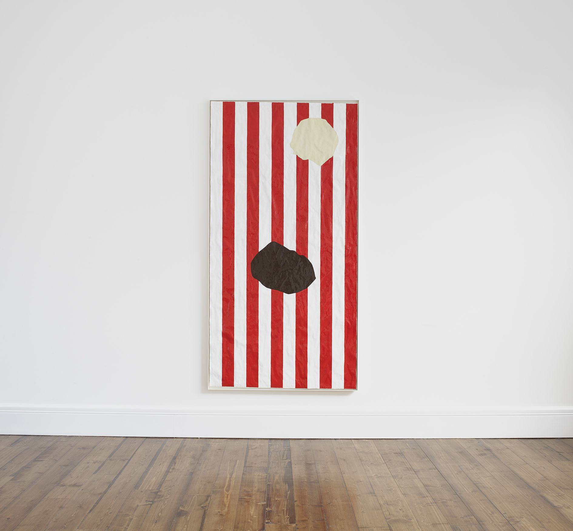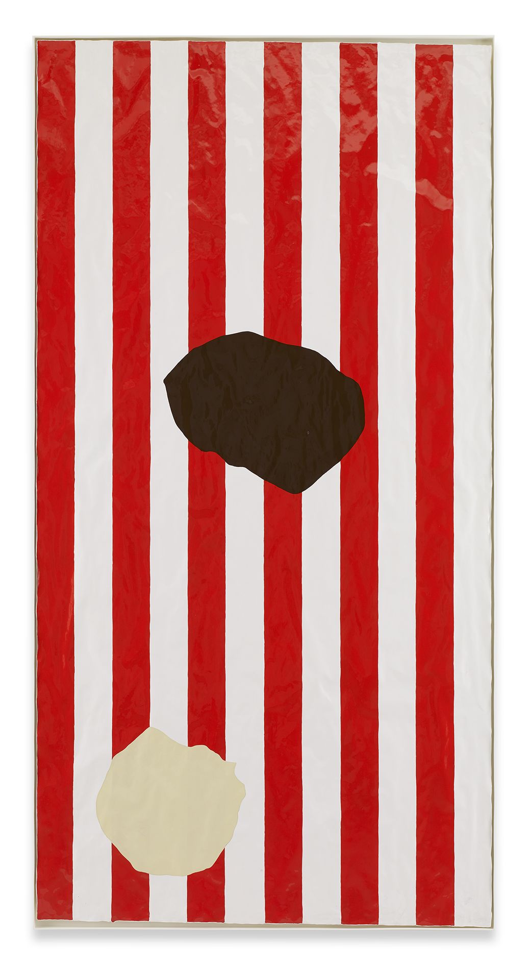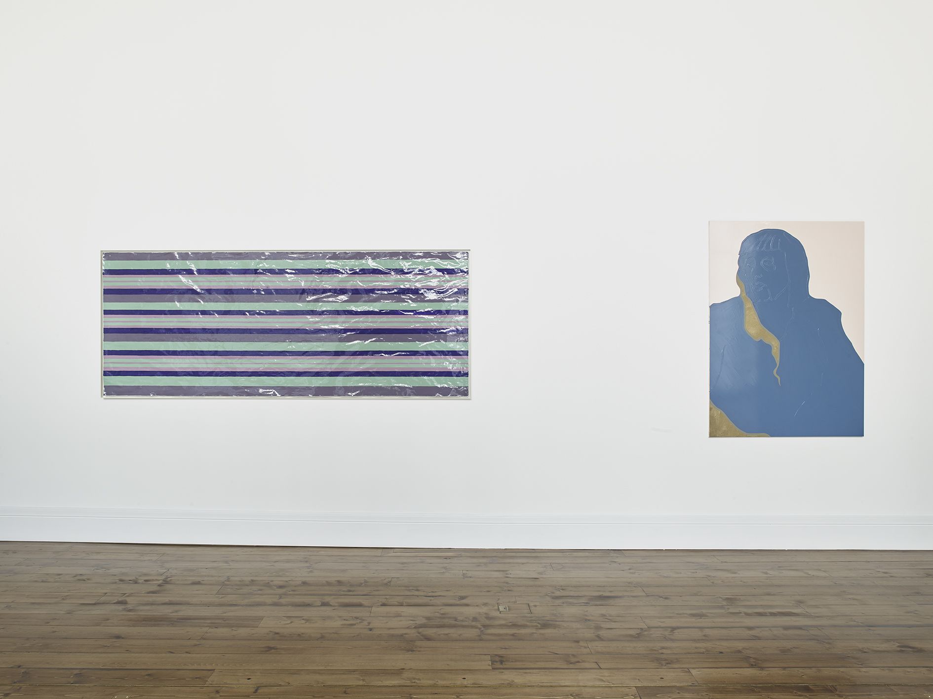 Gary Hume’s new body of works on paper mark a critical shift in his practice. Emerging from preparatory sketches, they revealed themselves as a unique and compelling body of work that has led the artist to develop an entirely new painting method. The use of domestic gloss paint is indicative of Hume’s practice, yet its effect on the paper ground enables a distinctive interplay between light, depth, and texture that stands in stark contrast to his characteristic aluminium paintings. The paper warps beneath the density of the paint, forming an undulating surface that departs from definitive flatness of his earlier works and creates a diffused reflection of light favouring ambiguity and openness. The formal properties of the new material prevent the artist from being able to scrape back the paint and rework an image as he can with aluminium. Without room for revision, the paintings on paper are much more akin to the medium of drawing, and develop only through the artist’s clear perception of the finished image. They are set in very thin aluminium tray frames, and their sculptural surface is unmediated by glass.
