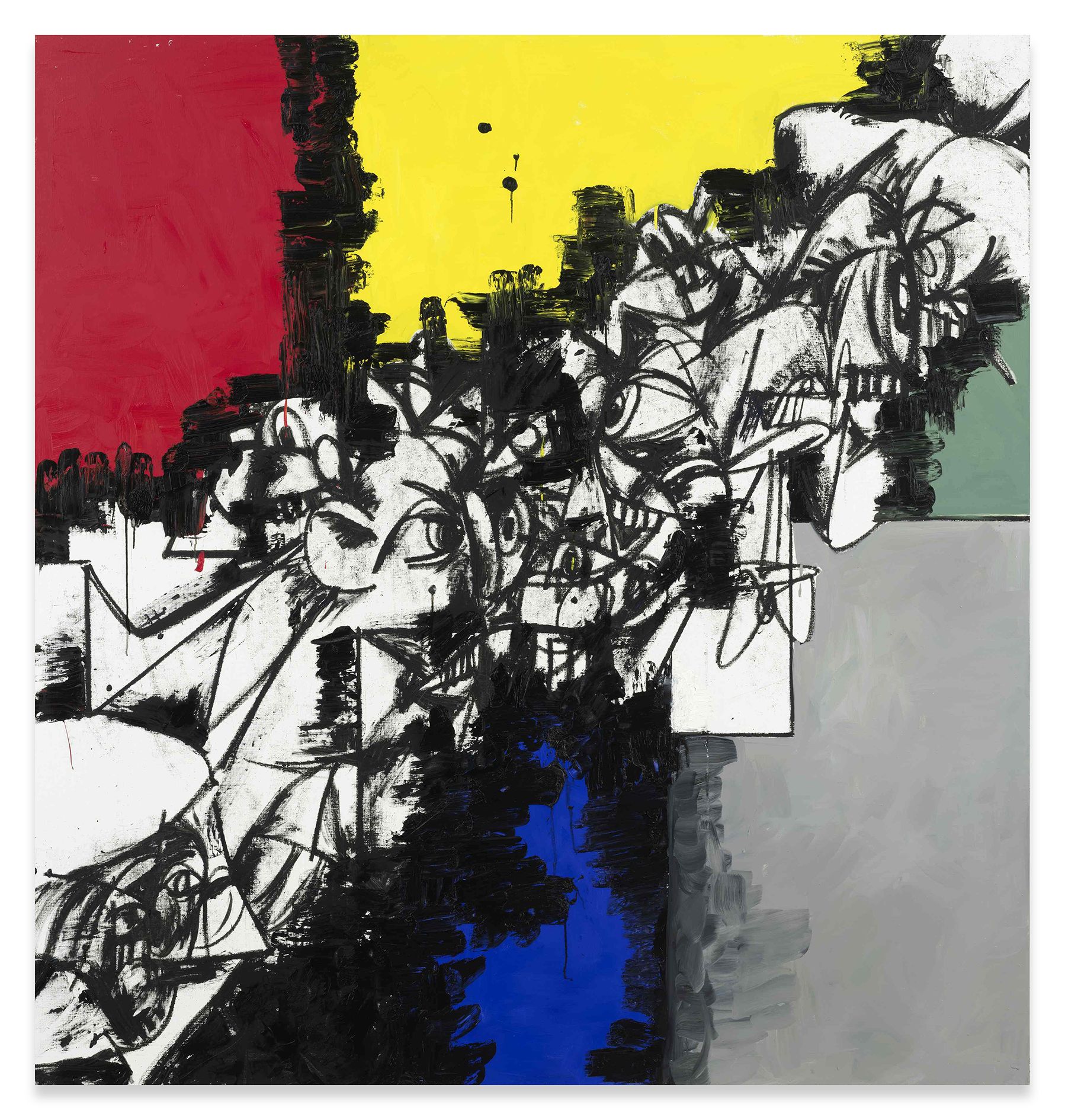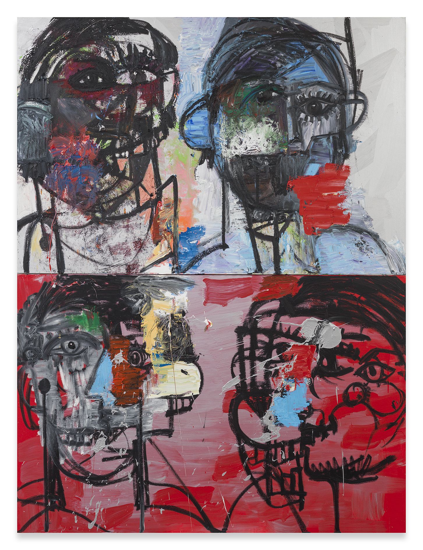 In the late 1970s Condo moved from Boston to New York, working for Andy Warhol in the Factory as a screen-printer. His two diptychs directly reference Warhol’s infamous Myths series that featured subjects as diverse as Marilyn Monroe and Mickey Mouse. Replicating Warhol’s favored quadrant formation, the artist superimposes facial features to distort his portraits into chaotic compositions: a mouth becomes a nose; an oversized ear becomes a cartoonish snout. Not limited to his portraits, Condo creates mayhem out of dislocated limbs and facial features elsewhere in the exhibition. The upward motion of dense abstracted forms in Zombie Modernism (2015) reads like a comic book that begs to be deciphered. The flat colors of its background evoke Mondrian, whilst the title is a playful nod to Condo’s gusto for resurrecting Modernist characteristics and disfiguring them to address the zeitgeist of his own era.
