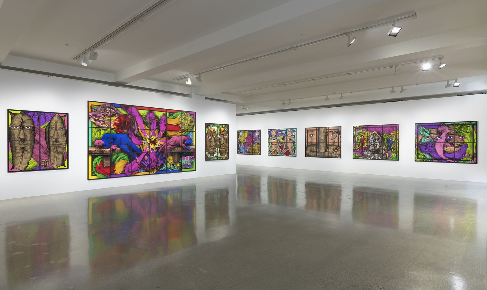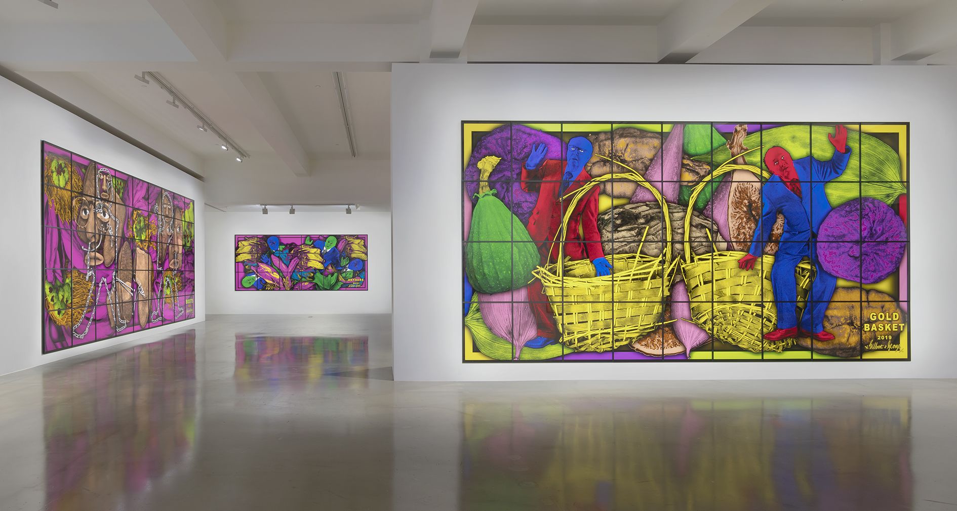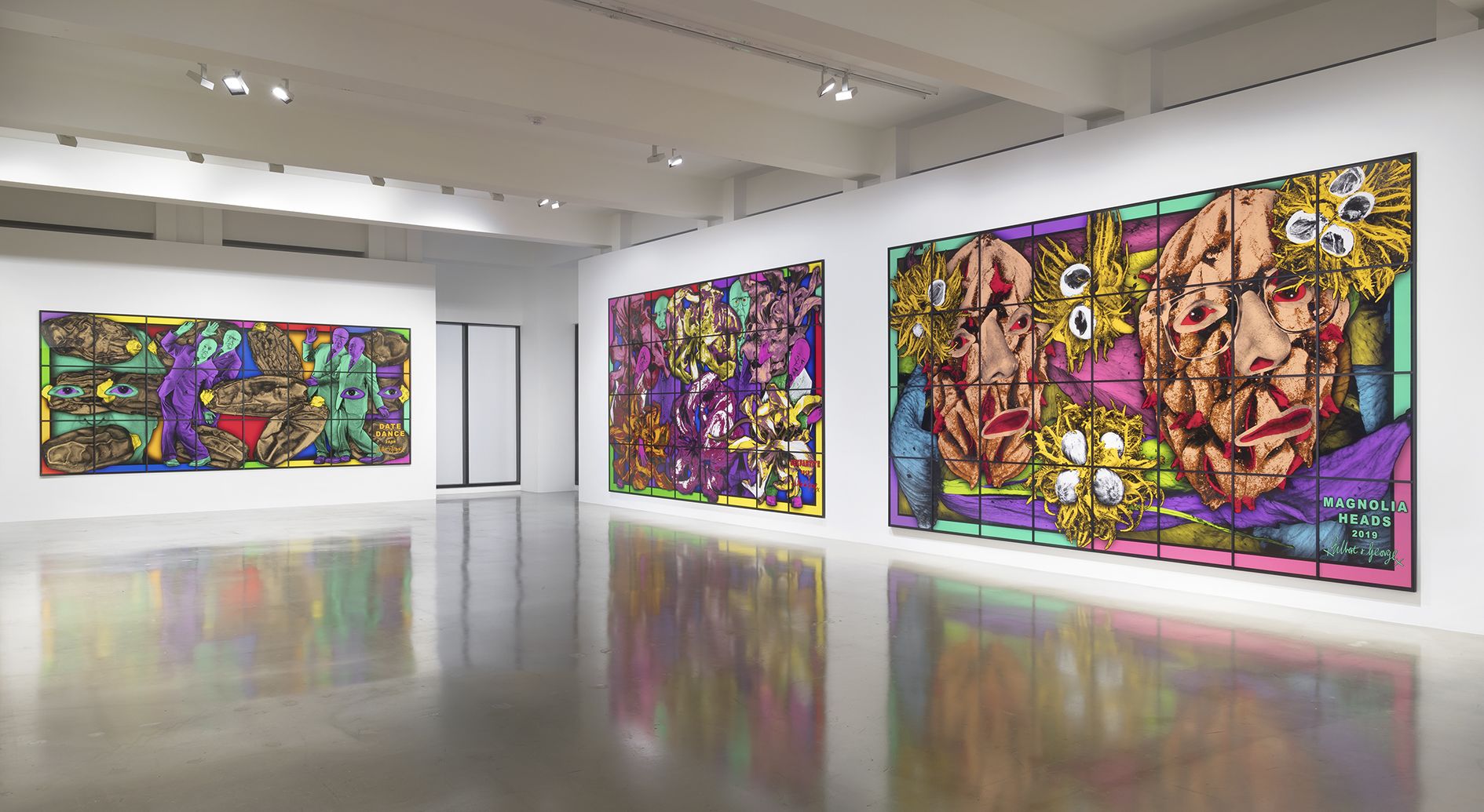 Though the specific imagery in Gilbert & George’s art stems largely from the areas around their studio in London’s East End, the context of Southern California—deeply political and attuned to contemporary social issues—is an engaging one for their PARADISICAL PICTURES in particular. The hallucinogenic palette and focus on natural forms such as leaves, fruits, and flowers, for example, aligns productively with California’s history as an important breeding ground for the bohemian, environmentalist and civil rights movements from the 1960s onward; and the cinematic nature of Gilbert & George’s pictures, which flow from one to the next, building an uncertain tale of paradise, calls to mind the dream-worlds, characters and impulses of the Hollywood film industry. As the artists move through these dense and richly colored vistas, they carry the viewer with them on their allegorical journey to another, and possibly higher, plane of existence.