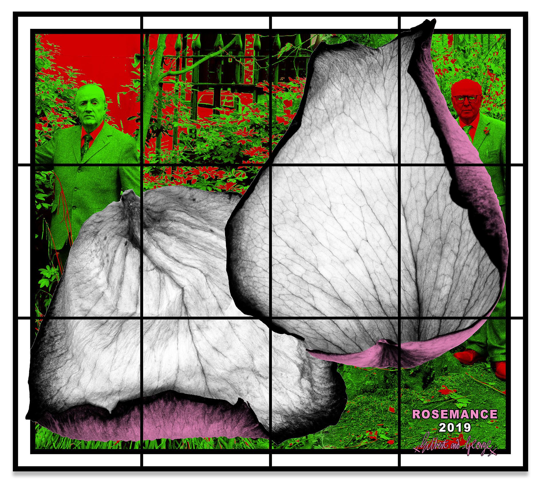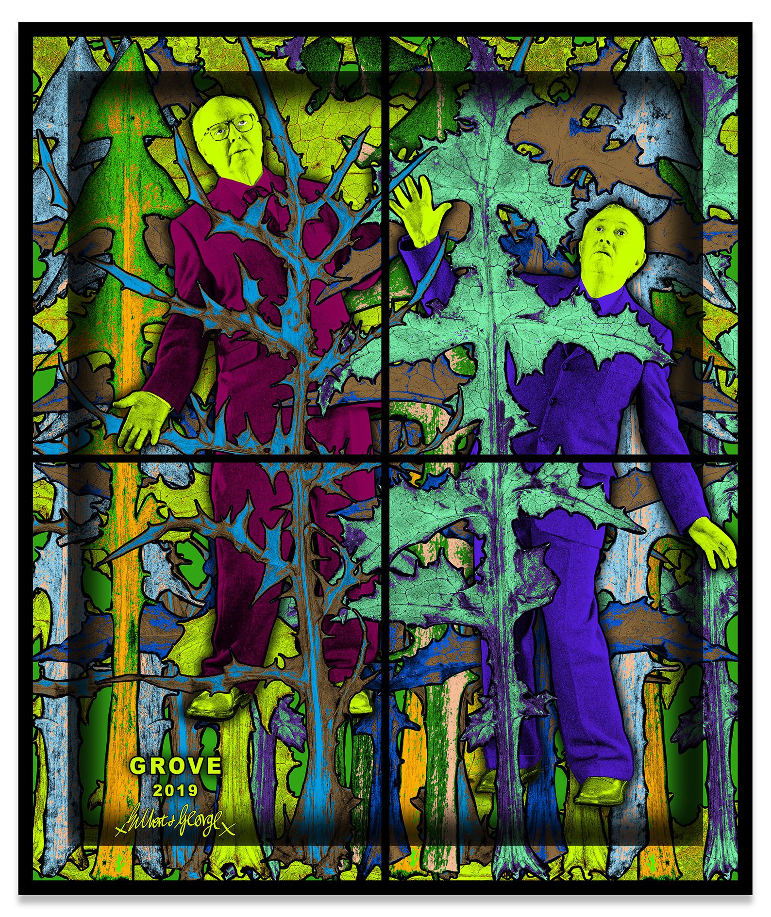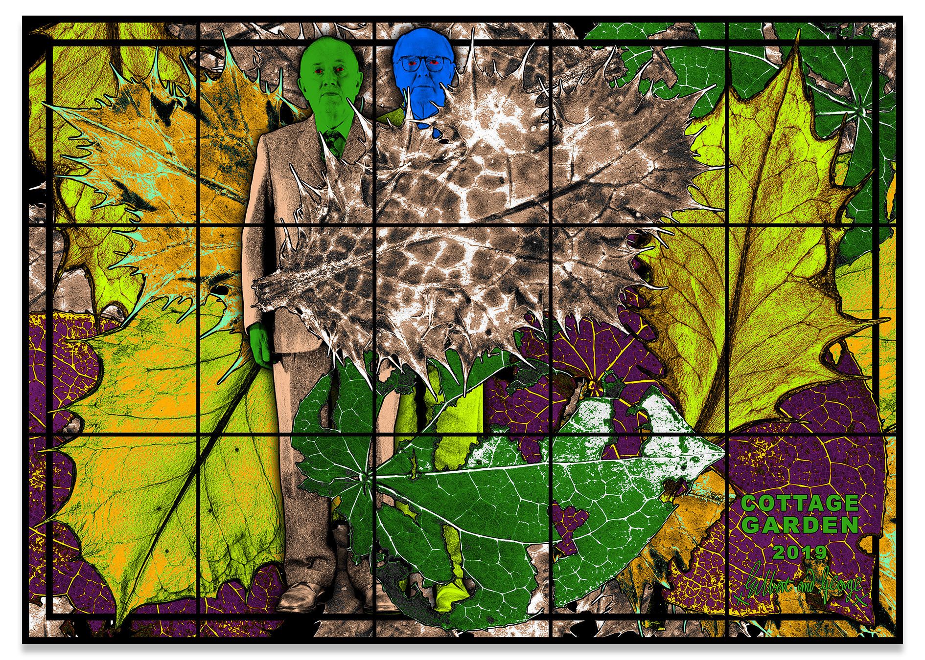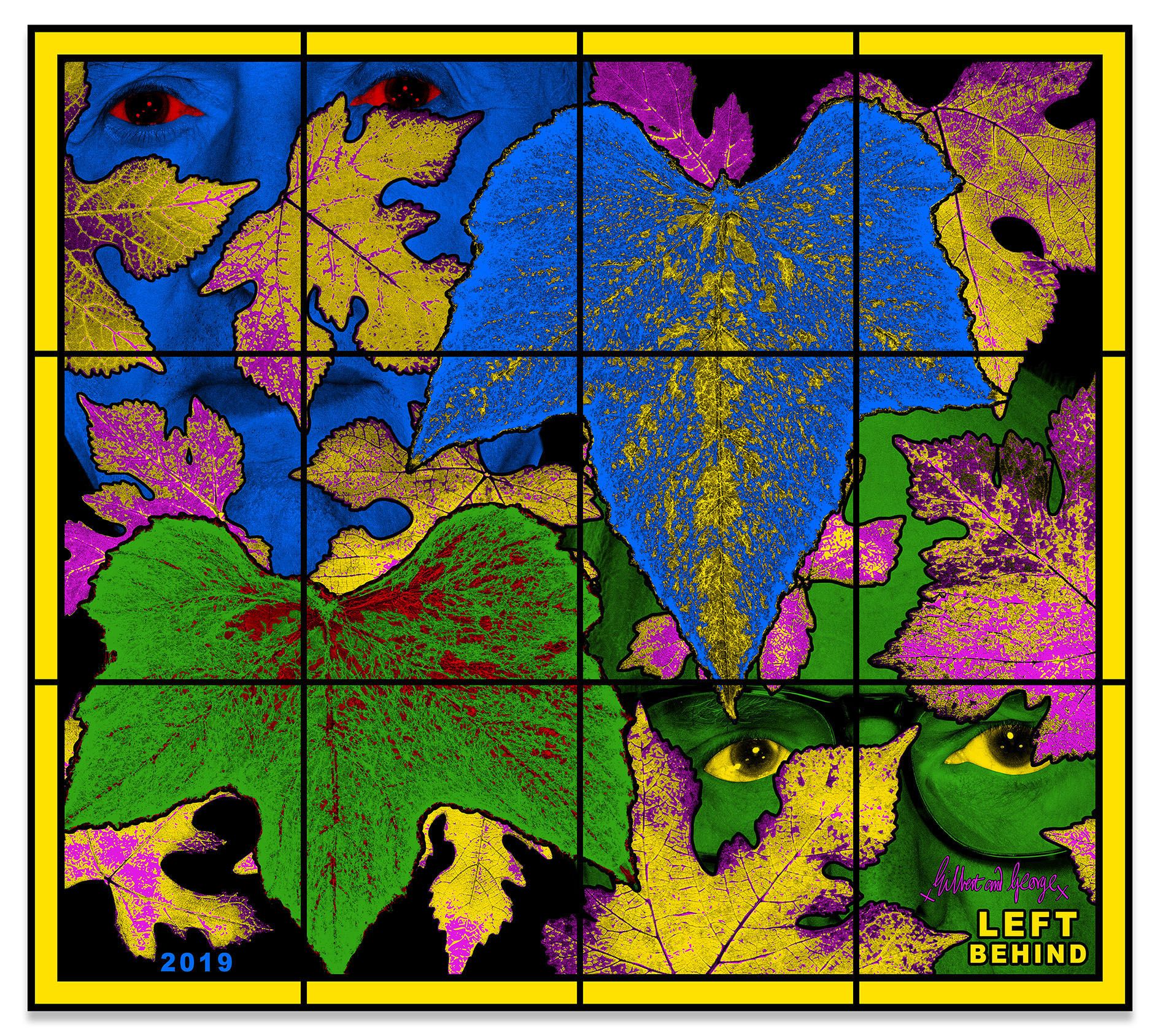 Gilbert & George appear across the many panels of the PARADISICAL PICTURES, meandering through a violently vivid array of psychedelically colored natural forms, including flowers, leaves, petals, fruits, tree limbs and branches. Individually, each picture presents a mesmeric world unto itself, replete with lush surfaces and vibrant hues, but likewise filled with references to aging and exhaustion. Together, they comprise an overwhelming, compelling yet ambivalent concept of paradise: gorgeous, abundant and attractive, yet elsewhere resolutely nightmarish. As the critic Michael Bracewell writes in the exhibition’s catalogue, the PARADISICAL PICTURES present “a world in which atmosphere doubles as event—a quality shared with the films of Alfred Hitchcock or early animated films by Walt Disney studios. Their heightened, saturated, violent, cloying colours convey hallucinogenic portent, unease—like musty-sweet sleeping gas.”