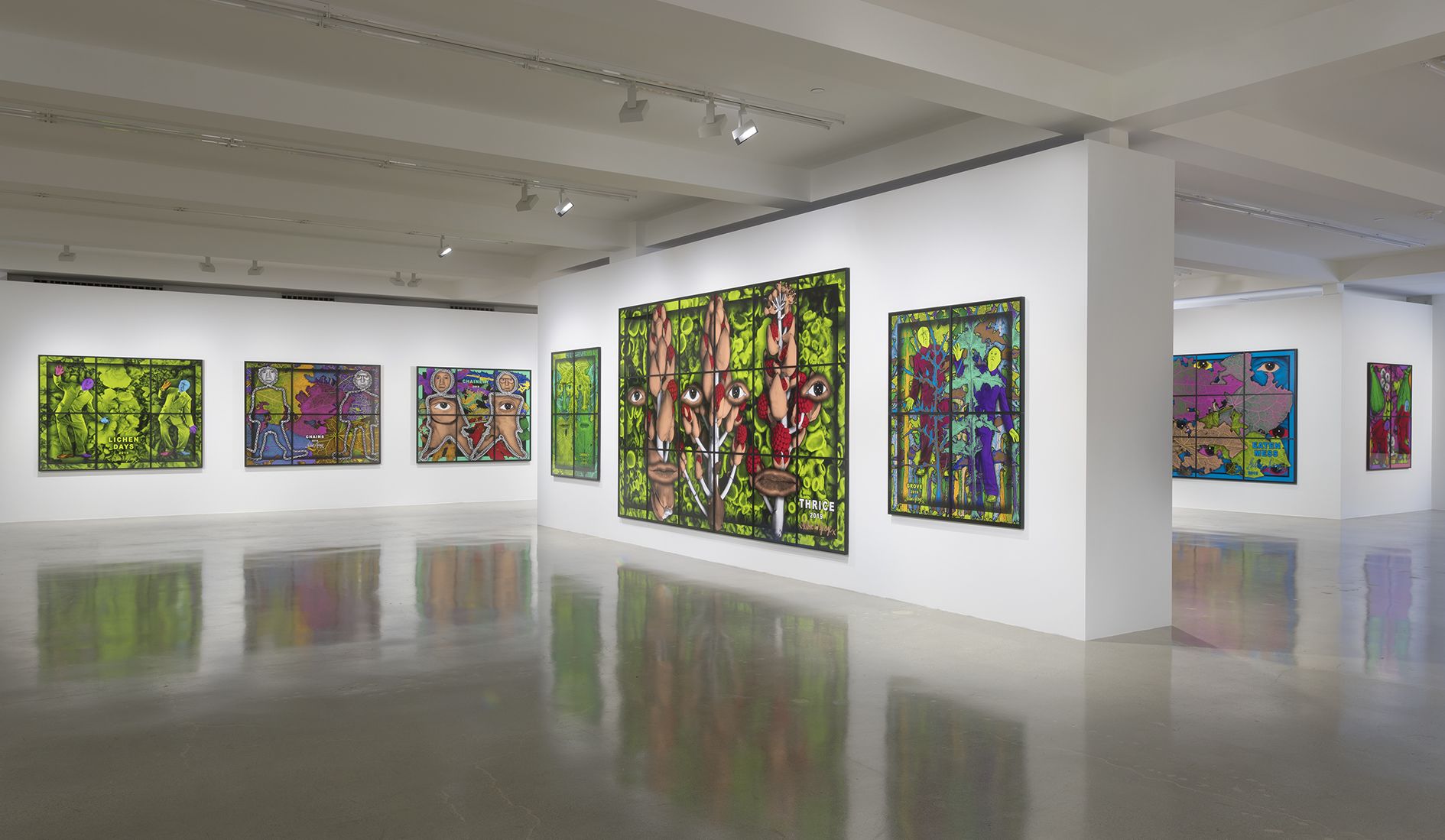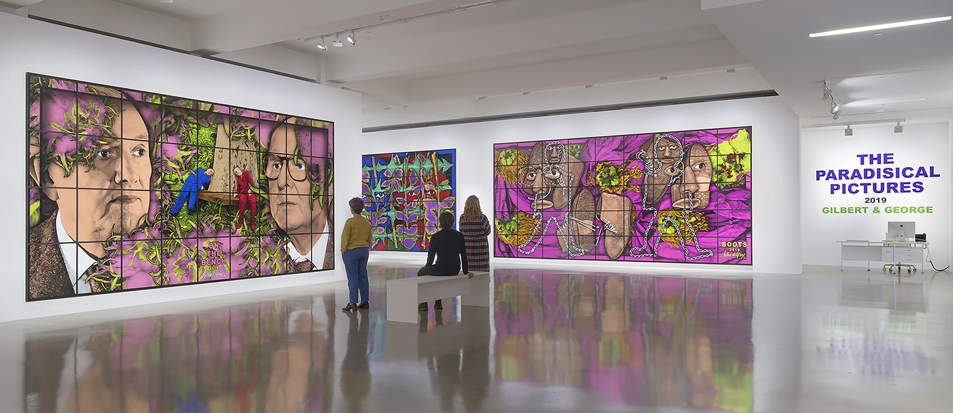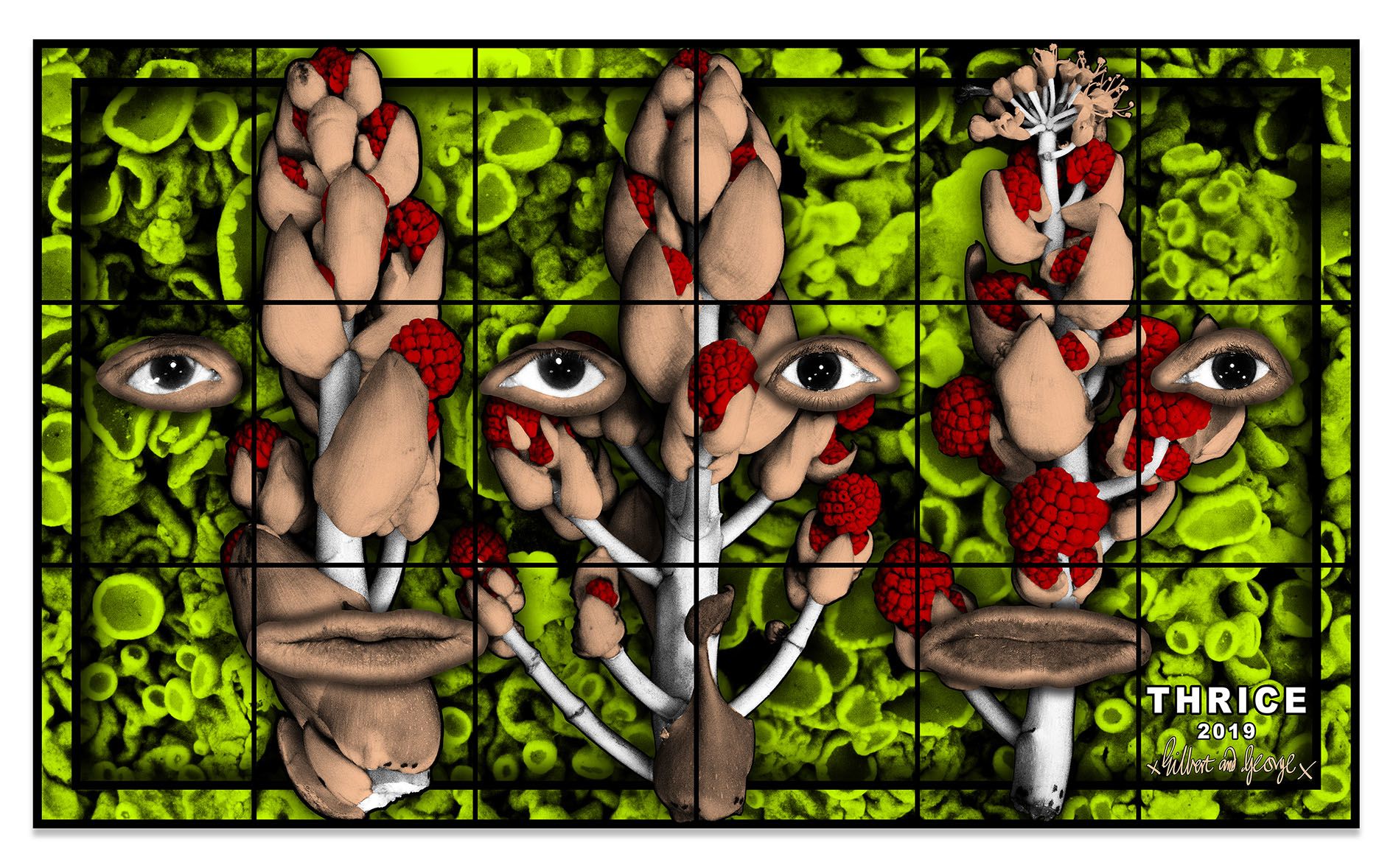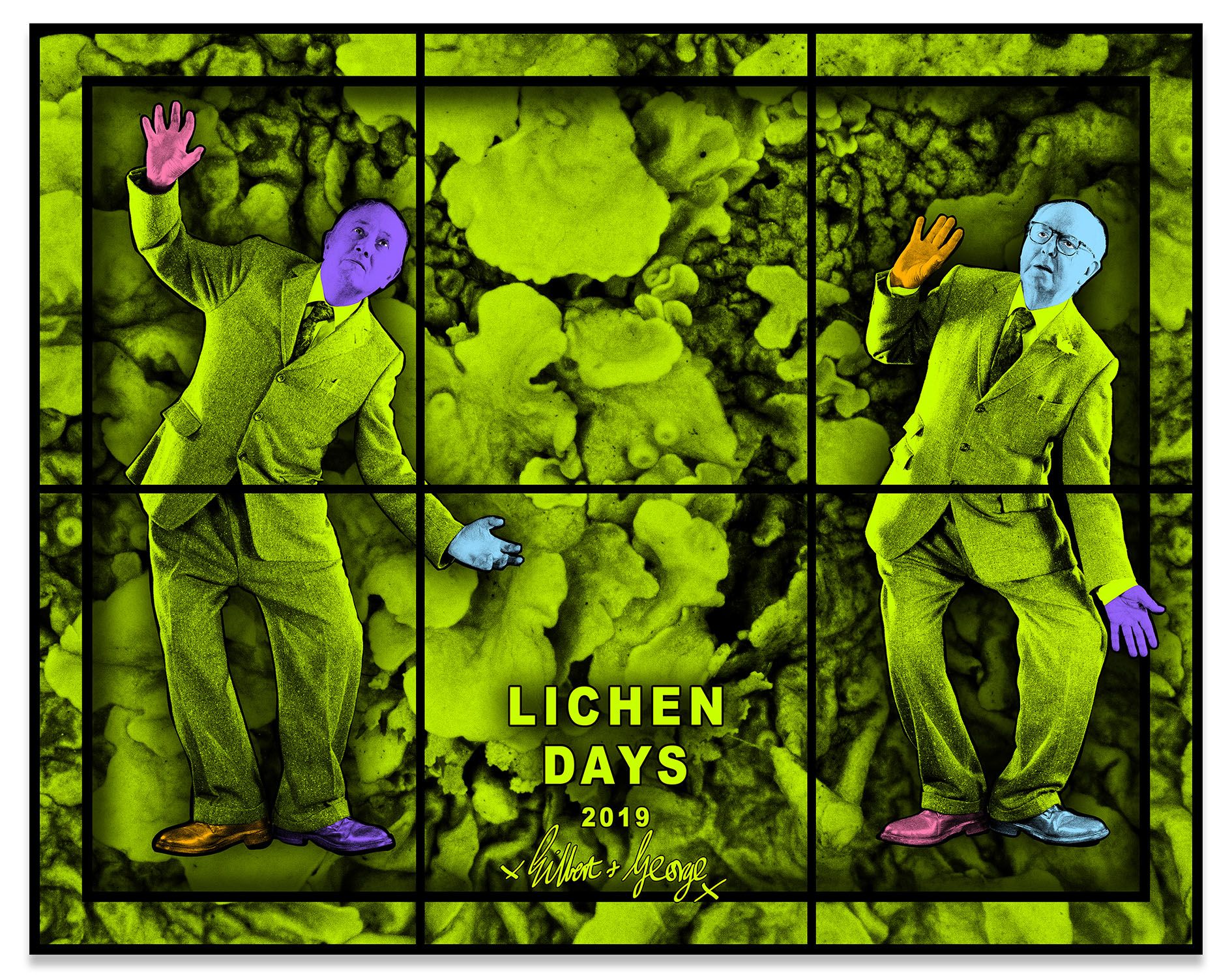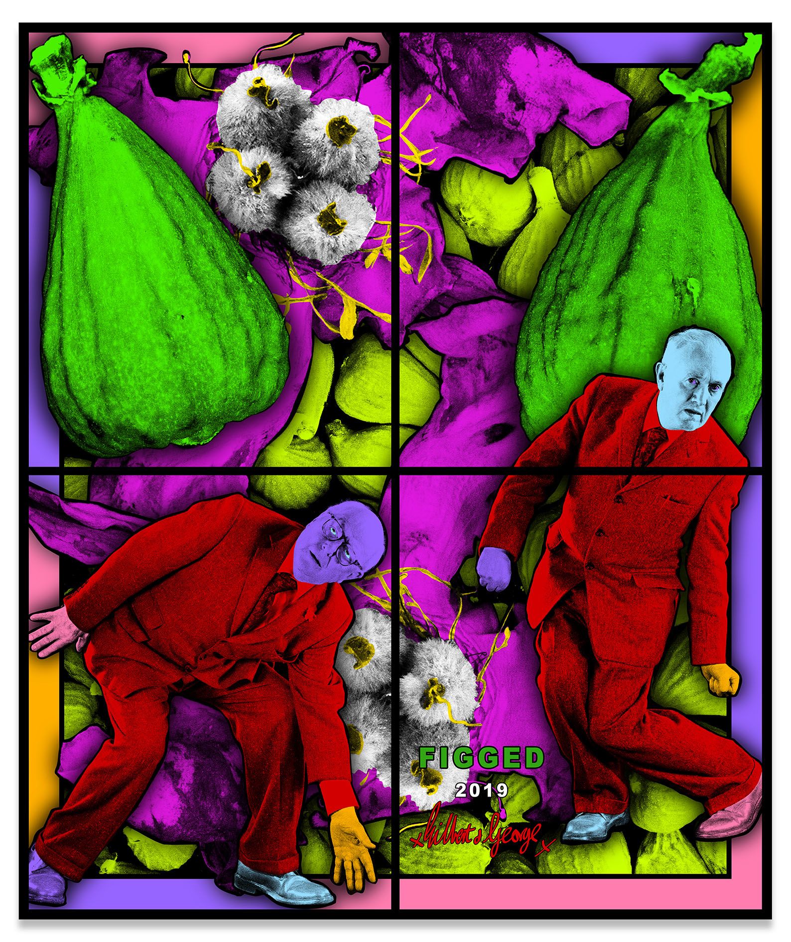 Gilbert & George appear across the many panels of the PARADISICAL PICTURES, meandering through a violently vivid array of psychedelically colored natural forms, including flowers, leaves, petals, fruits, tree limbs and branches. Individually, each picture presents a mesmeric world unto itself, replete with lush surfaces and vibrant hues, but likewise filled with references to aging and exhaustion. Together, they comprise an overwhelming, compelling yet ambivalent concept of paradise: gorgeous, abundant and attractive, yet elsewhere resolutely nightmarish. As the critic Michael Bracewell writes in the exhibition’s catalogue, the PARADISICAL PICTURES present “a world in which atmosphere doubles as event—a quality shared with the films of Alfred Hitchcock or early animated films by Walt Disney studios. Their heightened, saturated, violent, cloying colours convey hallucinogenic portent, unease—like musty-sweet sleeping gas.”