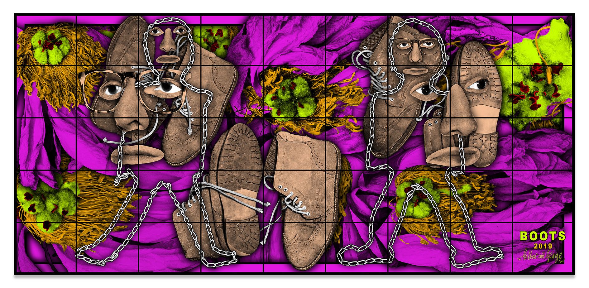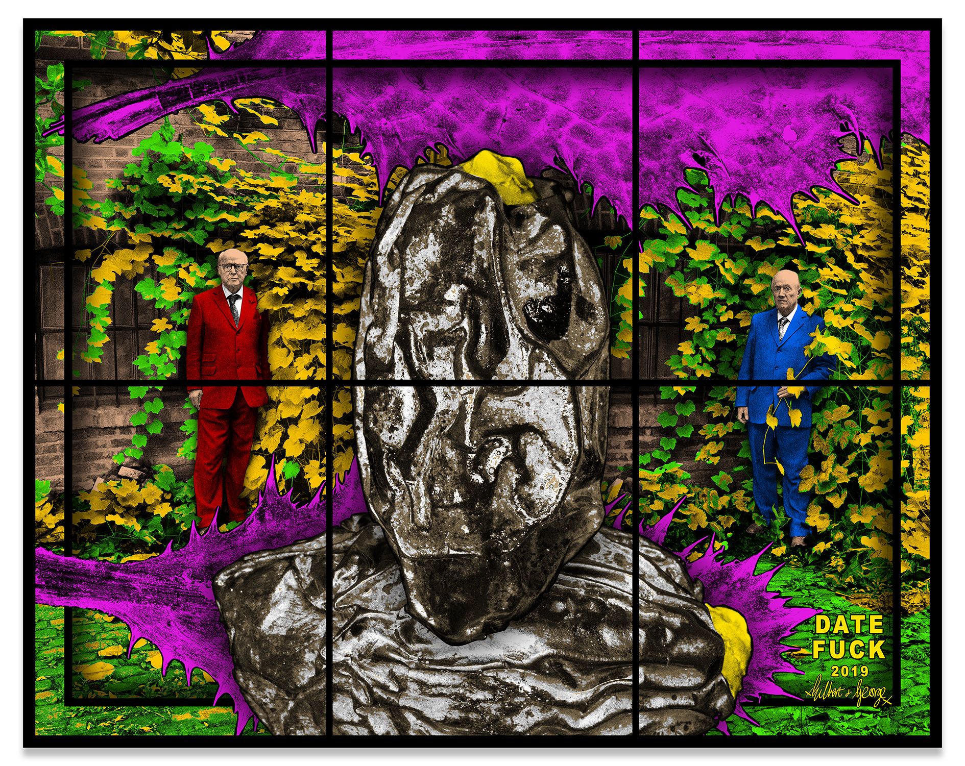 Amid these intense topics, complexity and empathy are ever-present, as are the artists themselves. At the start of their career, Gilbert & George declared that they were “Living Sculptures,” artworks in their own right, and images of their suited, respectable-looking persona have circulated through their art ever since. Though their guise is one of a conservative pair of modern citizens, paradoxically, the messages in their art strive for openness, inclusivity and the freedom to express oneself as one chooses. The art of Gilbert & George has always comprised a “love letter,” in their words, to a multi-cultural, multi-faith, mass-technological, sexually open, volatile, moral, mundane and fantastical modern world. Their pictures open the viewer to self-examination and to a renewed questioning of their place in the world.