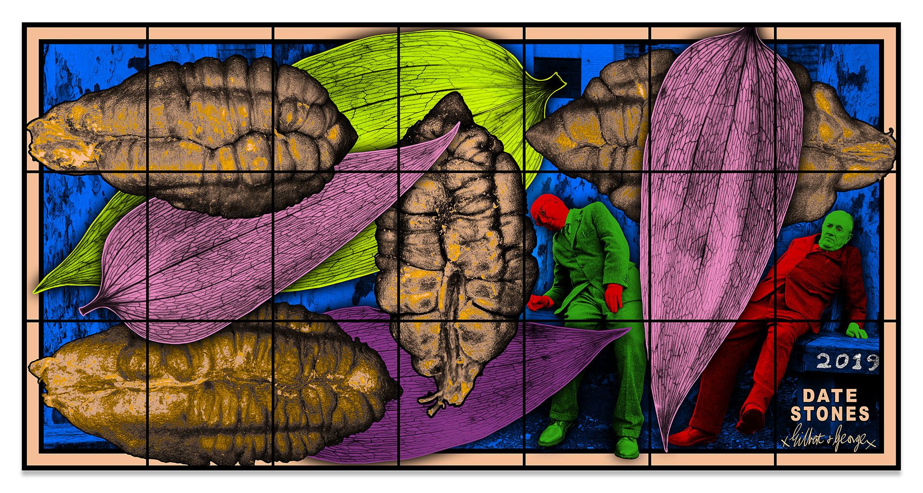 Throughout these pictures, and in Gilbert & George’s art in general, references emanate from disparate eras of cultural history, including nineteenth-century Romanticism and the pop milieu of science fiction and comic books. In ON THE BENCH, giant portraits of the pair flank the edges of the composition, mimicking sentimental picture-making of the nineteenth and early twentieth centuries, or even the coupled aristocratic portraits of earlier painting traditions. Toward the center, that regality is countered by smaller-scale representations of the artists slumped over on a park bench, passed out perhaps from fatigue or drunkenness. Frequently the butt of their own jokes, the artists repeatedly portray their persona in a laughable light, negating the myth of artistic genius and presenting themselves as fallible seekers of knowledge. Their droll dance moves in DATE DANCE illustrate this self-mocking tone, while the dried dates that join them in motion recall the scatological auras of the artists’ challenging NAKED SHIT PICTURES of the mid-1990s. No object is necessarily as it seems in the PARADISICAL PICTURES’ strange, mind-altering vistas.