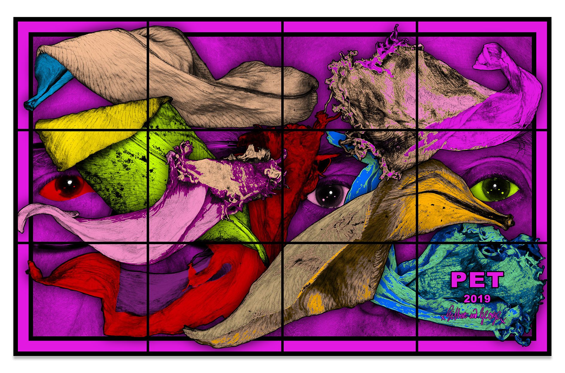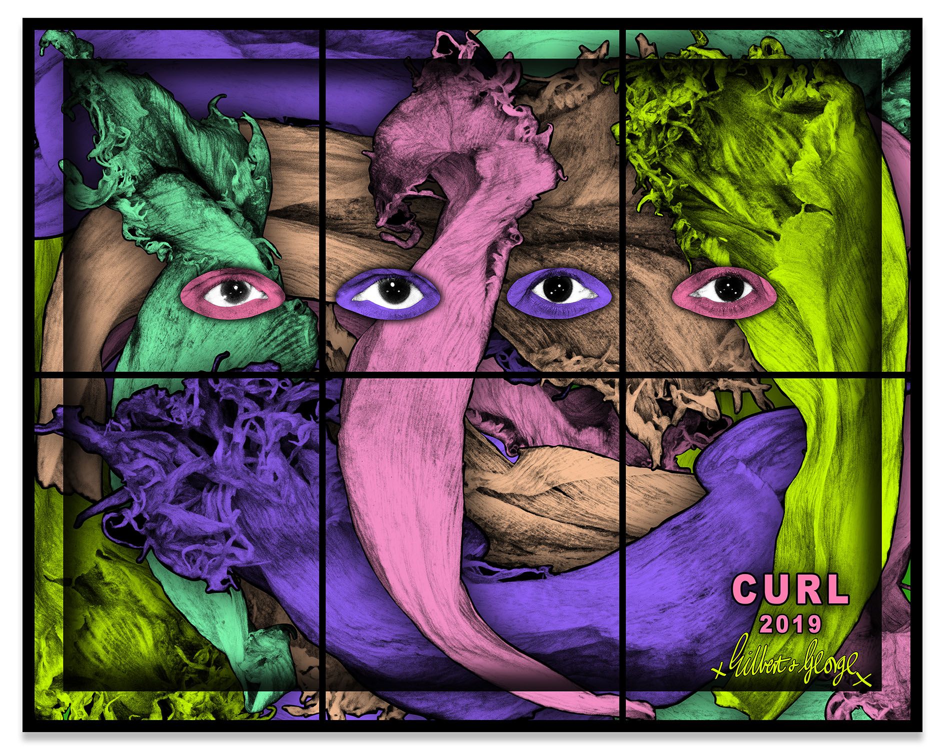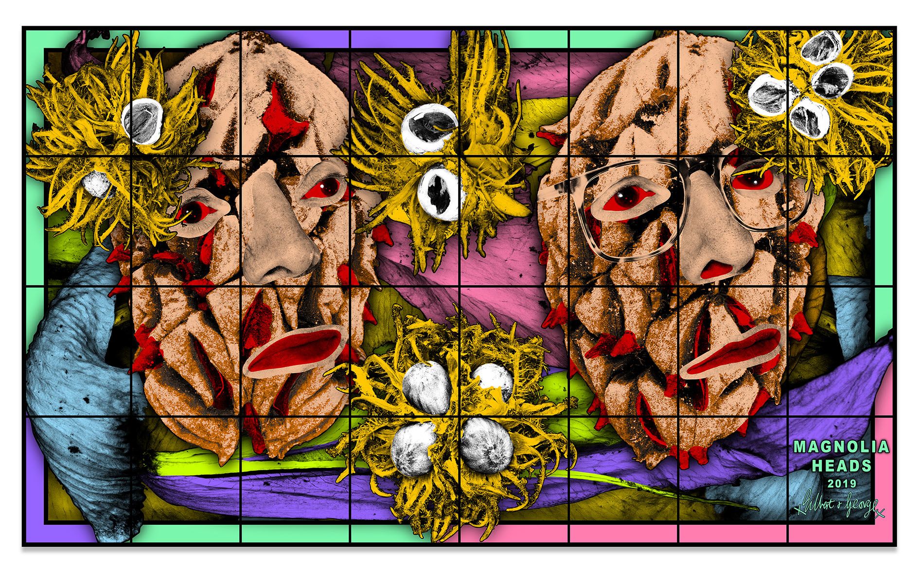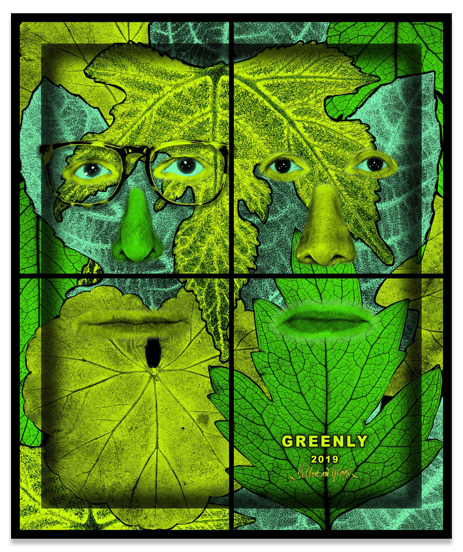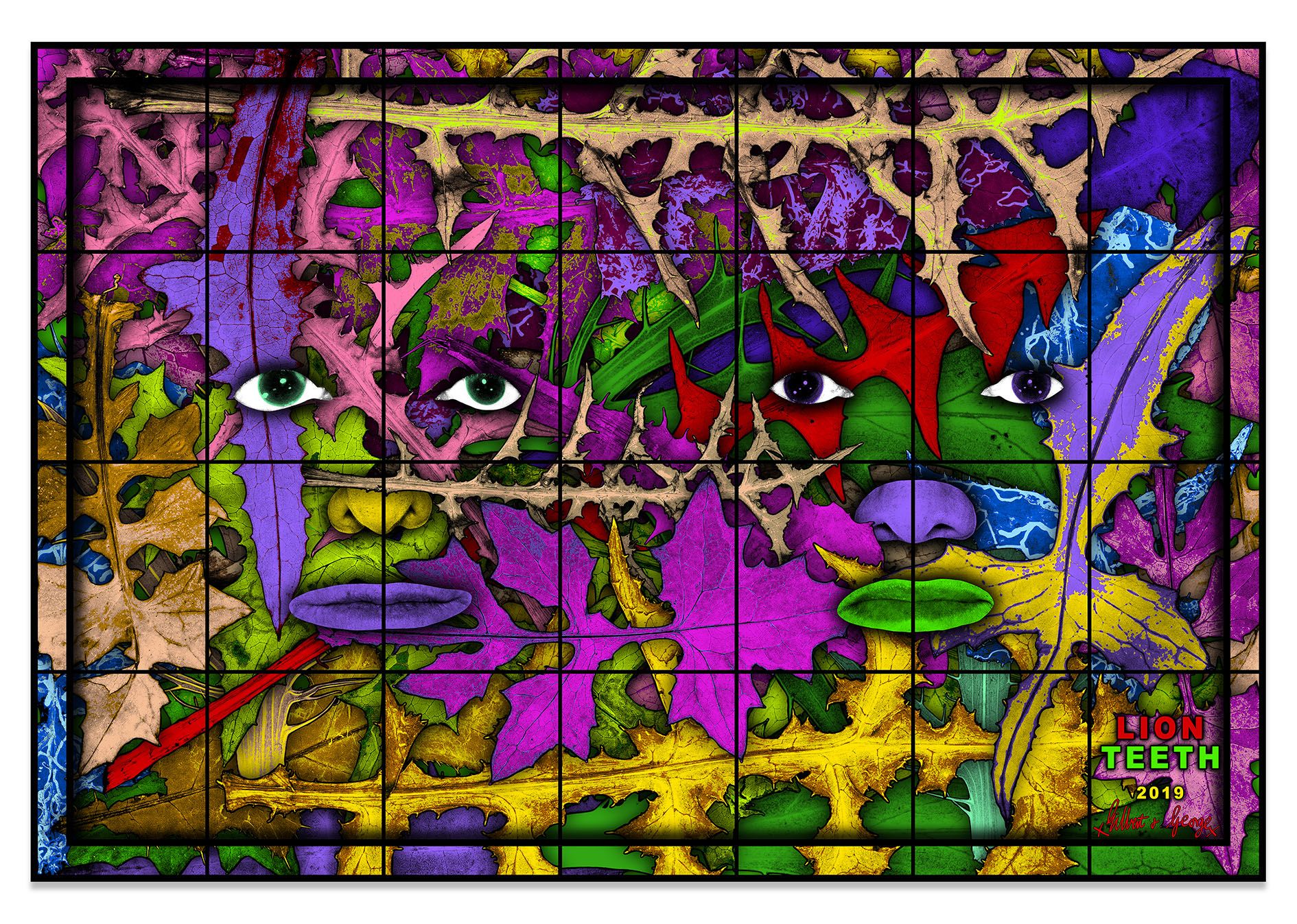 In certain pictures, Gilbert & George seem to merge symbiotically with the natural world. In GREENLY, their disembodied eyes, noses, and mouths emerge, ghost-like, from layers of pressed leaves. Looking directly outward, but not quite catching the viewer’s eye, they appear entranced as they meld with the fields of mint and acid green that surround them. In other pictures the environs engulf the artists, threatening to overtake their tired bodies. The desiccated stamen and petals in REST take on insectile properties, reaching toward the artists as they lie uncomfortably on thick wooden benches. Hardly a typical scene of rest and relaxation, the dried plants’ enlarged scale and grasping tendrils look like something out of a horror movie, while the chromatic display of deep reds and oranges, bright yellows and greens, and electric blues, purples and pinks add an incongruous rainbow of optimism to the fraught scene.