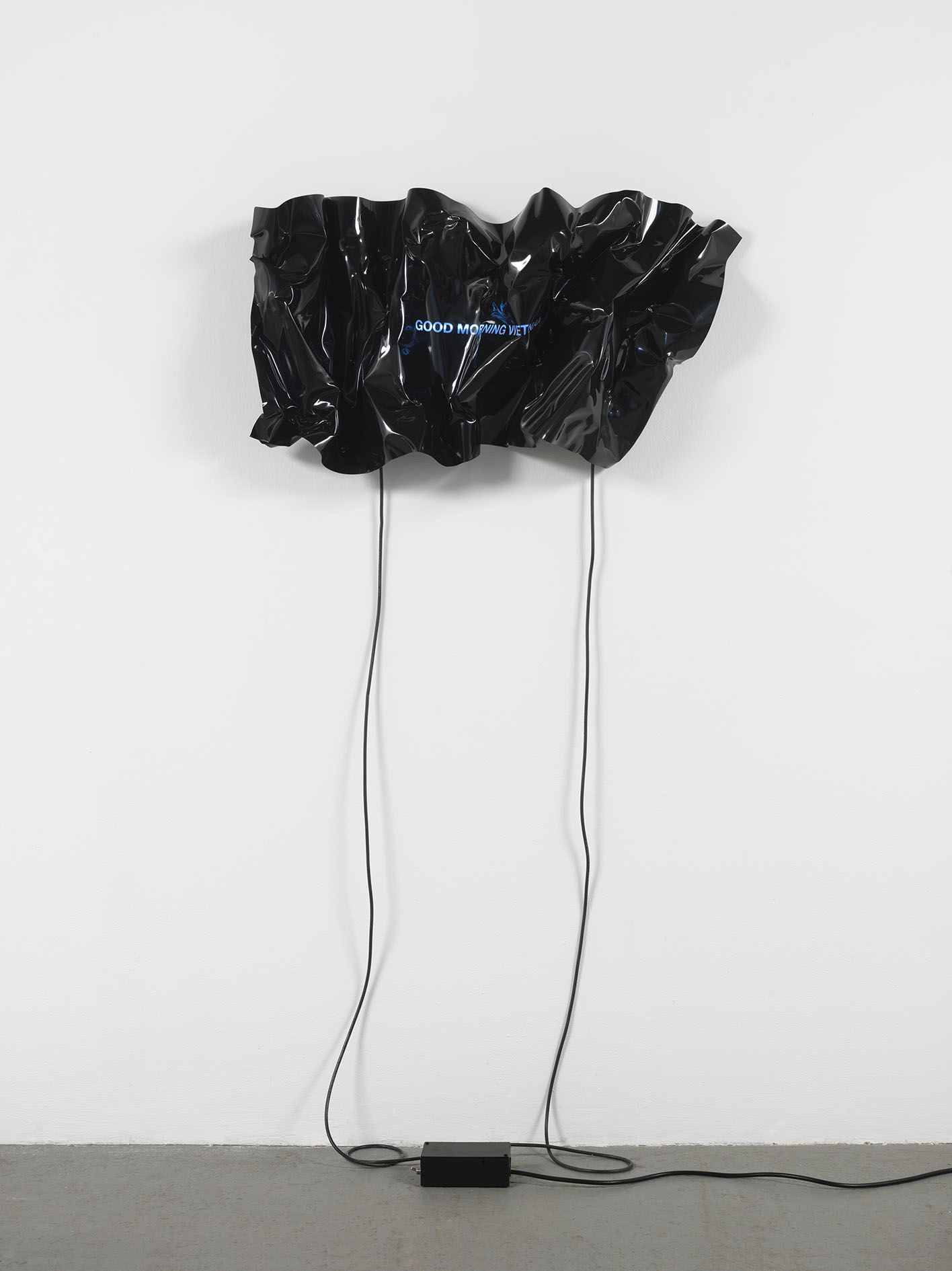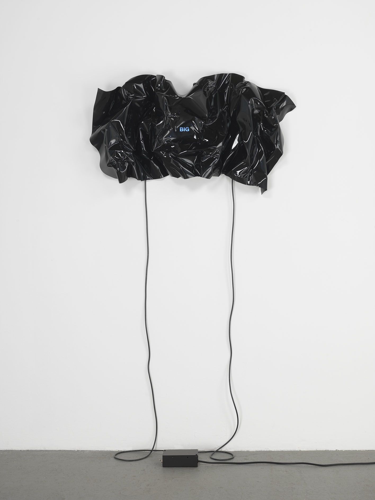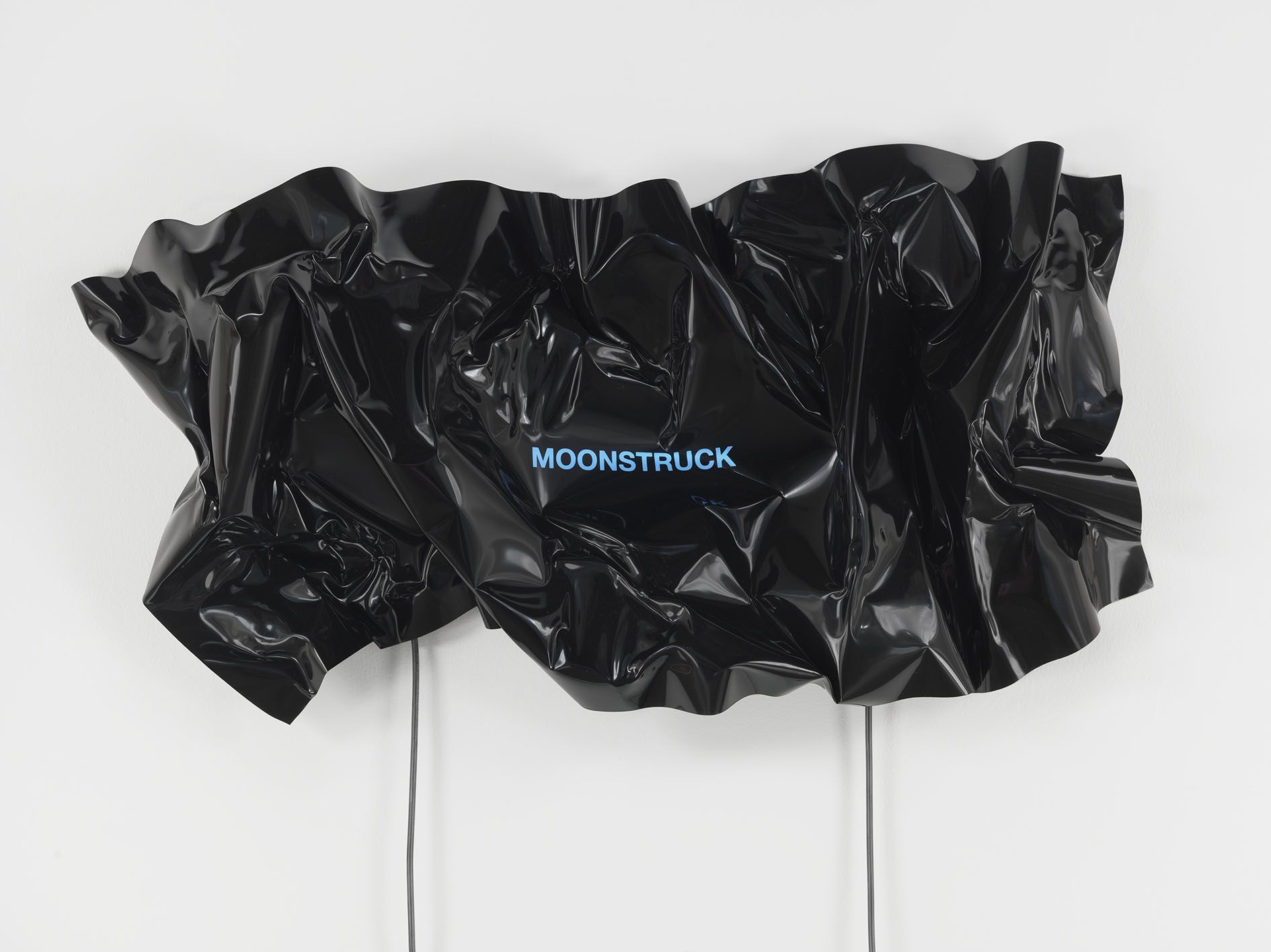 As in 1989, the vinyl works are presented alongside a brushed steel and film sculpture from the same year, Untitled (X Floor Piece)—all shown here for the first time since their original exhibition. Utilising the brushed finish and hard geometric forms of corporate architecture, Bender created compelling steel pyramids, which she then buried under a pile of discarded 35mm film—presciently symbolising a civilisation drowning in content.