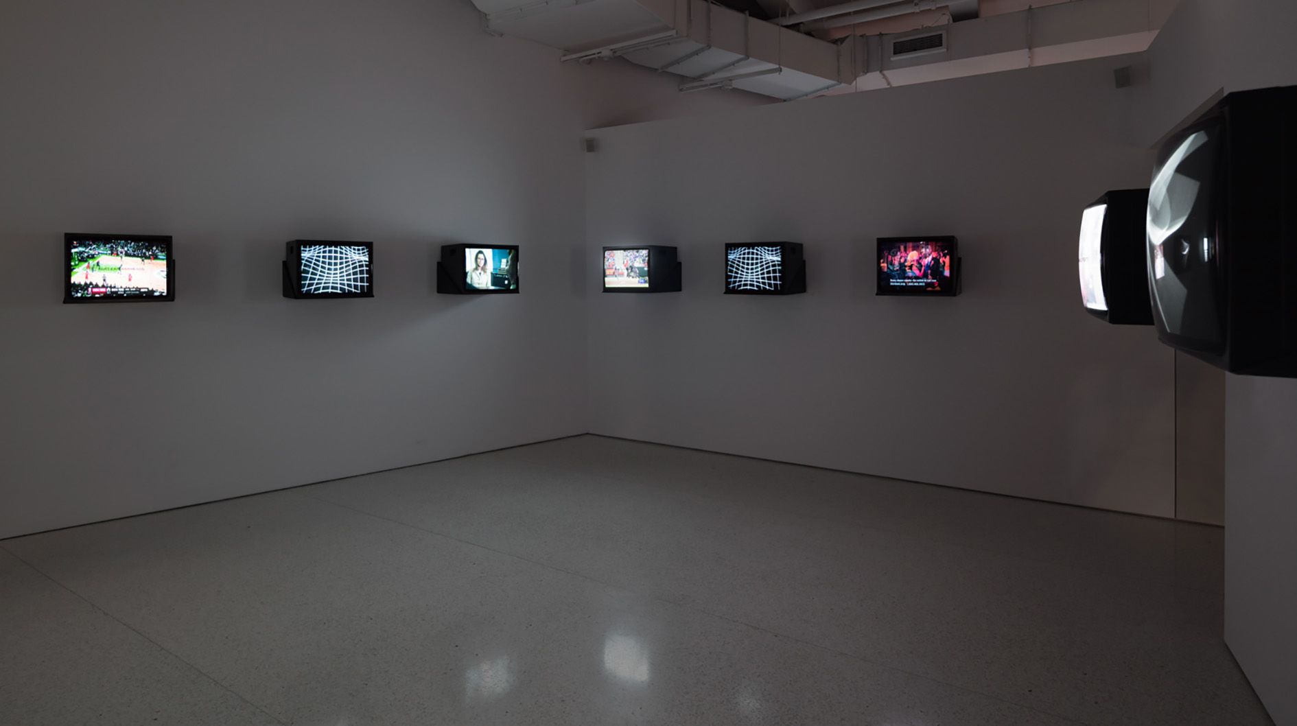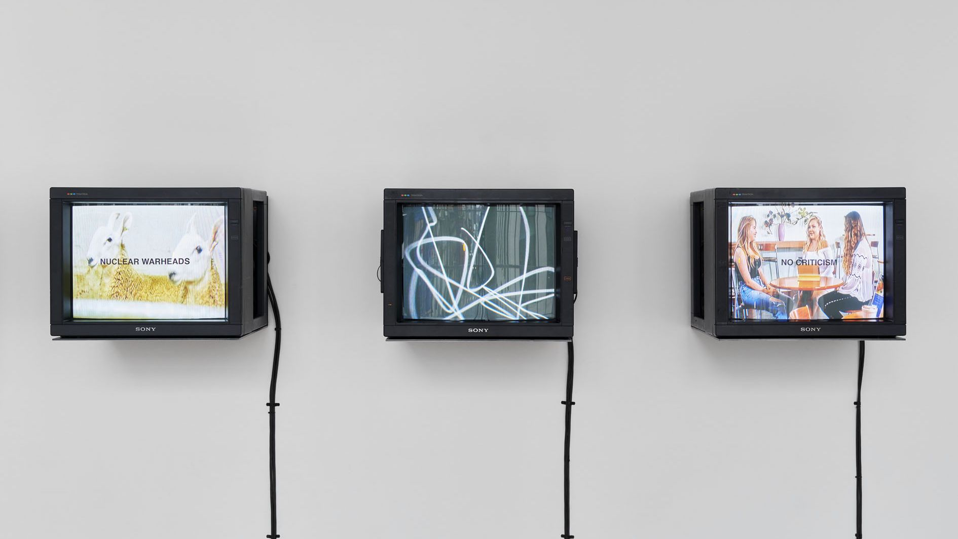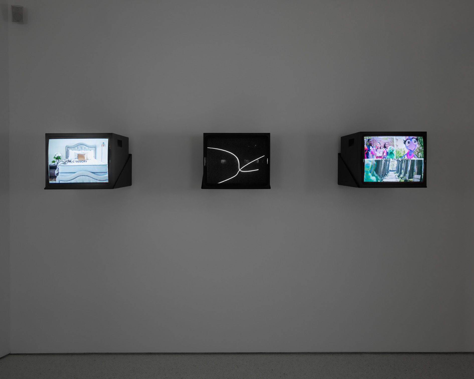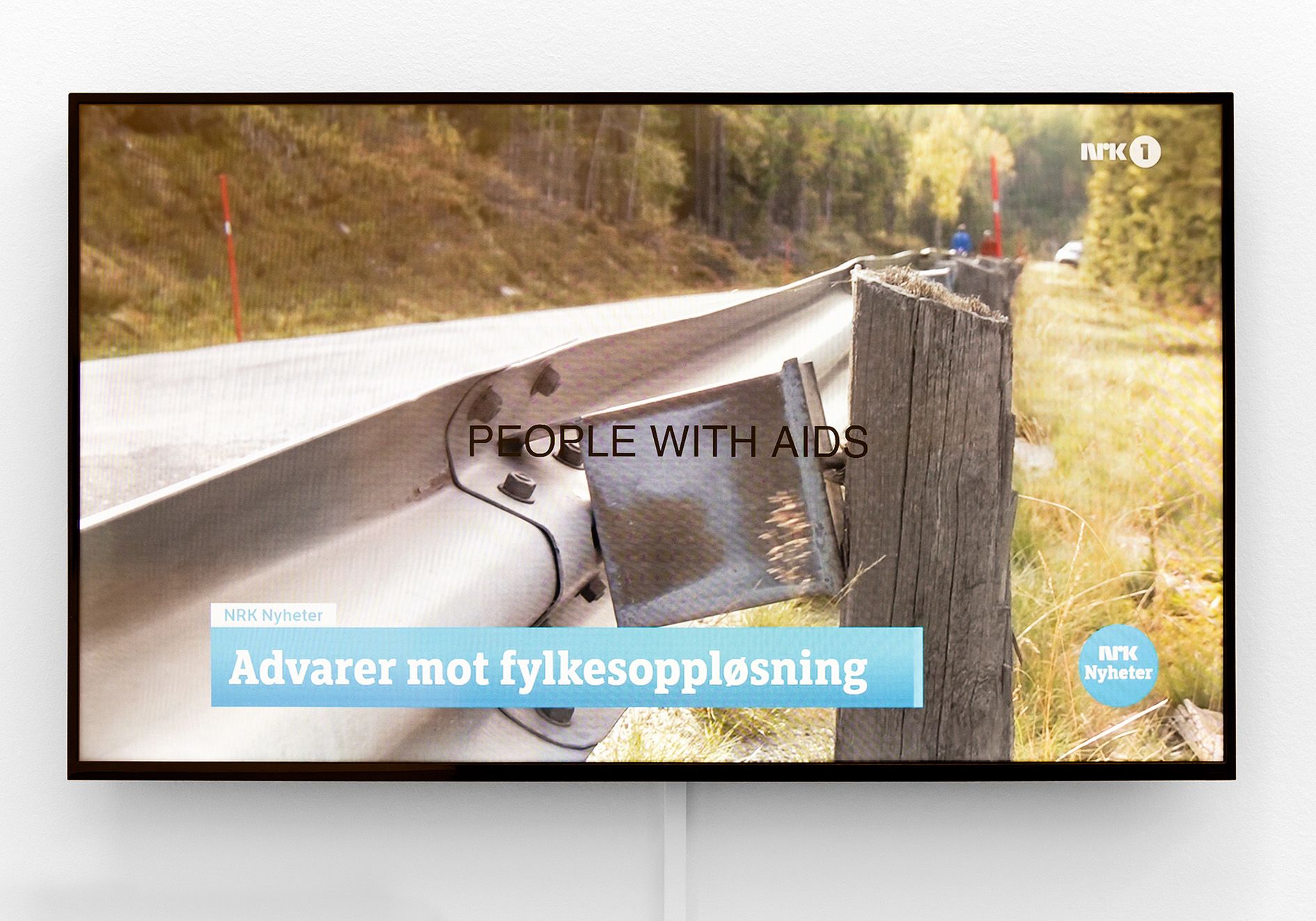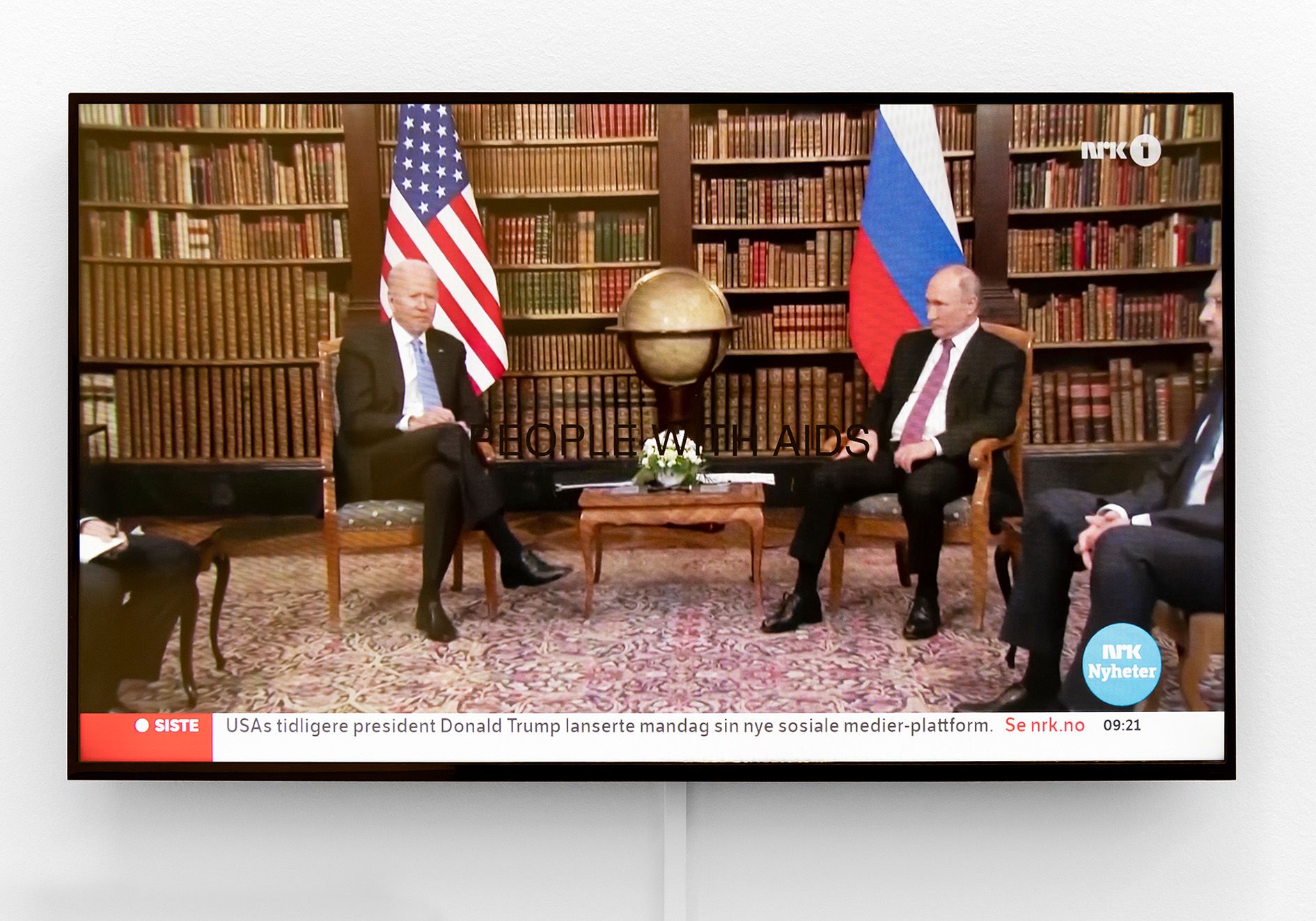 Live television broadcast on a monitor, vinyl lettering