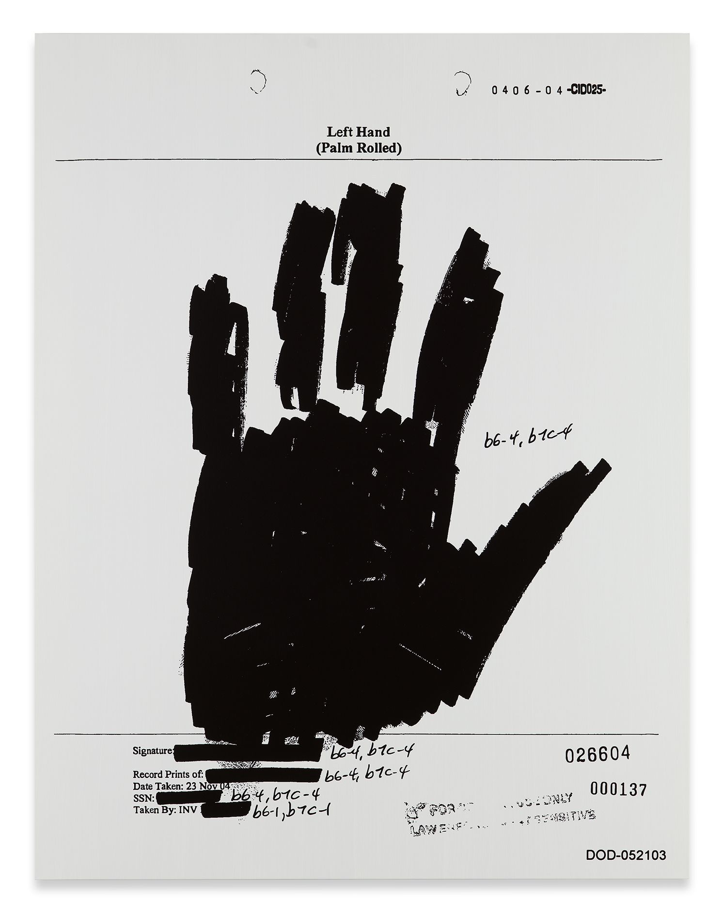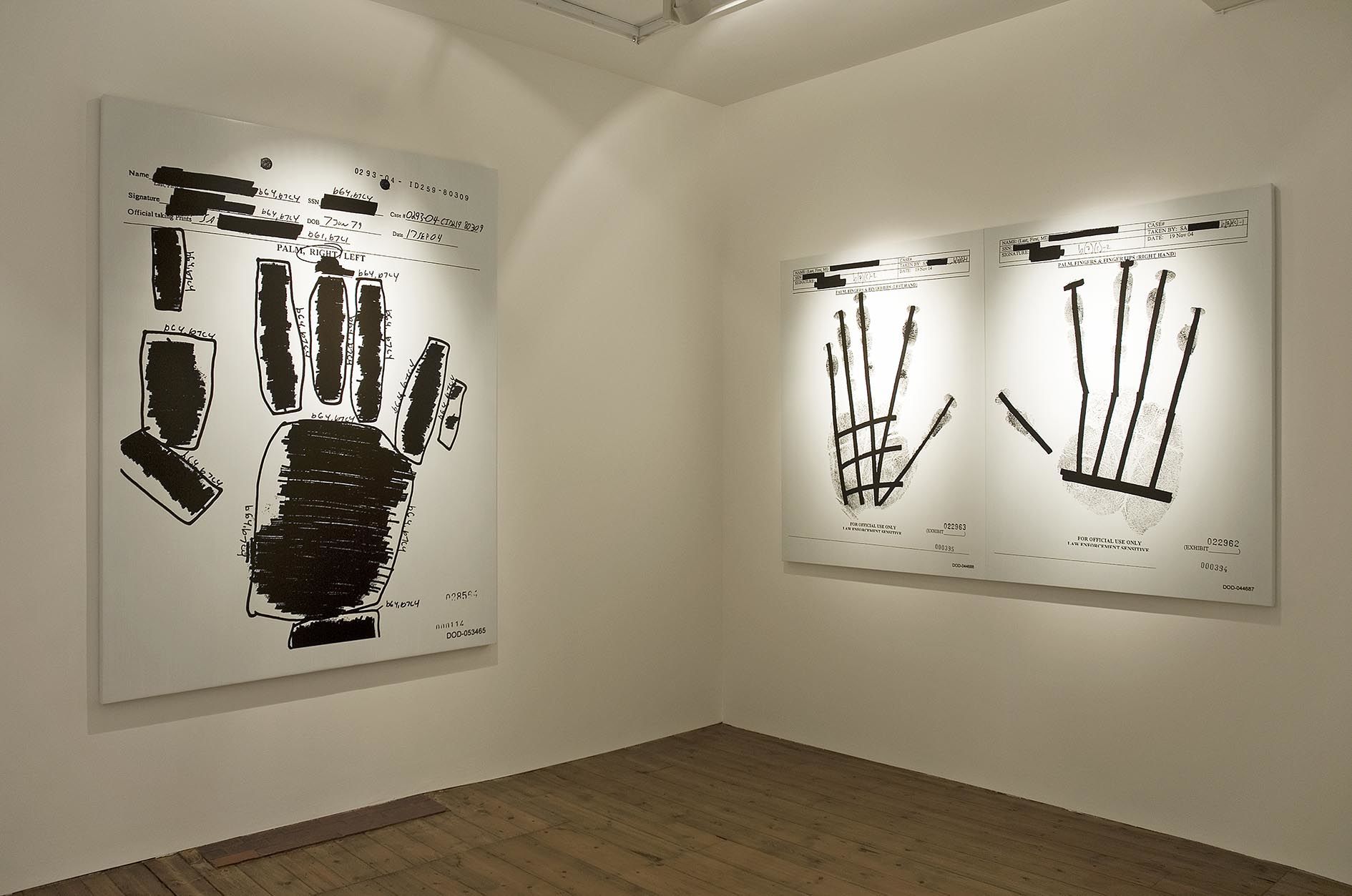 In Detained, Holzer exhibits new works including a series of paintings and a large LED configuration. Each oil on linen painting depicts a handprint of an American soldier accused of crimes in Iraq, including detainee abuse and assault. Culled from documents made public through the Freedom of Information Act, Holzer’s paintings refuse to be read from the fixity of any one ideology. Hanging the hands of the charged next to those of the wrongly accused and those whose culpability has been lost, the artist represents the fog of war. In her LED artwork, Holzer stacks ten semi-circular signs to animate the front gallery wall. The piece, entitled Torso, displays in red, blue, white, and purple light the statements, investigation reports, and emails from the case files of the accused soldiers. Providing these voices, part damning, contradictory, sympathetic, banal, anecdotal, and evidentiary, Holzer layers accounts of abuse and blame. The installation lays bare that it is the individual who suffers and confronts the mechanics of politics and war. Detained makes substantial Wisława Szymborska’s lament and statement in her poem “Tortures” that “the body is and is and is and has nowhere to go.”