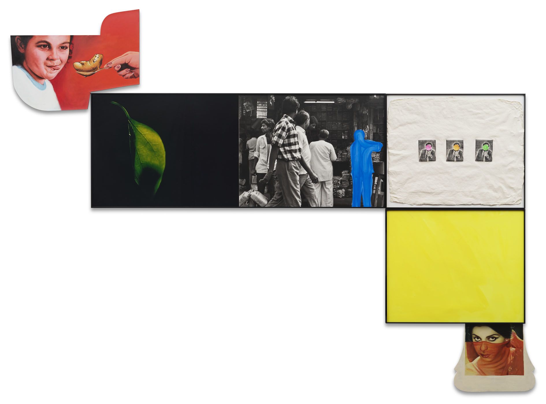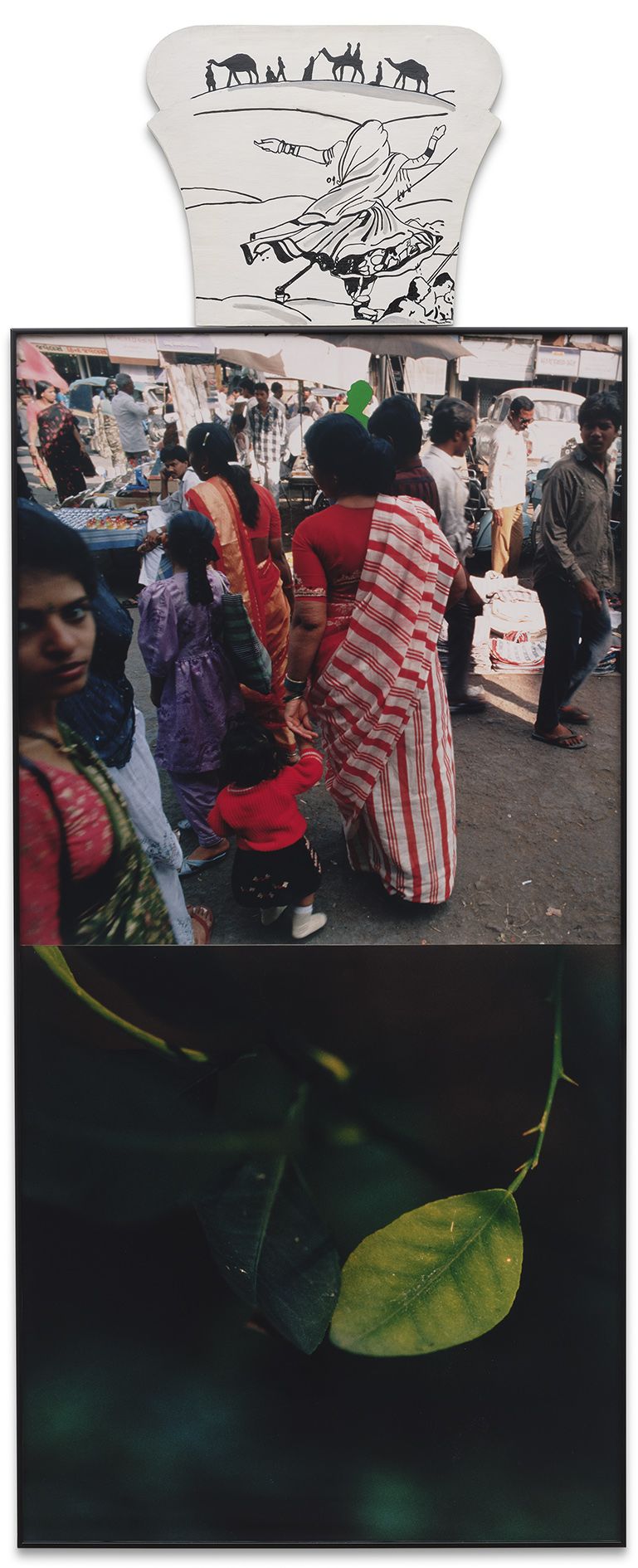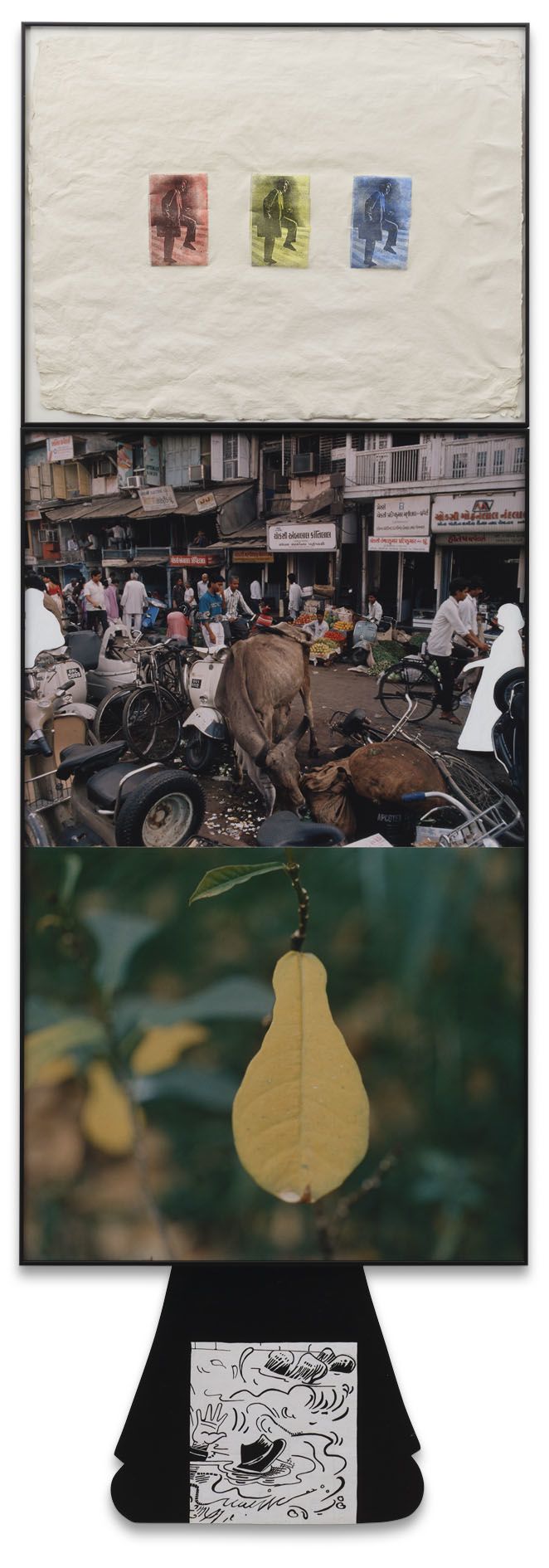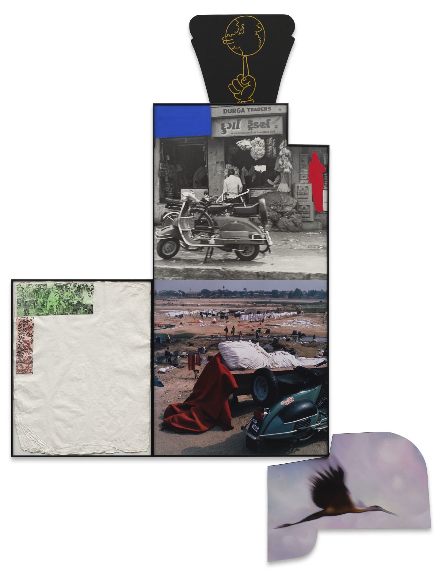 The cleverly devised arrangements of Ahmedabad 1992 document this shift. Here, floating electronics in a futuristic cyberspace point towards the burgeoning technological revolution of the ’90s. There, a sense of motion and transition is reflected in the dominant motifs, including modes of transportation (motorbikes, bicycles, trucks), animals in movement (a cow trotting along the roadside or a bird in flight), and cricket being played or kites being flown. Also at constant play in the series is the alternating and interlacing of looking and being looked at, with several images either observing the action of street scenes or featuring a subject’s direct gaze, and sometimes both.