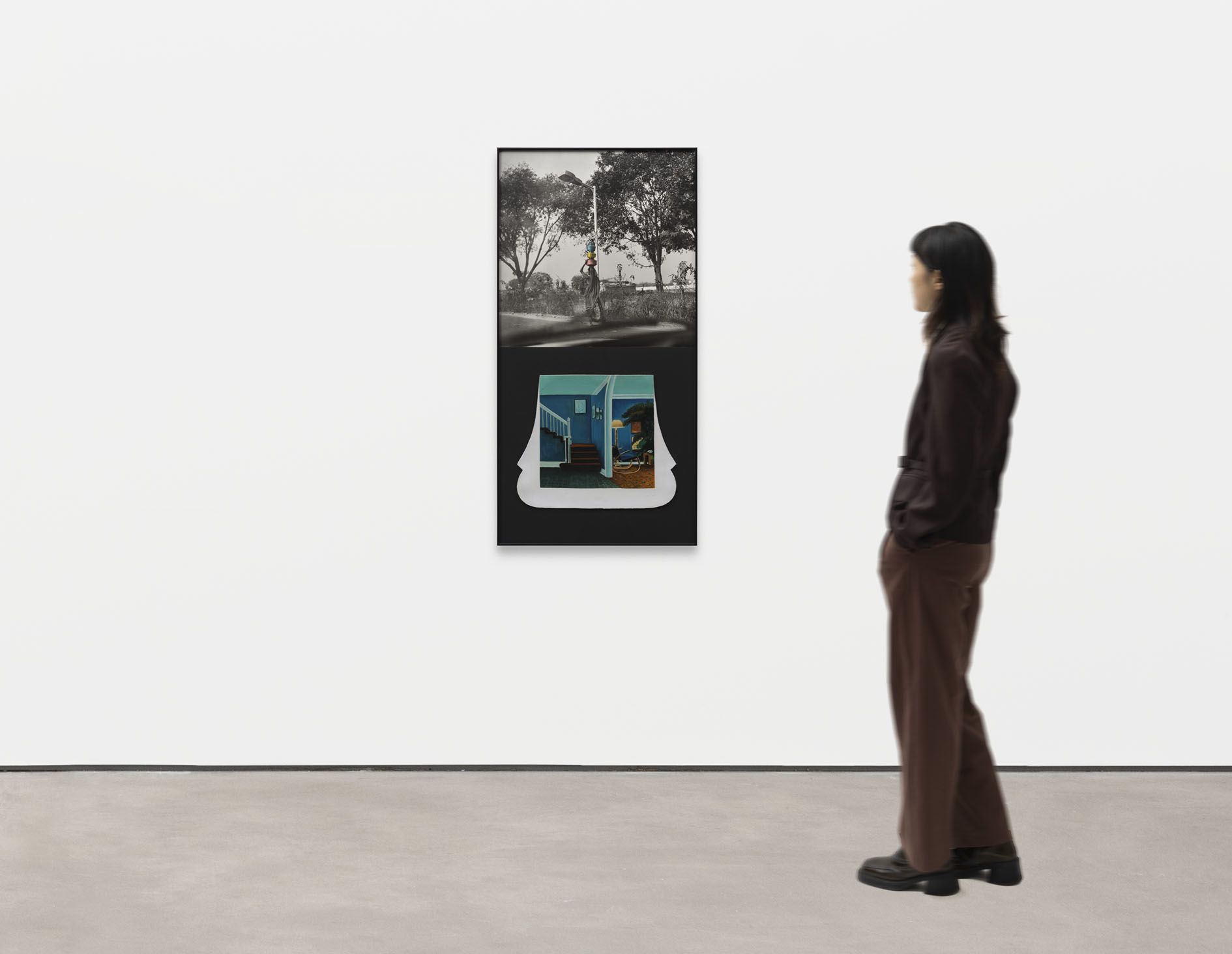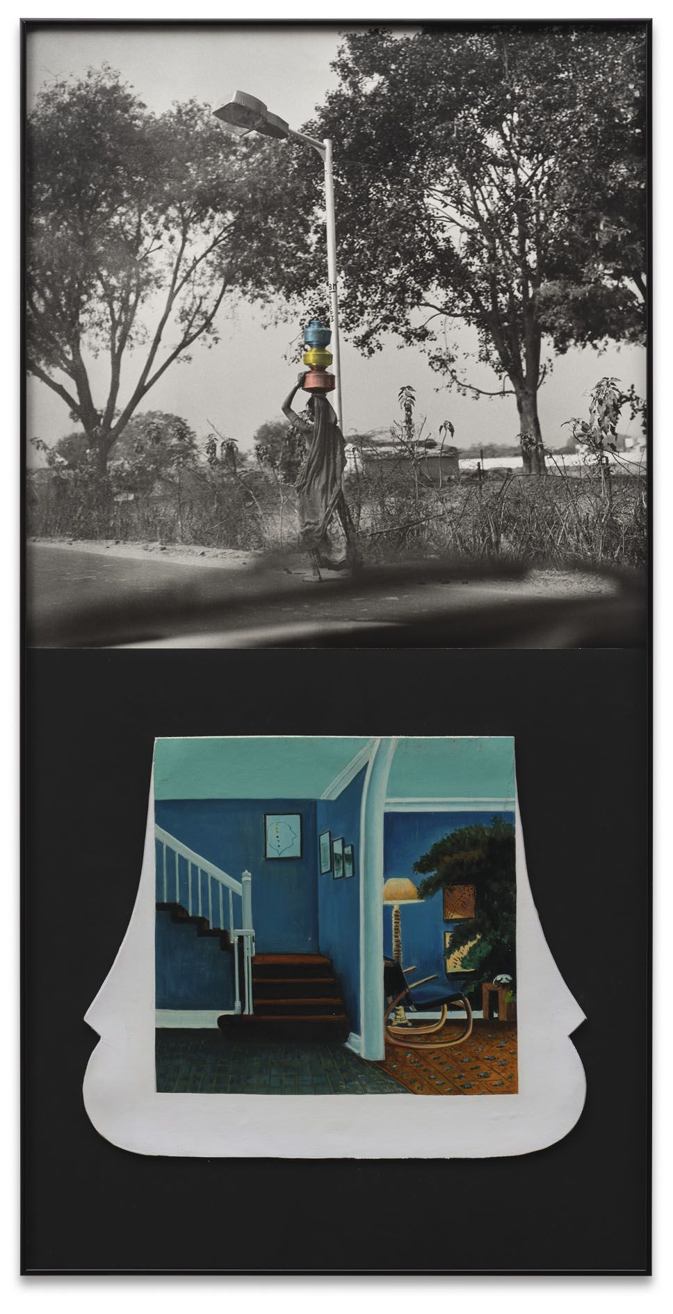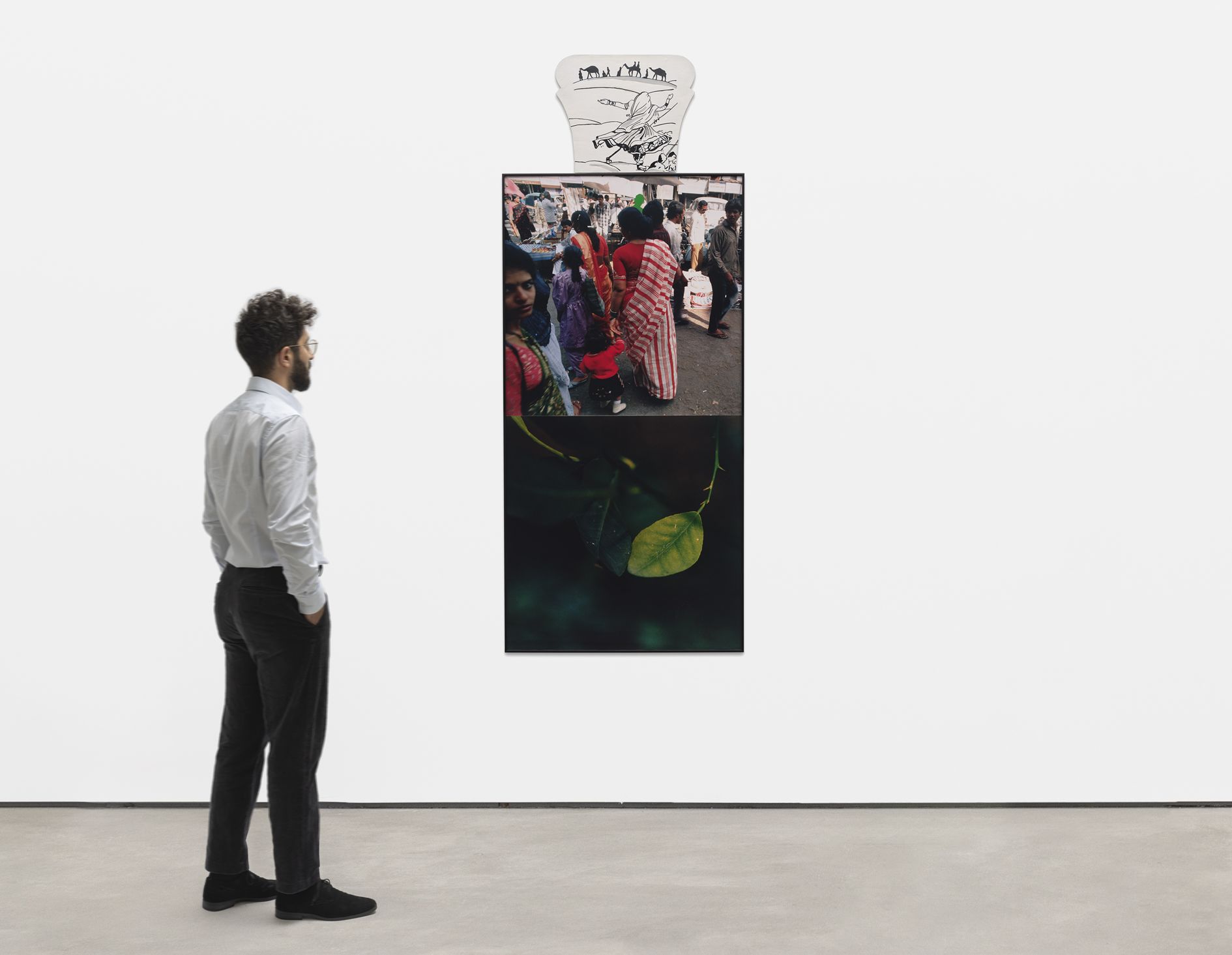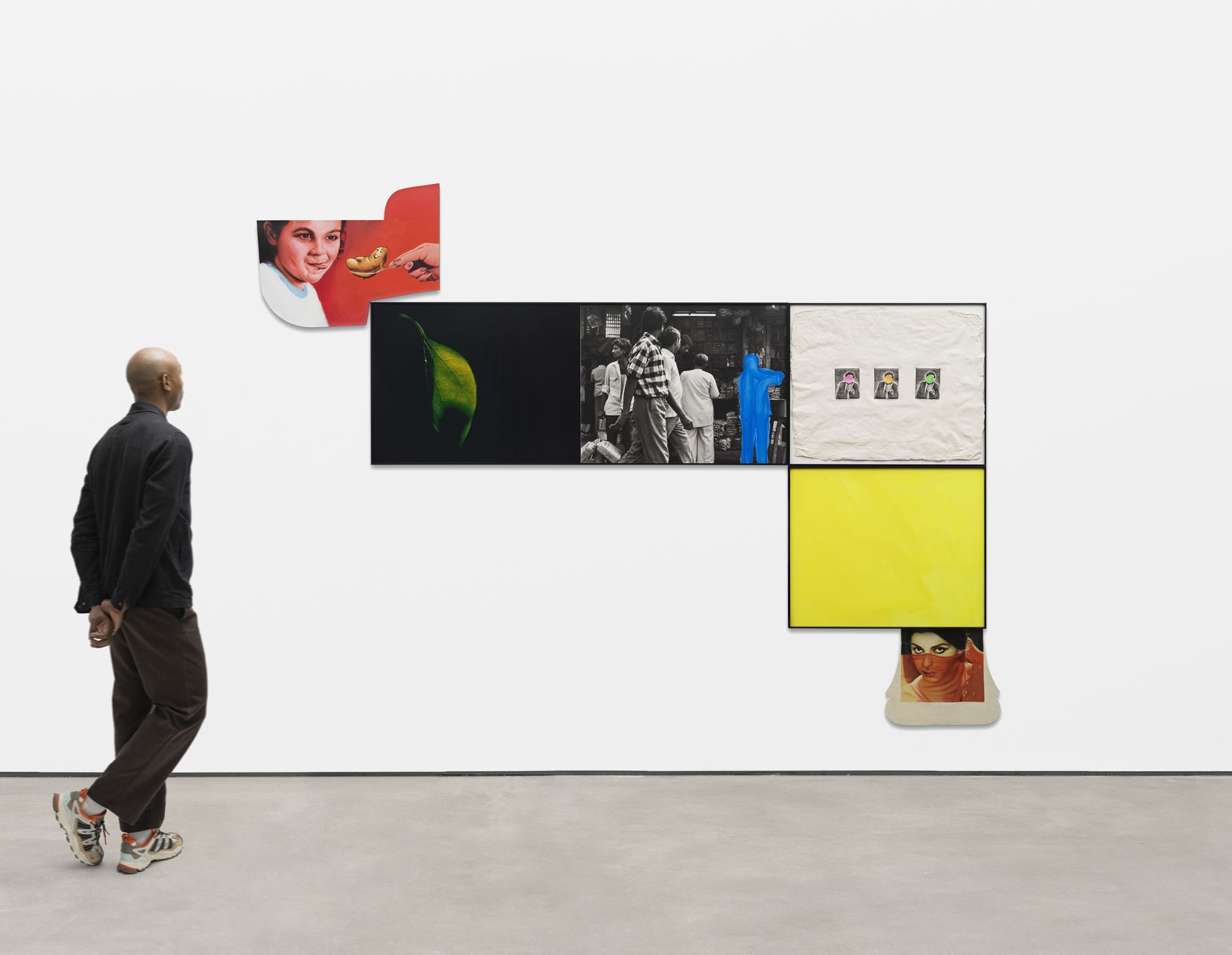 The cleverly devised arrangements of Ahmedabad 1992 document this shift. Here, floating electronics in a futuristic cyberspace point towards the burgeoning technological revolution of the ’90s. There, a sense of motion and transition is reflected in the dominant motifs, including modes of transportation (motorbikes, bicycles, trucks), animals in movement (a cow trotting along the roadside or a bird in flight), and cricket being played or kites being flown. Also at constant play in the series is the alternating and interlacing of looking and being looked at, with several images either observing the action of street scenes or featuring a subject’s direct gaze, and sometimes both.