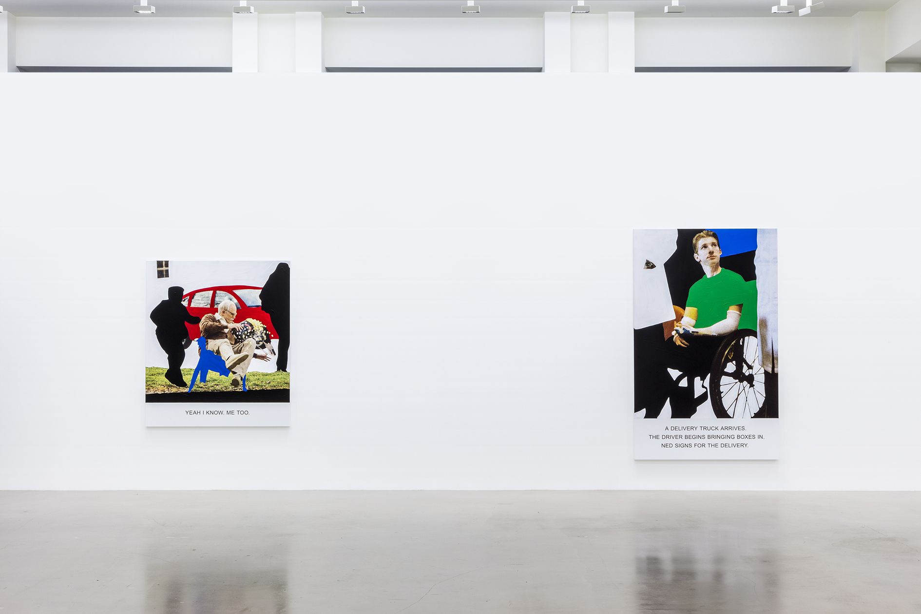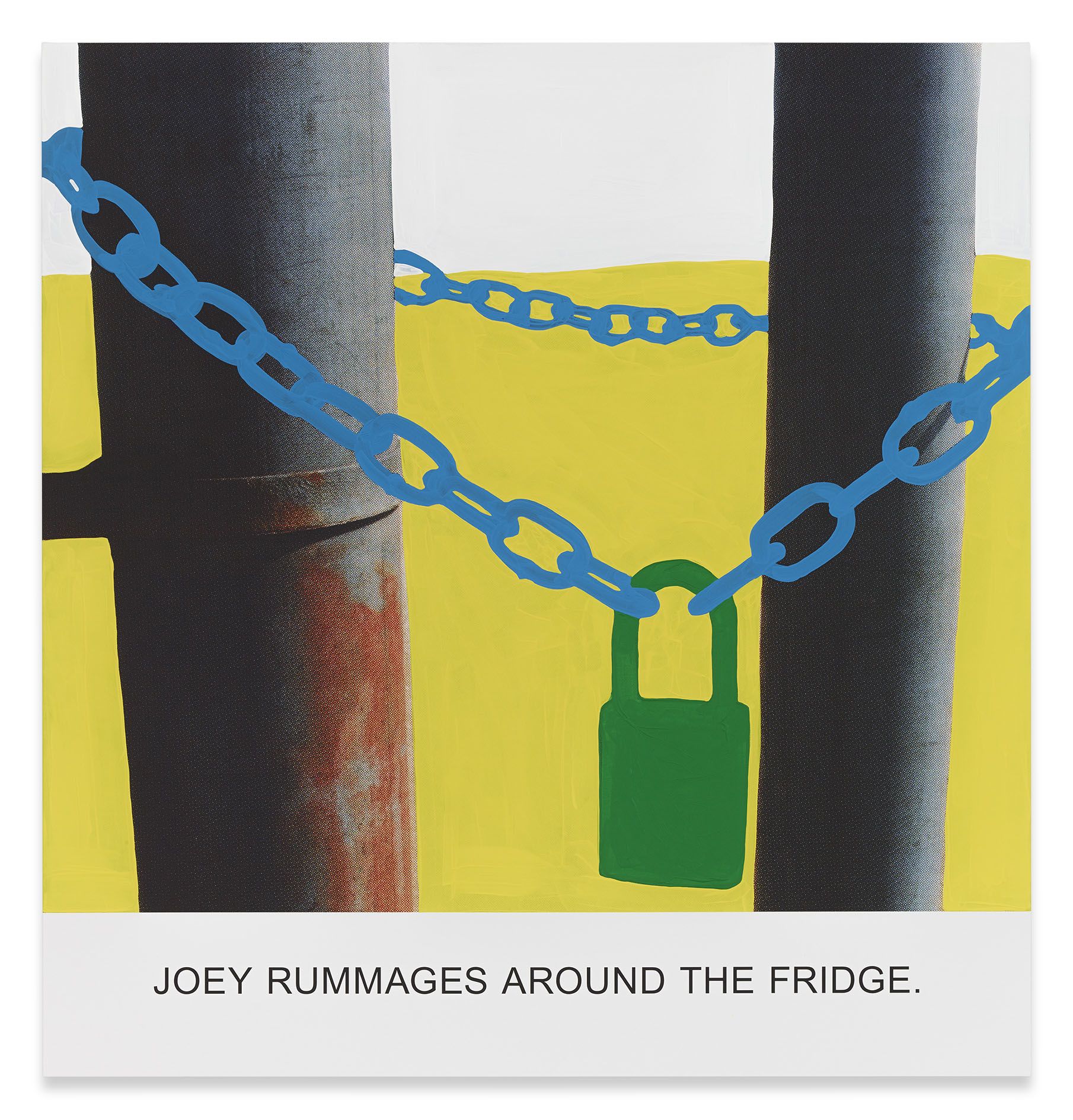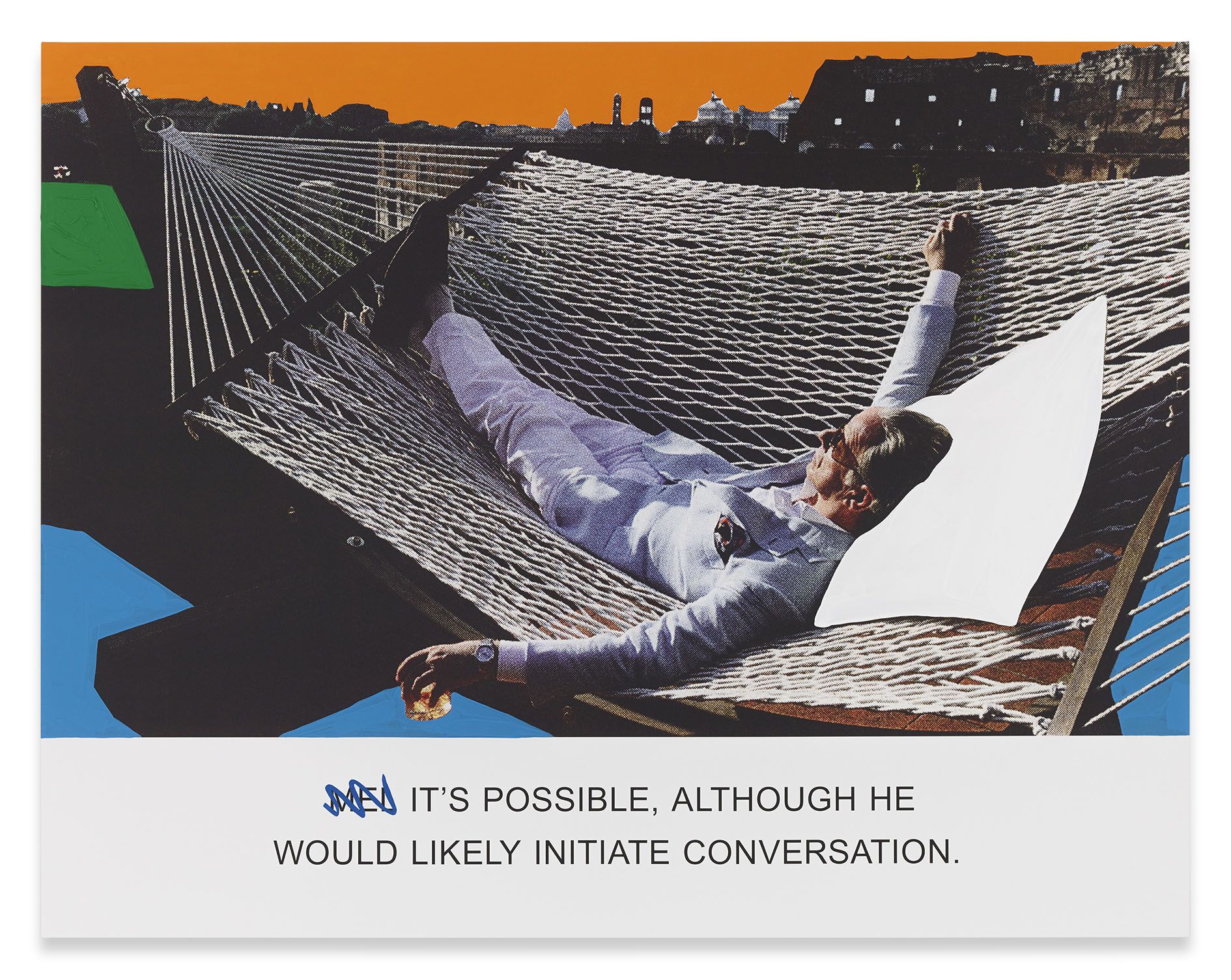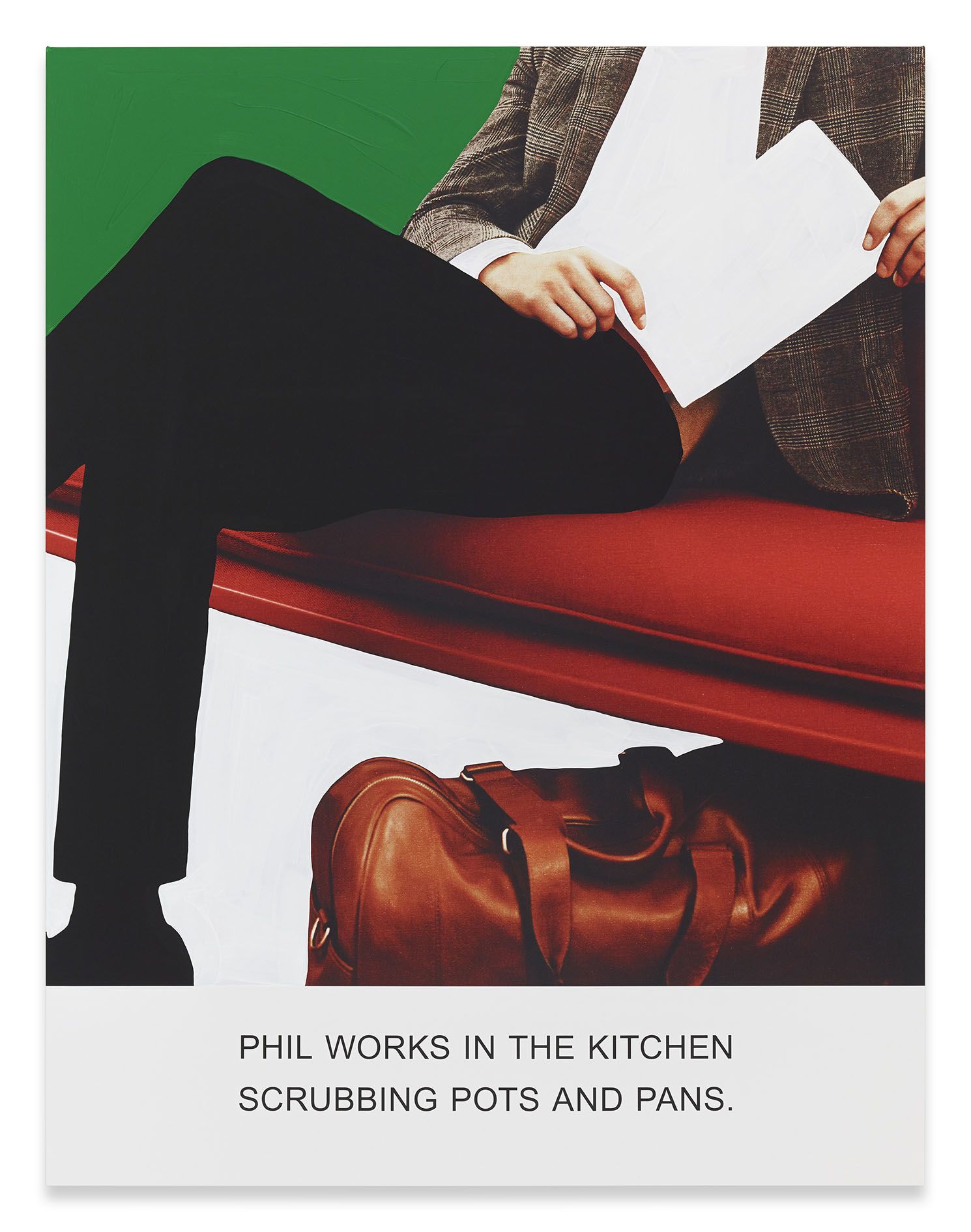 Featuring banal found photographs, altered with his trademark blocks of rich colour, accompanied by equally banal snippets of text that appear like captions beneath the images, the new paintings present the viewer with a pleasing conundrum. Text and image are sutured together on the picture plane, yet the viewer will struggle to find any useful correspondence between them. In Ben's Jacket Drapes..., we see, from behind, a woman reclining in a chair situated on blacked-out beach, while she seems to gaze out at a tropical seascape in the background. The text reads 'BEN’S JACKET DRAPES PERFECTLY OVER HIS SHOULDERS'. The arresting disjunction between text and image opens up an enormous gulf for the viewer’s imagination. The picture breaks off from one space into another, with the text offering its own distinct image, creating a double register not unlike counterpoint in a musical composition. The words are unlikely to reflect the thoughts of the woman lounging on the beach, or mean much else for that matter, and yet they are unavoidable, occupying the base of the picture as if they must signify something. The resulting combination of word and image generates a radically anarchic pictorial space.