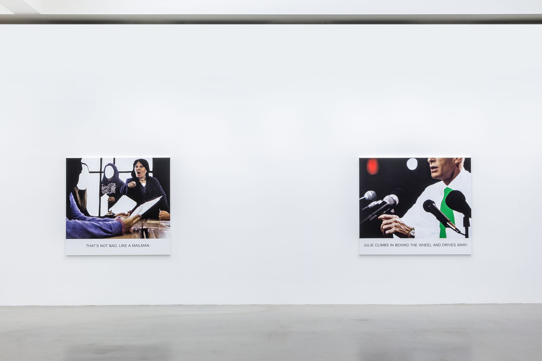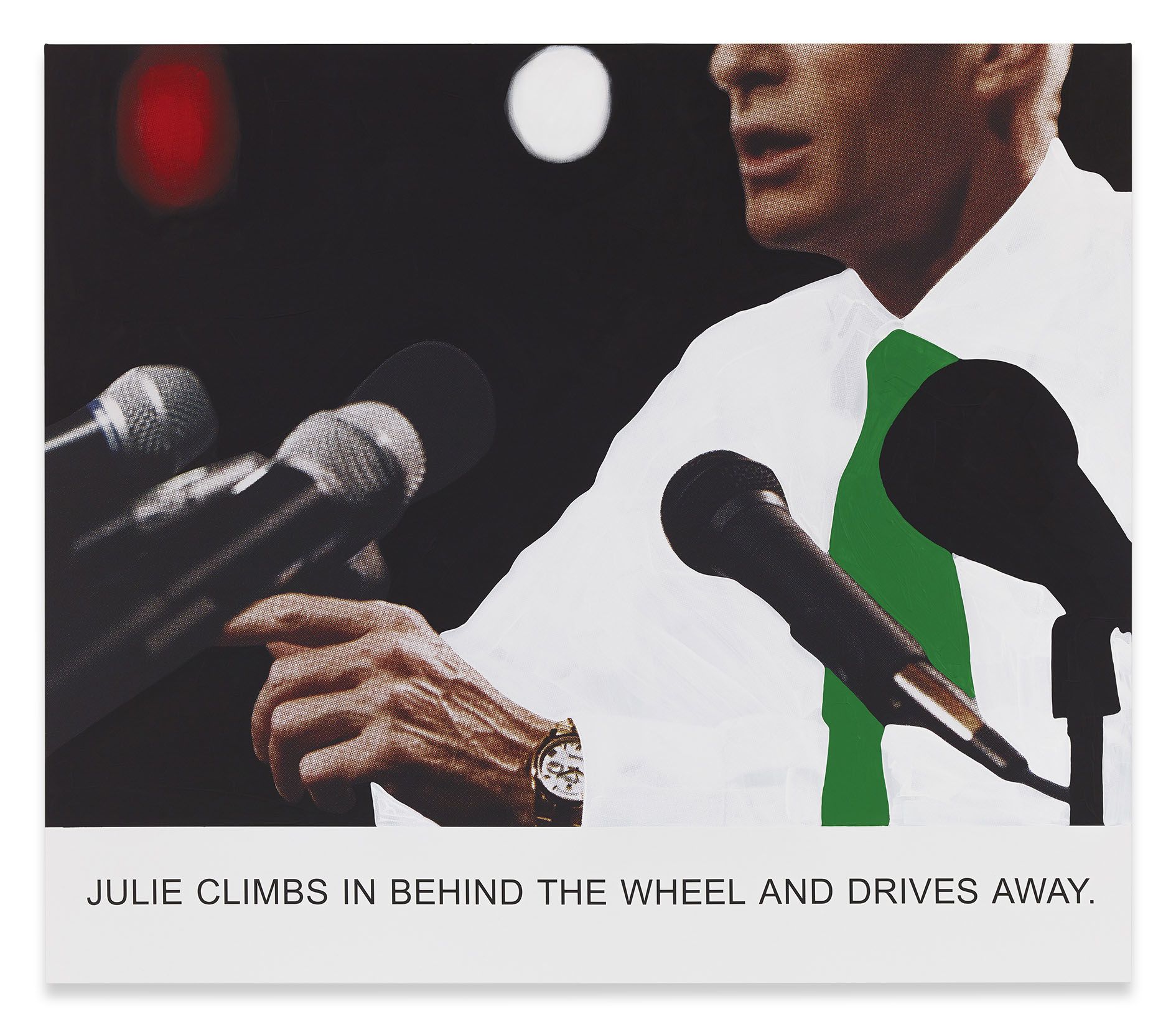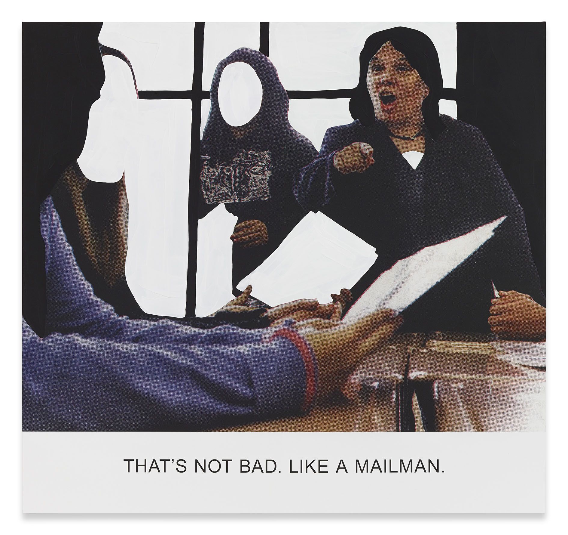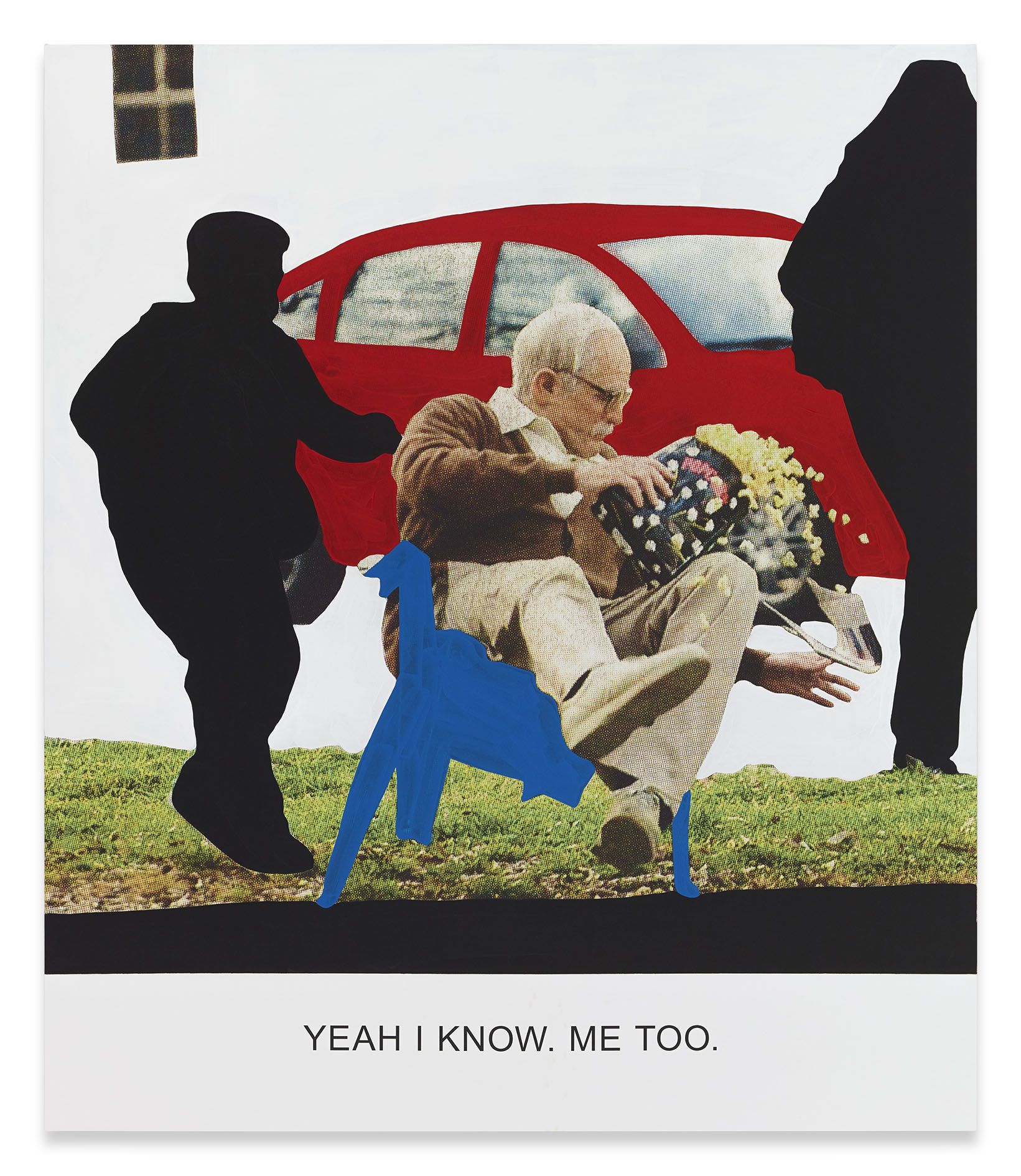 Featuring banal found photographs, altered with his trademark blocks of rich colour, accompanied by equally banal snippets of text that appear like captions beneath the images, the new paintings present the viewer with a pleasing conundrum. Text and image are sutured together on the picture plane, yet the viewer will struggle to find any useful correspondence between them. In Ben's Jacket Drapes..., we see, from behind, a woman reclining in a chair situated on blacked-out beach, while she seems to gaze out at a tropical seascape in the background. The text reads 'BEN’S JACKET DRAPES PERFECTLY OVER HIS SHOULDERS'. The arresting disjunction between text and image opens up an enormous gulf for the viewer’s imagination. The picture breaks off from one space into another, with the text offering its own distinct image, creating a double register not unlike counterpoint in a musical composition. The words are unlikely to reflect the thoughts of the woman lounging on the beach, or mean much else for that matter, and yet they are unavoidable, occupying the base of the picture as if they must signify something. The resulting combination of word and image generates a radically anarchic pictorial space.