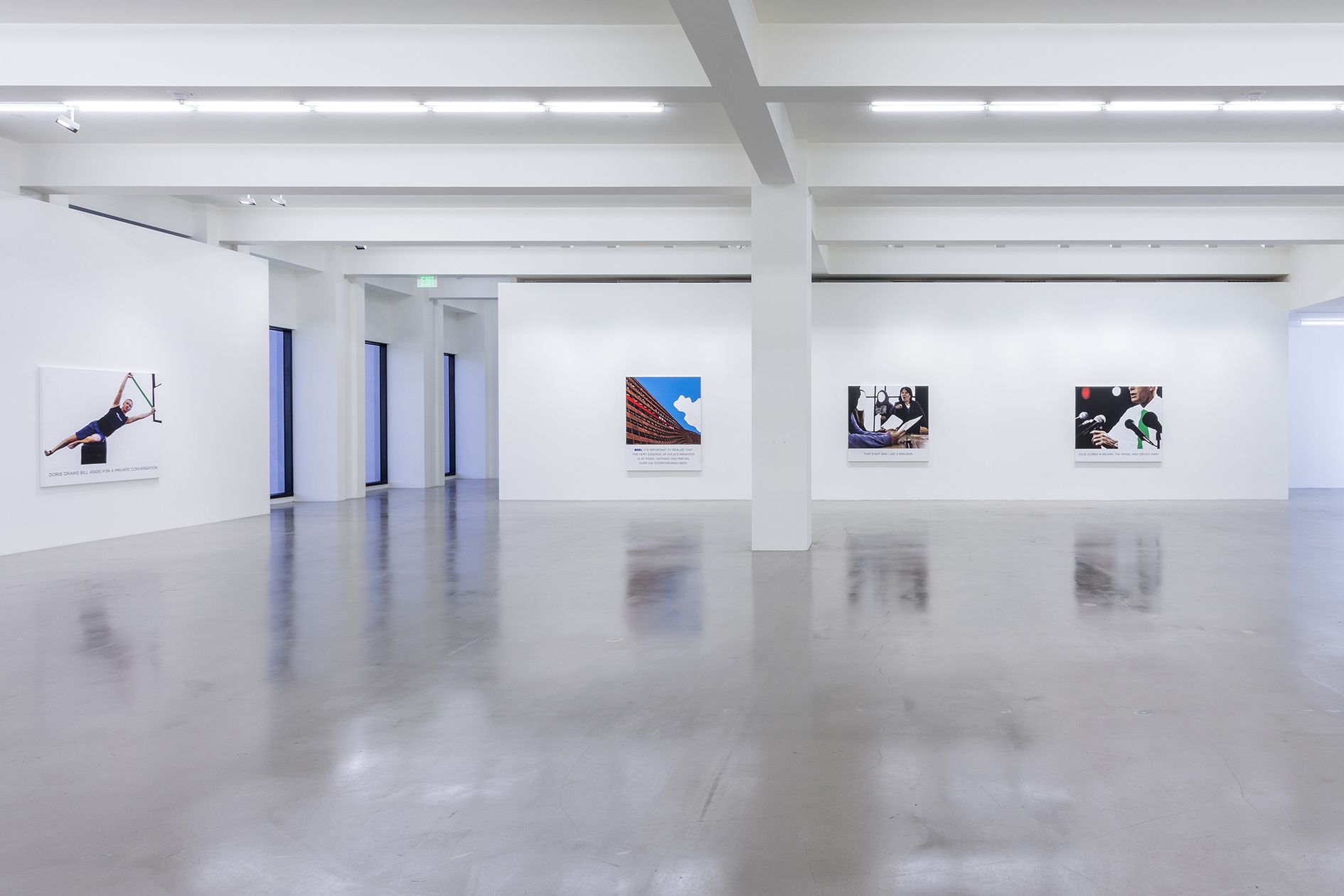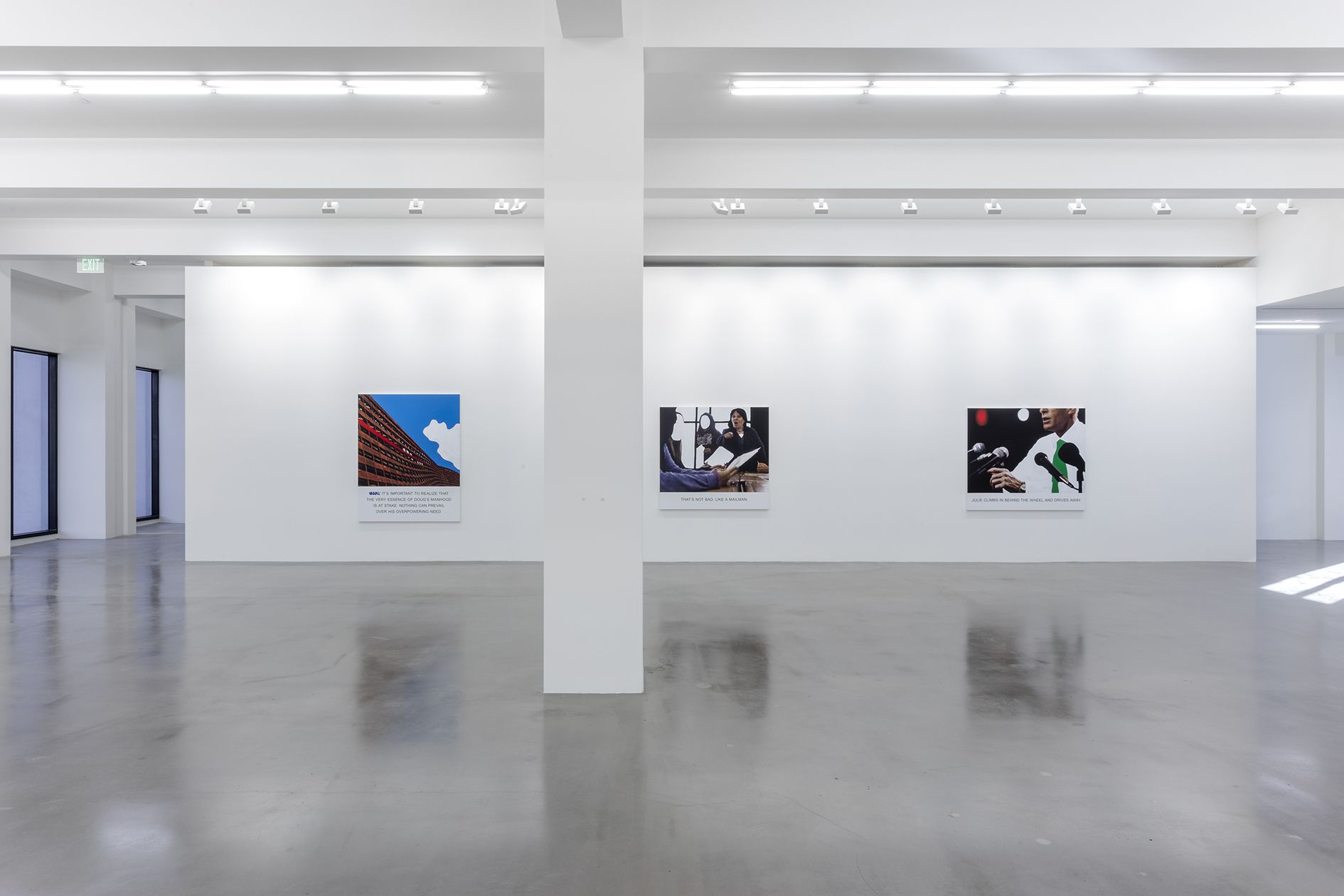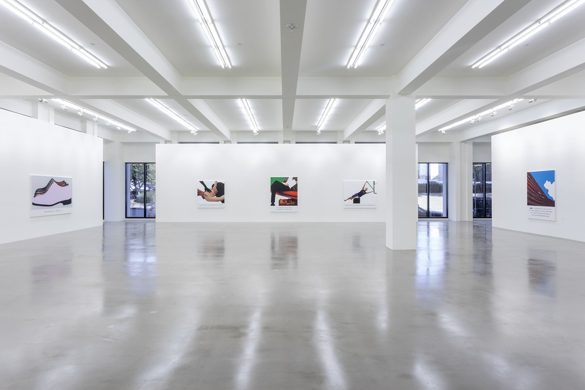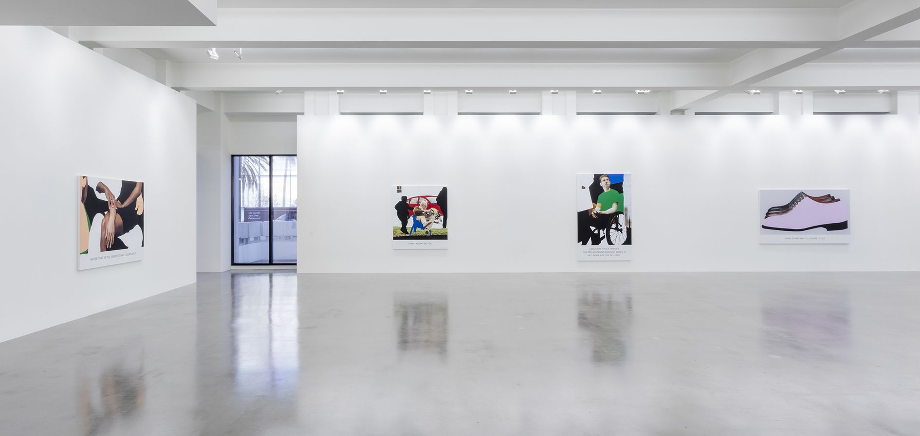 Featuring banal found photographs, altered with his trademark blocks of rich colour, accompanied by equally banal snippets of text that appear like captions beneath the images, the new paintings present the viewer with a pleasing conundrum. Text and image are sutured together on the picture plane, yet the viewer will struggle to find any useful correspondence between them. In Ben's Jacket Drapes..., we see, from behind, a woman reclining in a chair situated on blacked-out beach, while she seems to gaze out at a tropical seascape in the background. The text reads 'BEN’S JACKET DRAPES PERFECTLY OVER HIS SHOULDERS'. The arresting disjunction between text and image opens up an enormous gulf for the viewer’s imagination. The picture breaks off from one space into another, with the text offering its own distinct image, creating a double register not unlike counterpoint in a musical composition. The words are unlikely to reflect the thoughts of the woman lounging on the beach, or mean much else for that matter, and yet they are unavoidable, occupying the base of the picture as if they must signify something. The resulting combination of word and image generates a radically anarchic pictorial space.