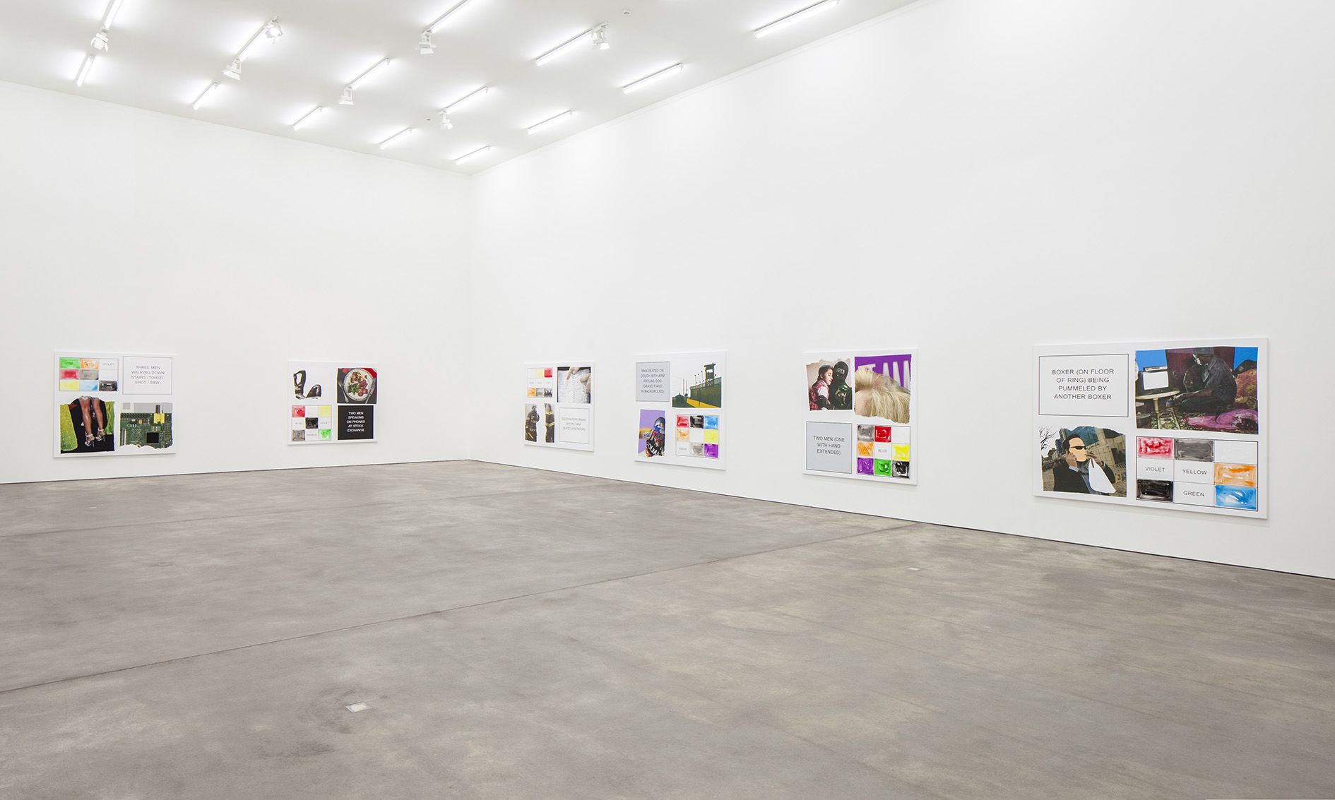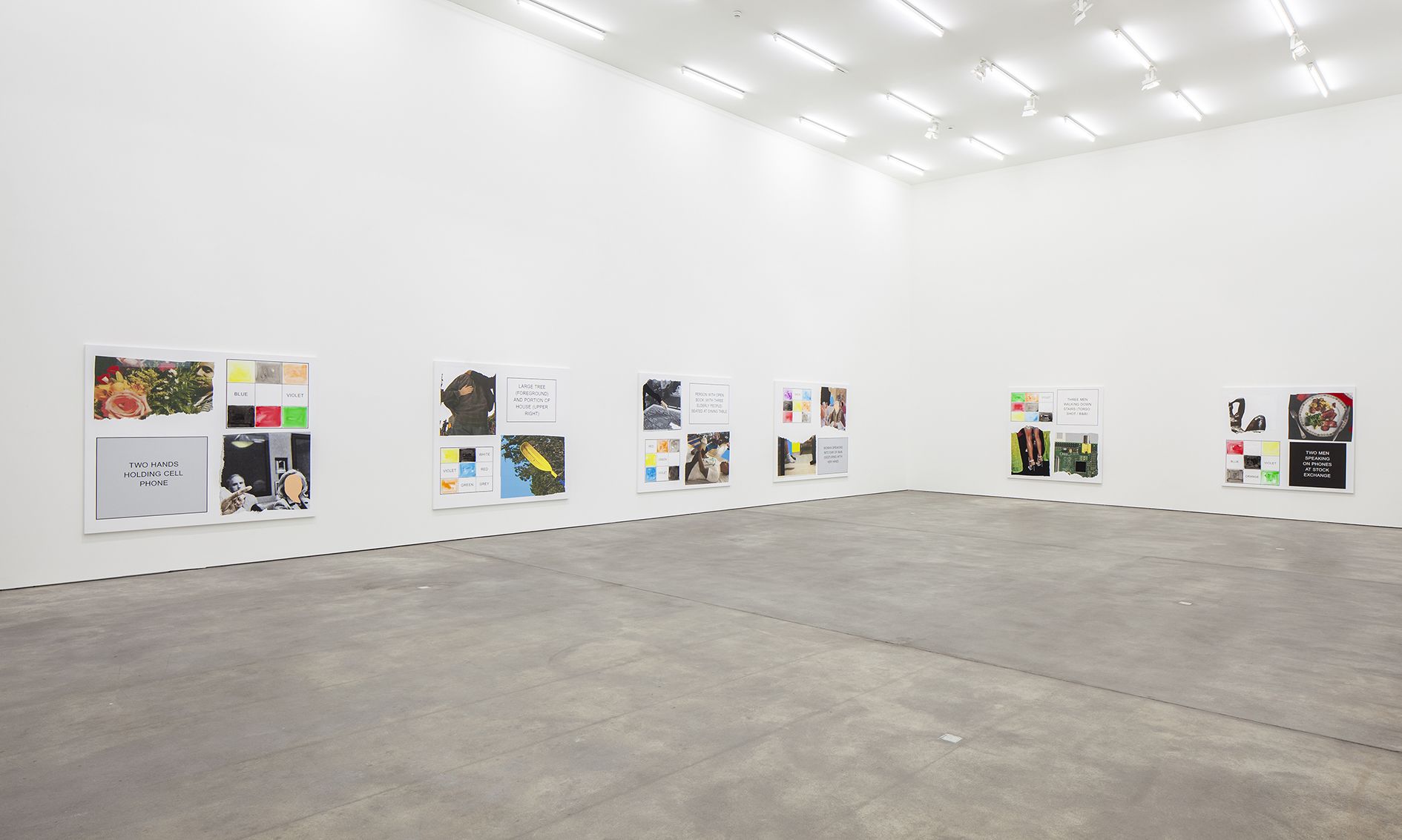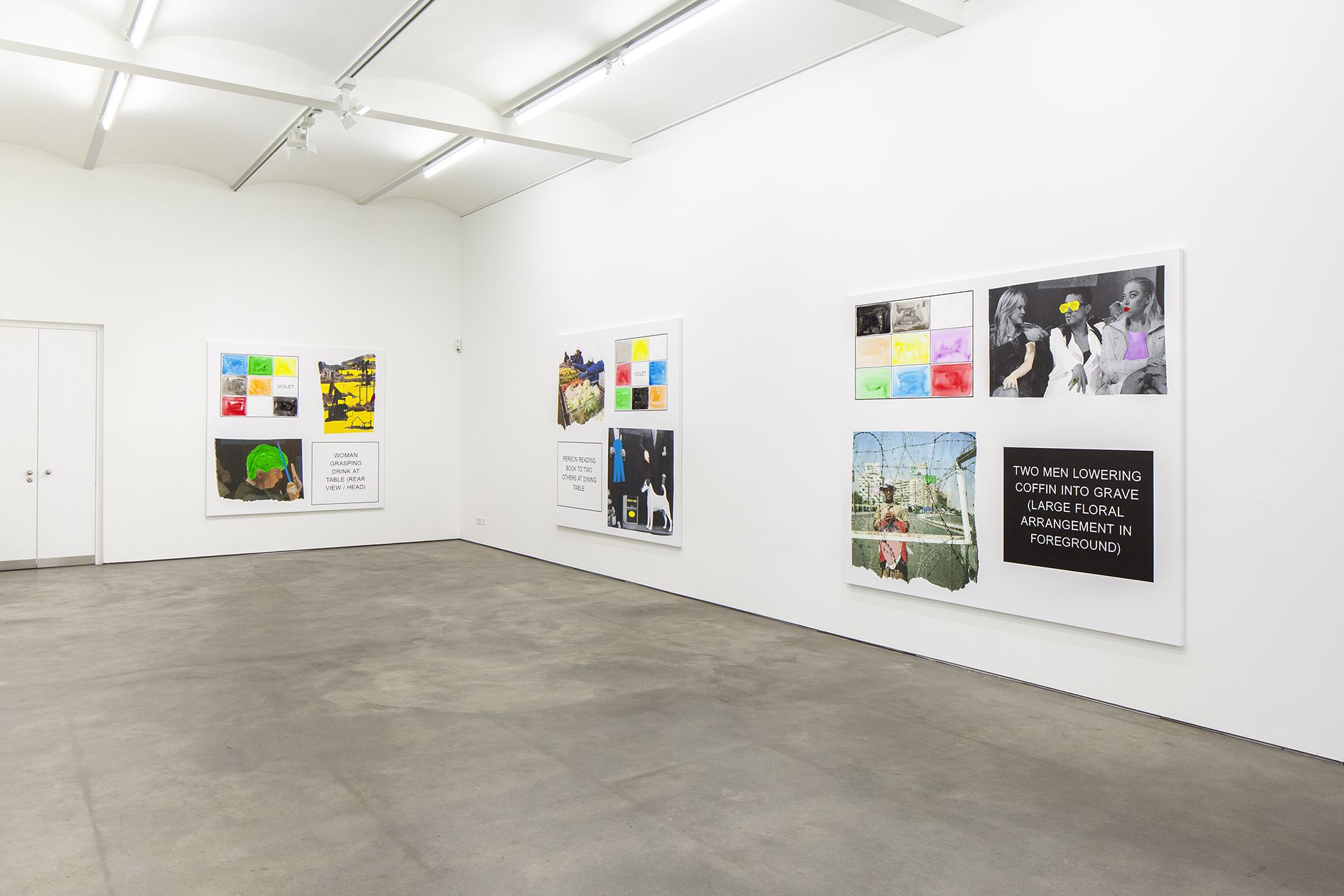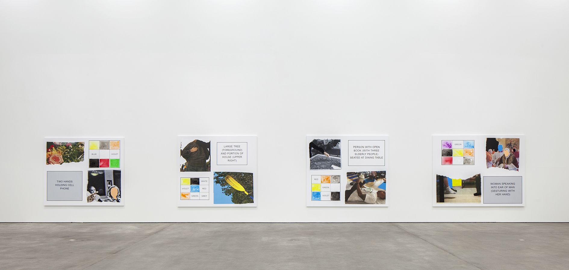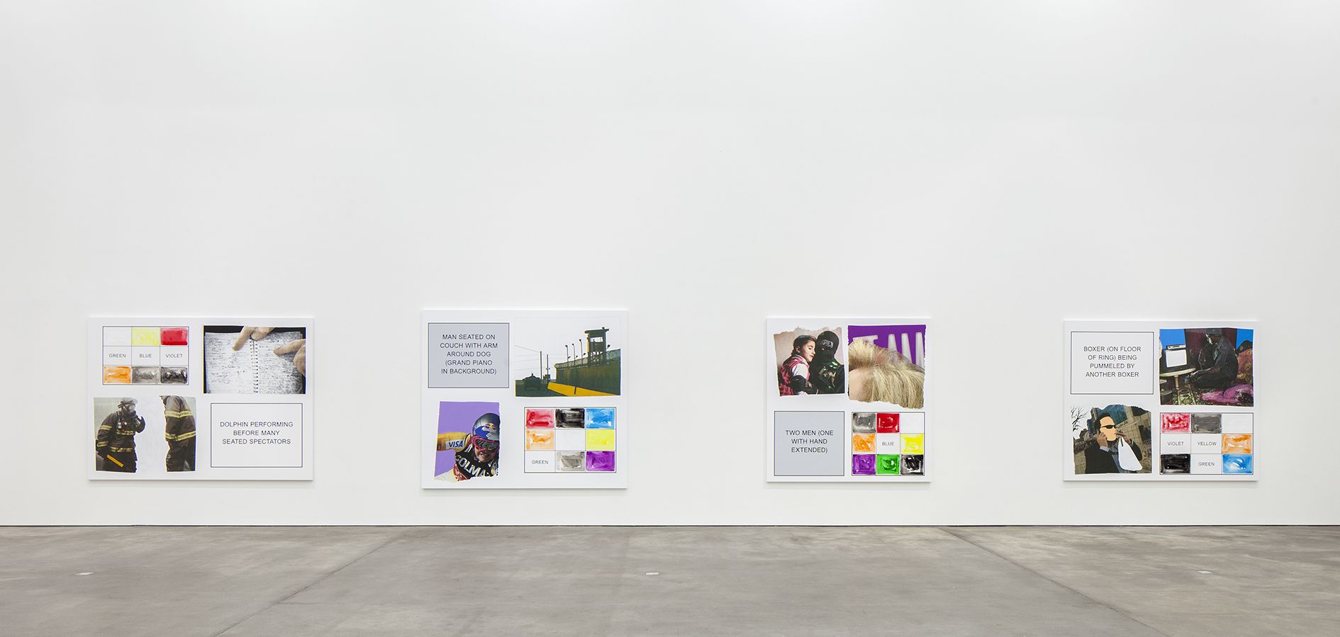 The storyboard canvases on display, measuring up to 2.60 meters in height, were printed in an inkjet process and overpainted with acrylic by Baldessari here and there. Each storyboard consists of two photographs ripped out of newspapers and magazines, a text panel which may implant a scene in the head of the viewer, and a color chart which takes up the hues of the individual pictorial elements.