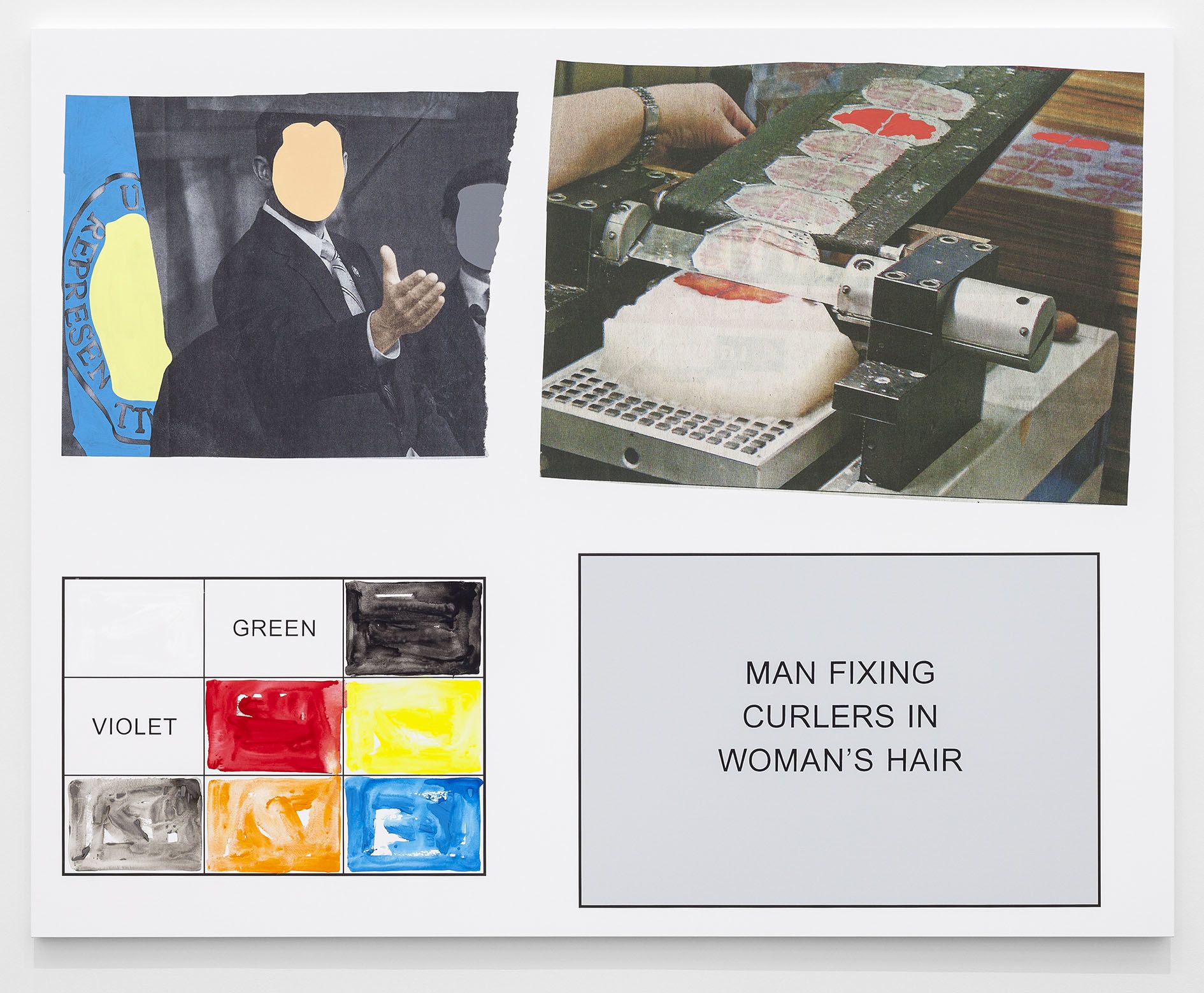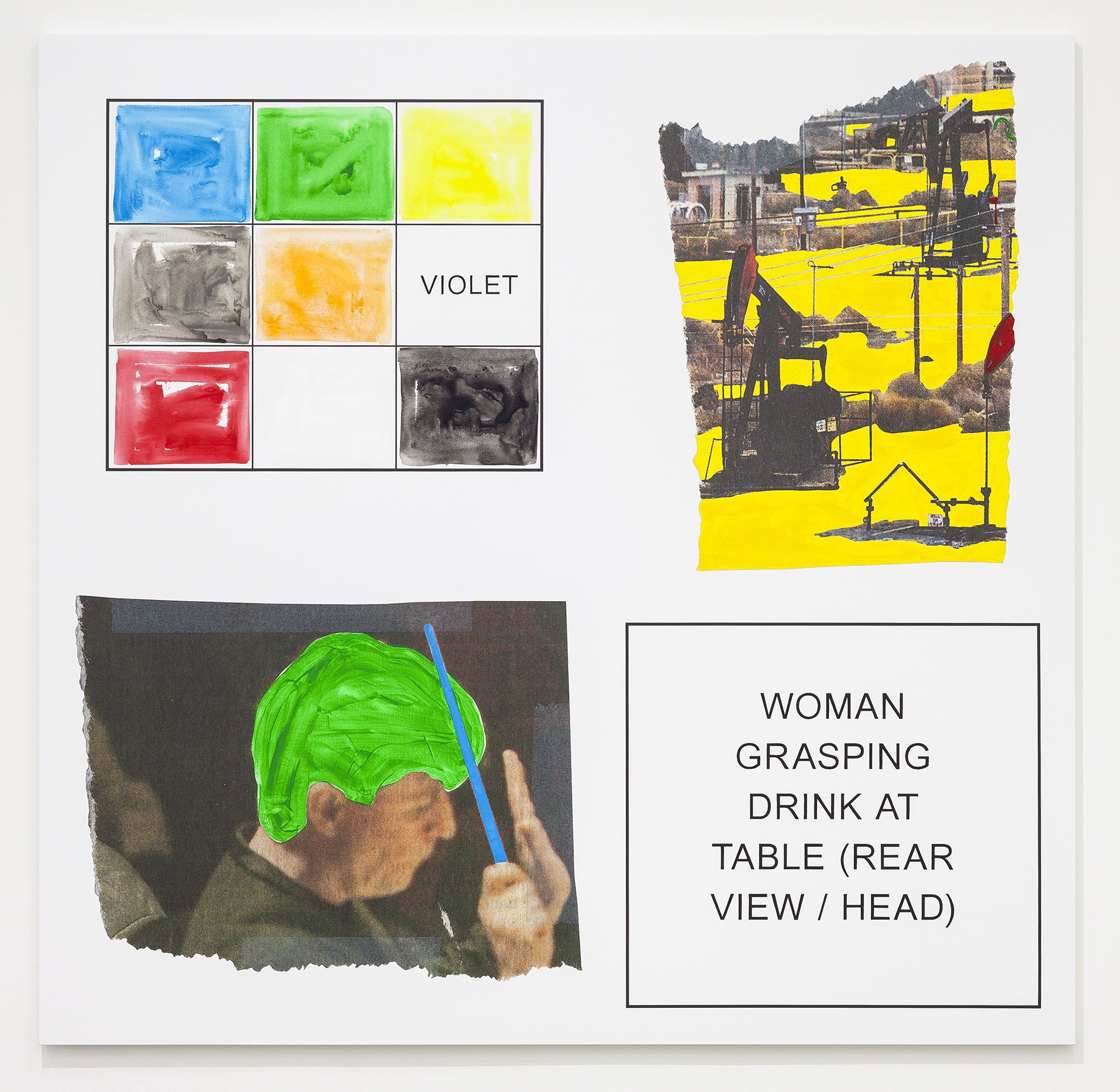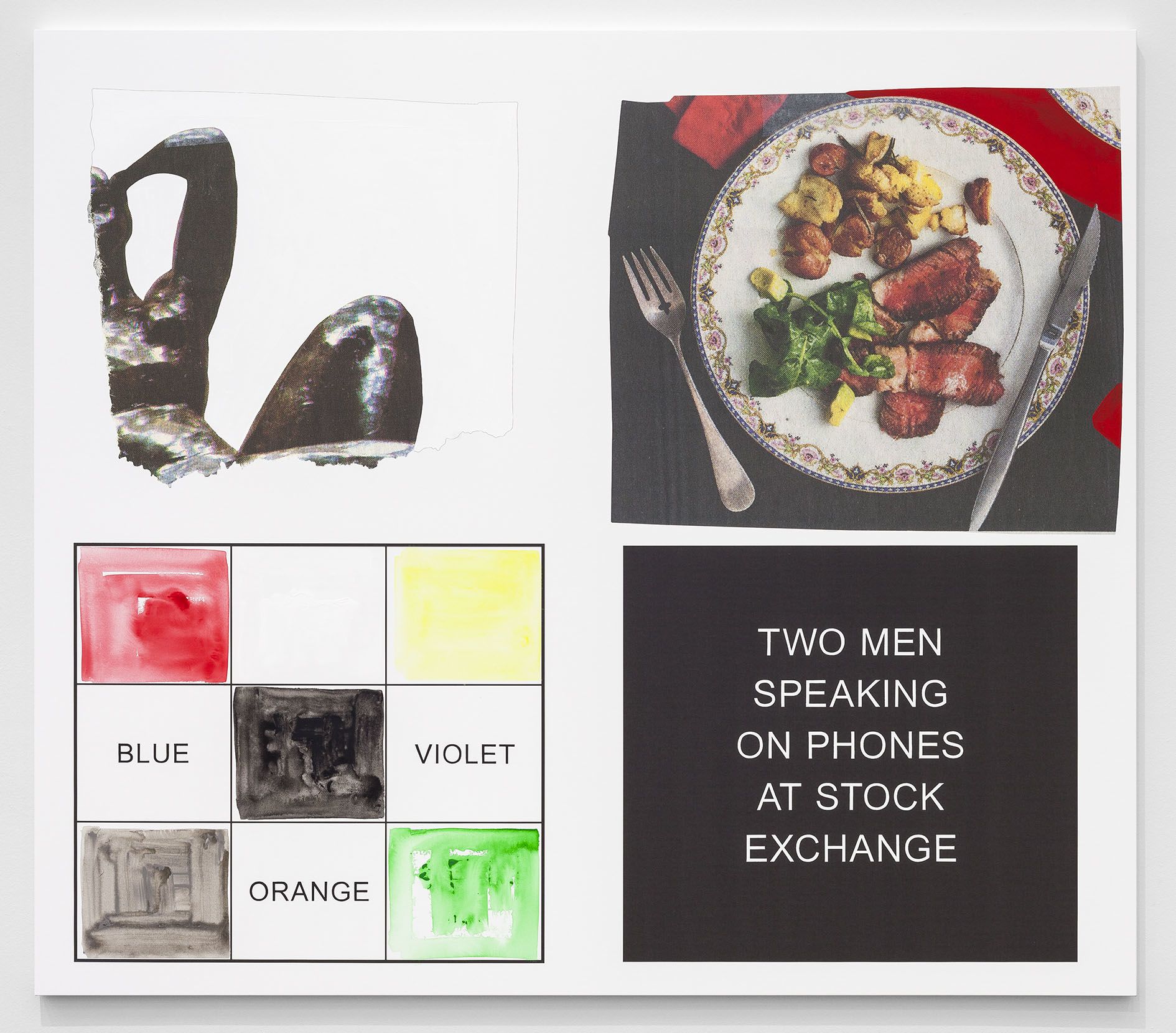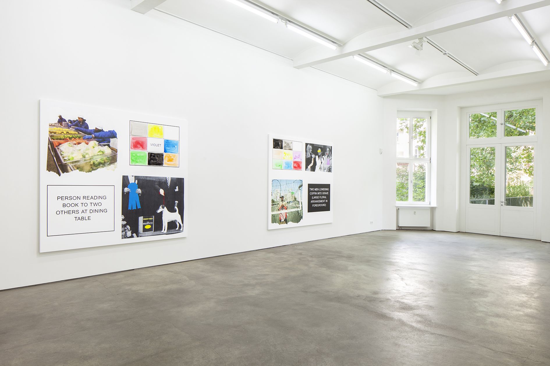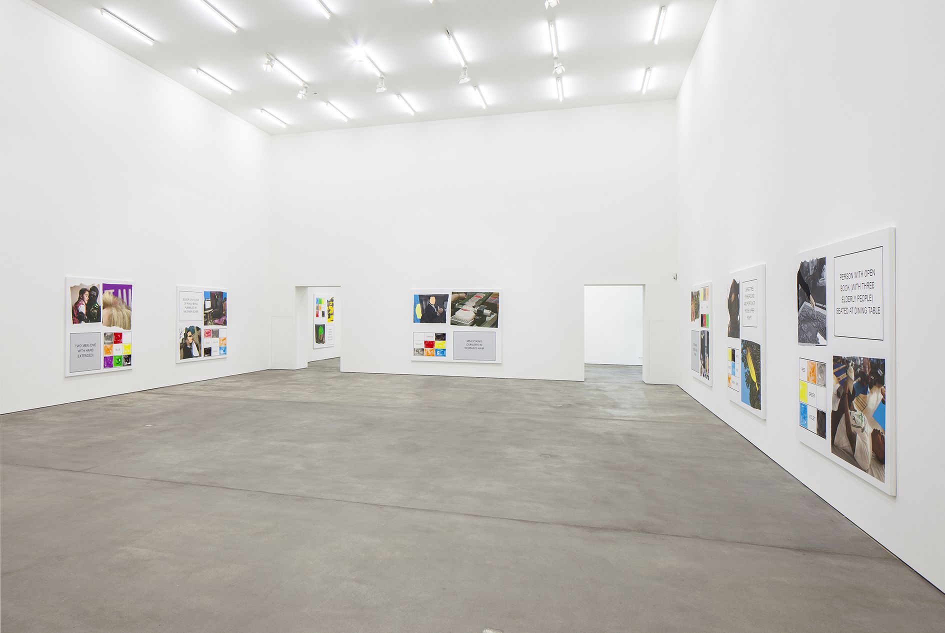 The storyboard canvases on display, measuring up to 2.60 meters in height, were printed in an inkjet process and overpainted with acrylic by Baldessari here and there. Each storyboard consists of two photographs ripped out of newspapers and magazines, a text panel which may implant a scene in the head of the viewer, and a color chart which takes up the hues of the individual pictorial elements.