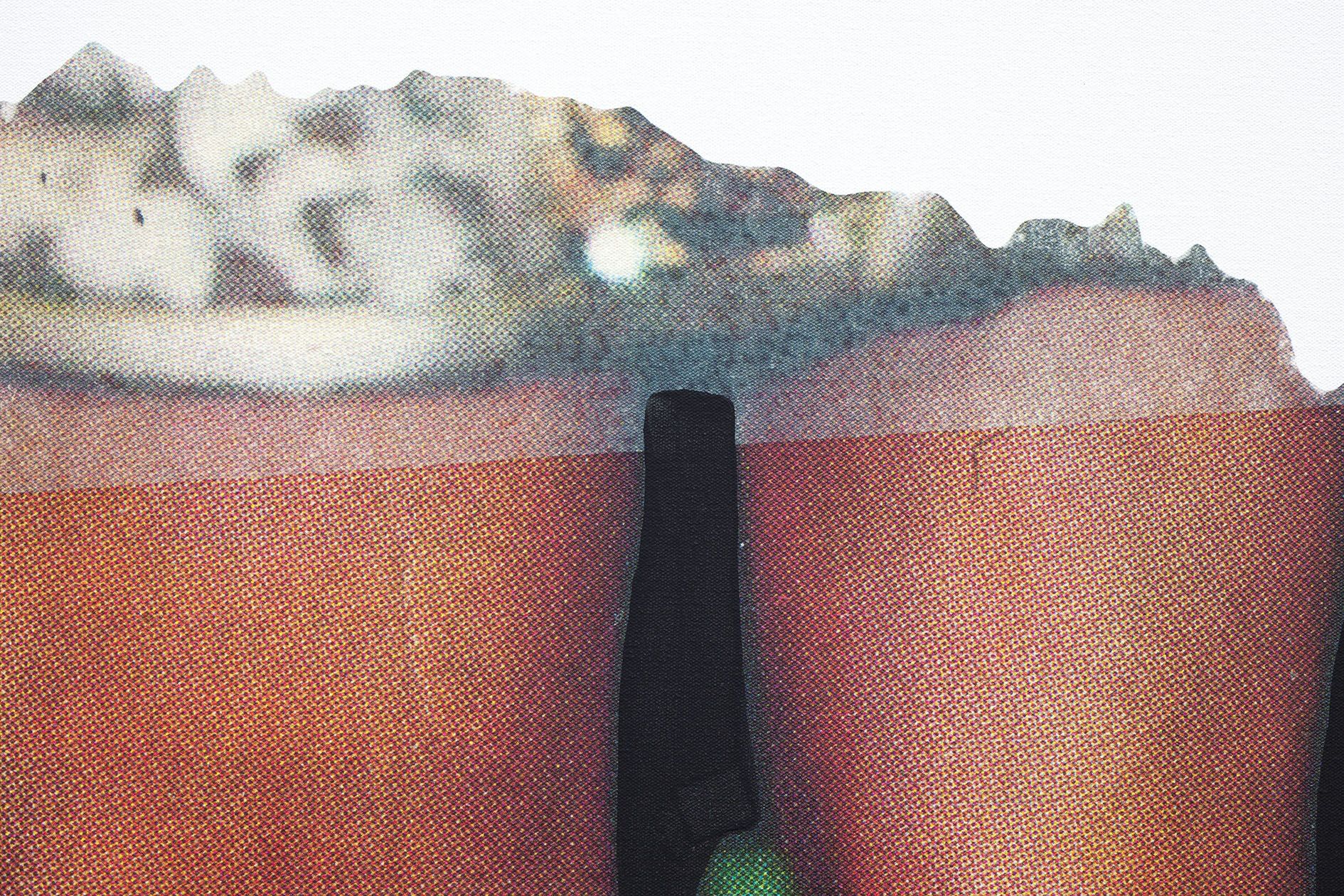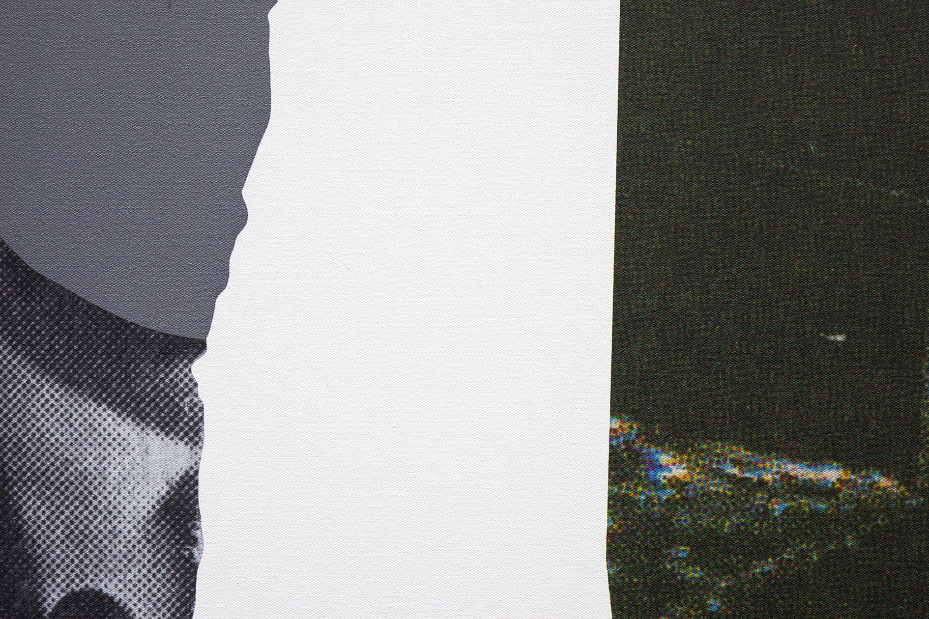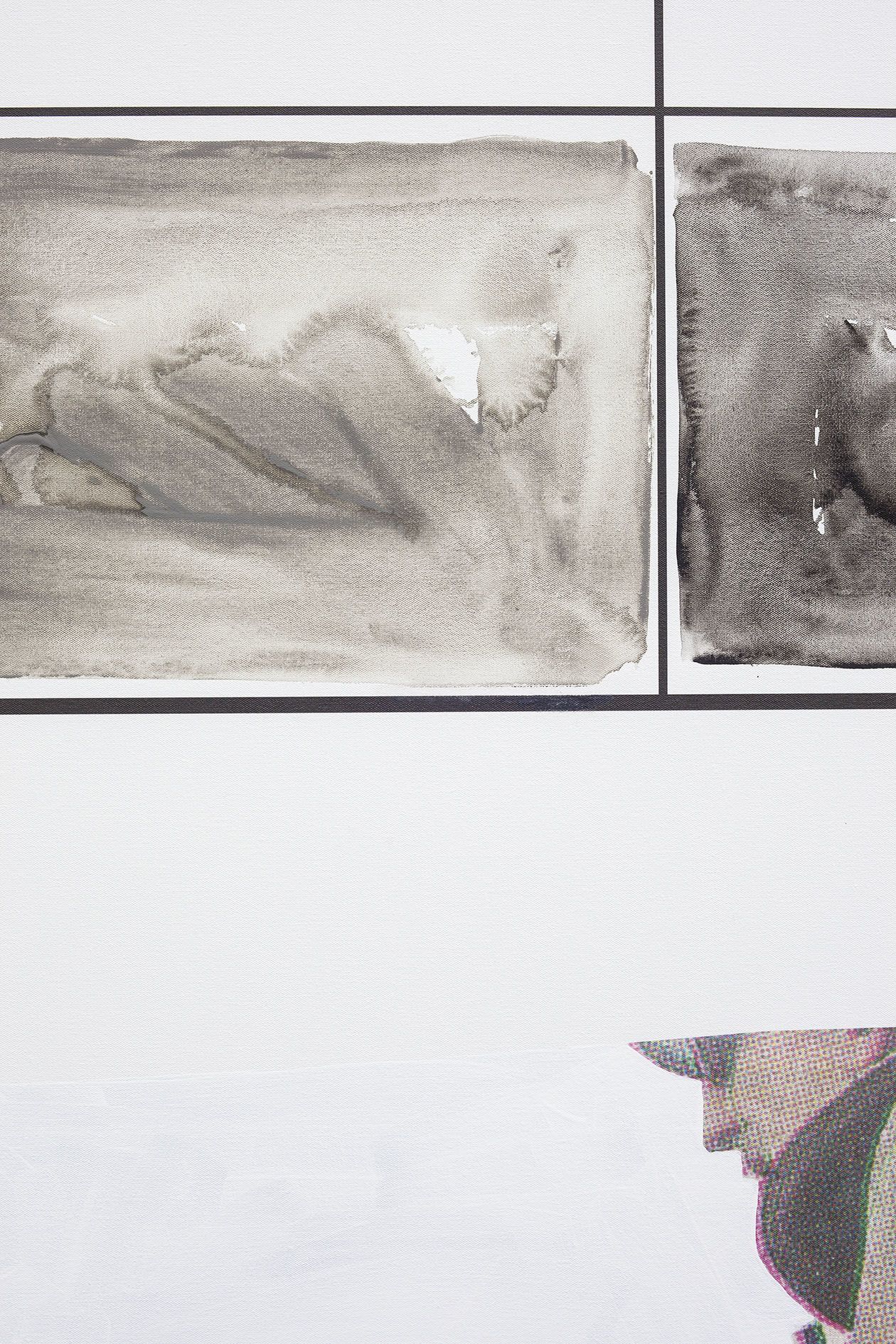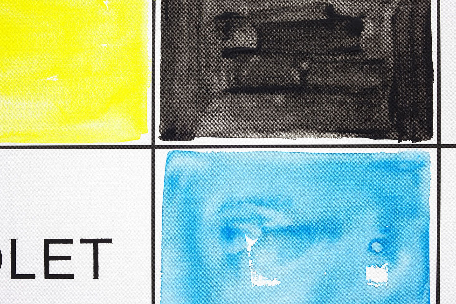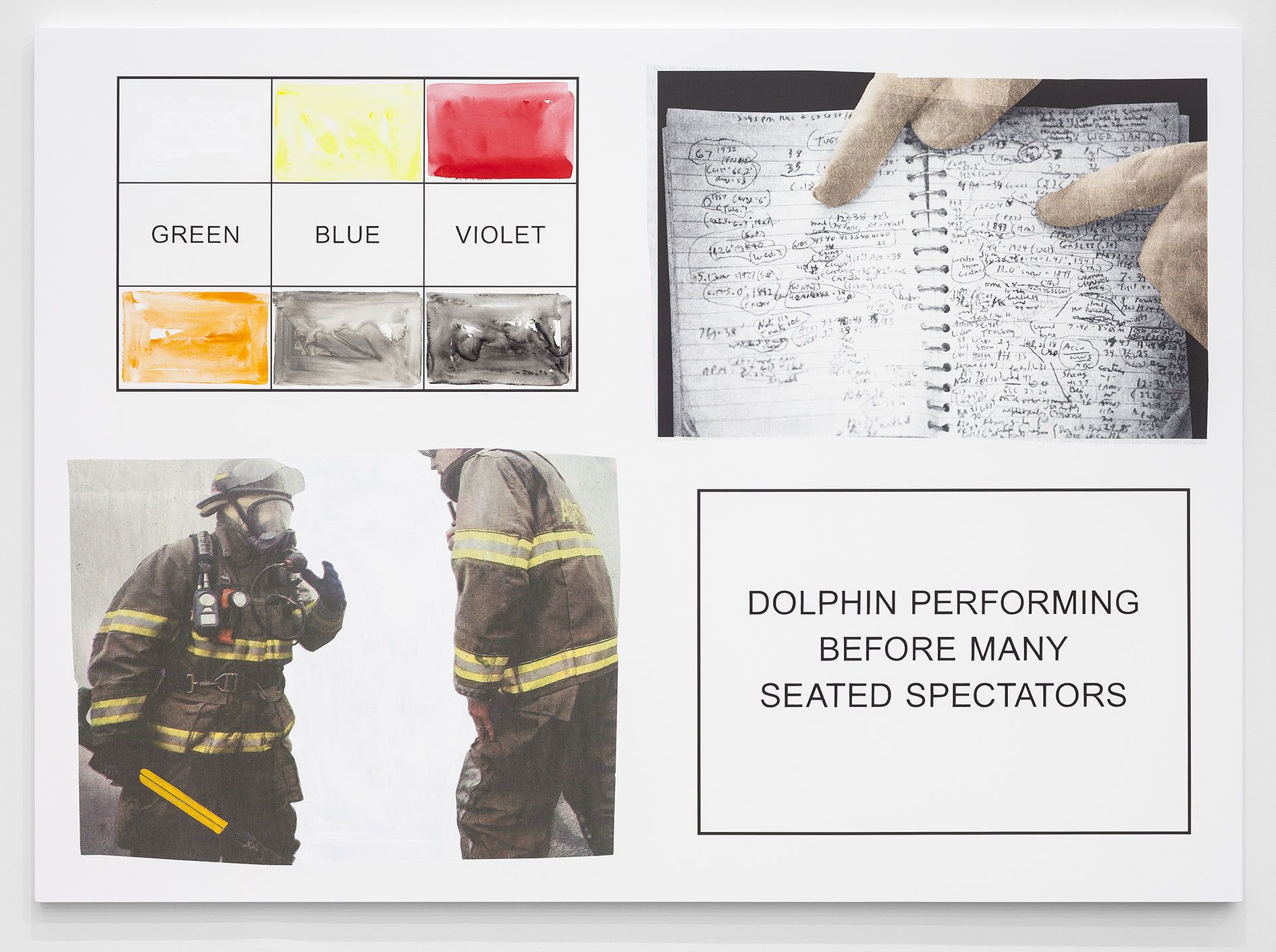 The storyboard canvases on display, measuring up to 2.60 meters in height, were printed in an inkjet process and overpainted with acrylic by Baldessari here and there. Each storyboard consists of two photographs ripped out of newspapers and magazines, a text panel which may implant a scene in the head of the viewer, and a color chart which takes up the hues of the individual pictorial elements.