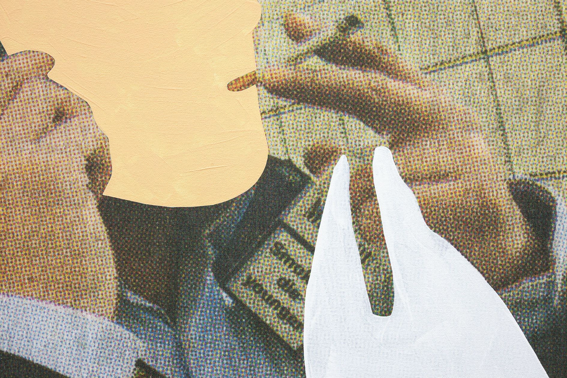 The pictures created in this manner not only evoke the storyboard, an aid to film production used by directors for developing a narrative sequence, but also make reference to earlier works by Baldessari: his collages of found film stills furnished with colored circles and surfaces, the philosophical witticisms on canvas typical of his early œuvre, in which the picture is replaced by a text about the picture, or his serial deconstruction of motifs into simple color charts done in pantone colors. The works may provoke both amusement and disquiet, and they guarantee that the viewer becomes more acutely aware of the interwoven processes of making art, viewing art, and understanding art. The storyboards have an almost melancholic glamour. Although they seem to have been created with no particular regard for style – still to be seen here and there is the adhesive tape with which the newspaper images were attached to the surface –, their cool and cryptic subtlety immediately causes them to be recognized as works by Baldessari.