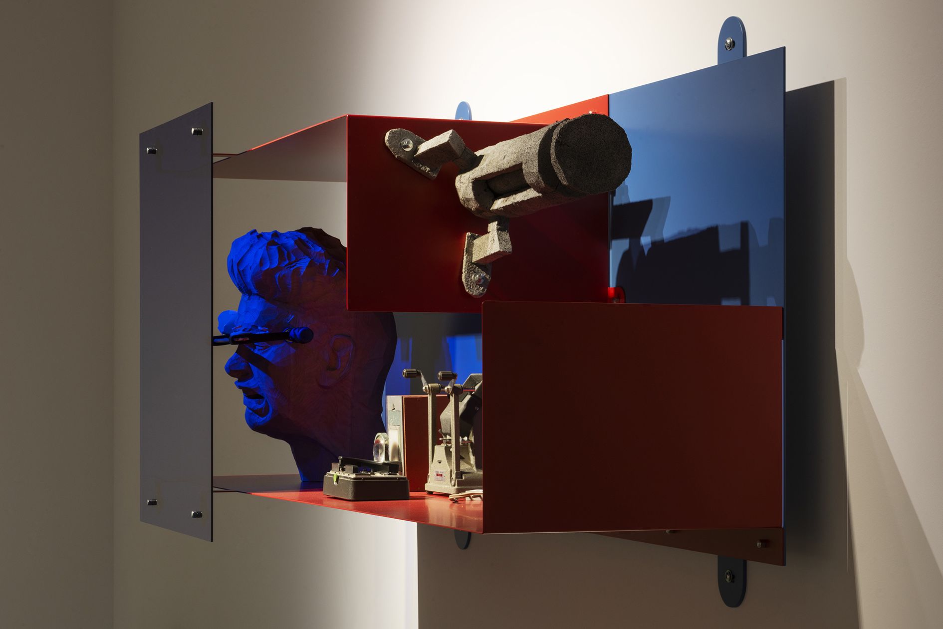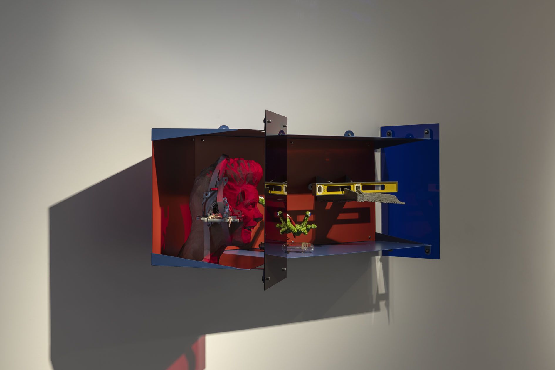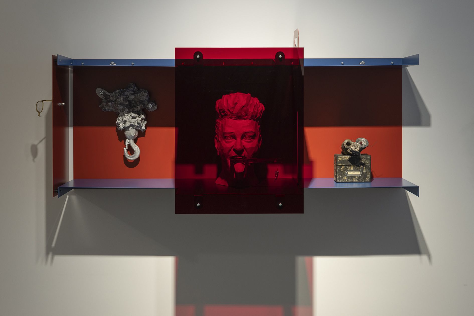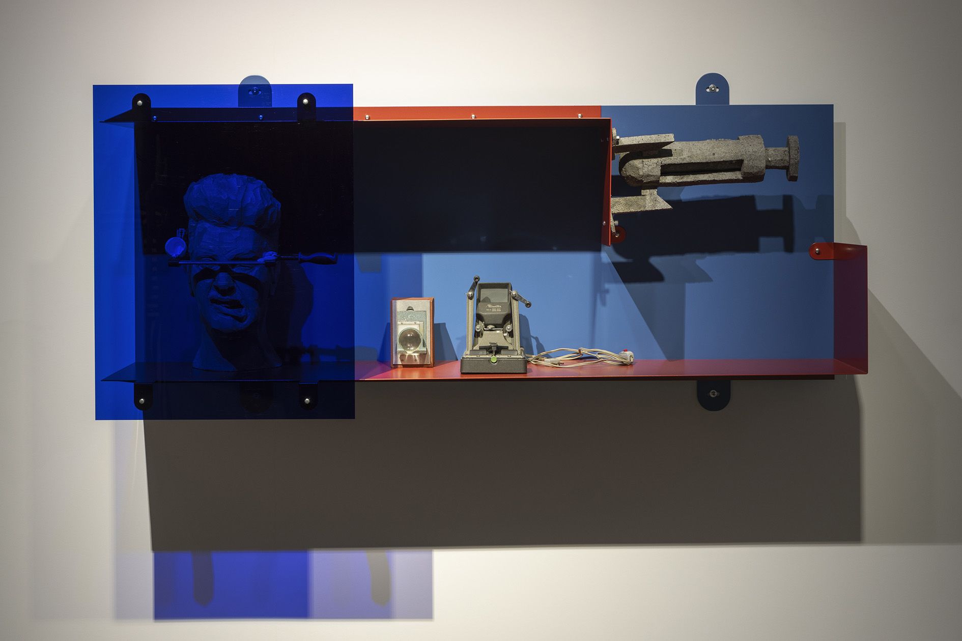 Red and blue powder-coated steel display case with blue Plexiglas, wooden head with razor blade in Babybel wax and screw clamp with small objects, old film editing equipment, aluminum object