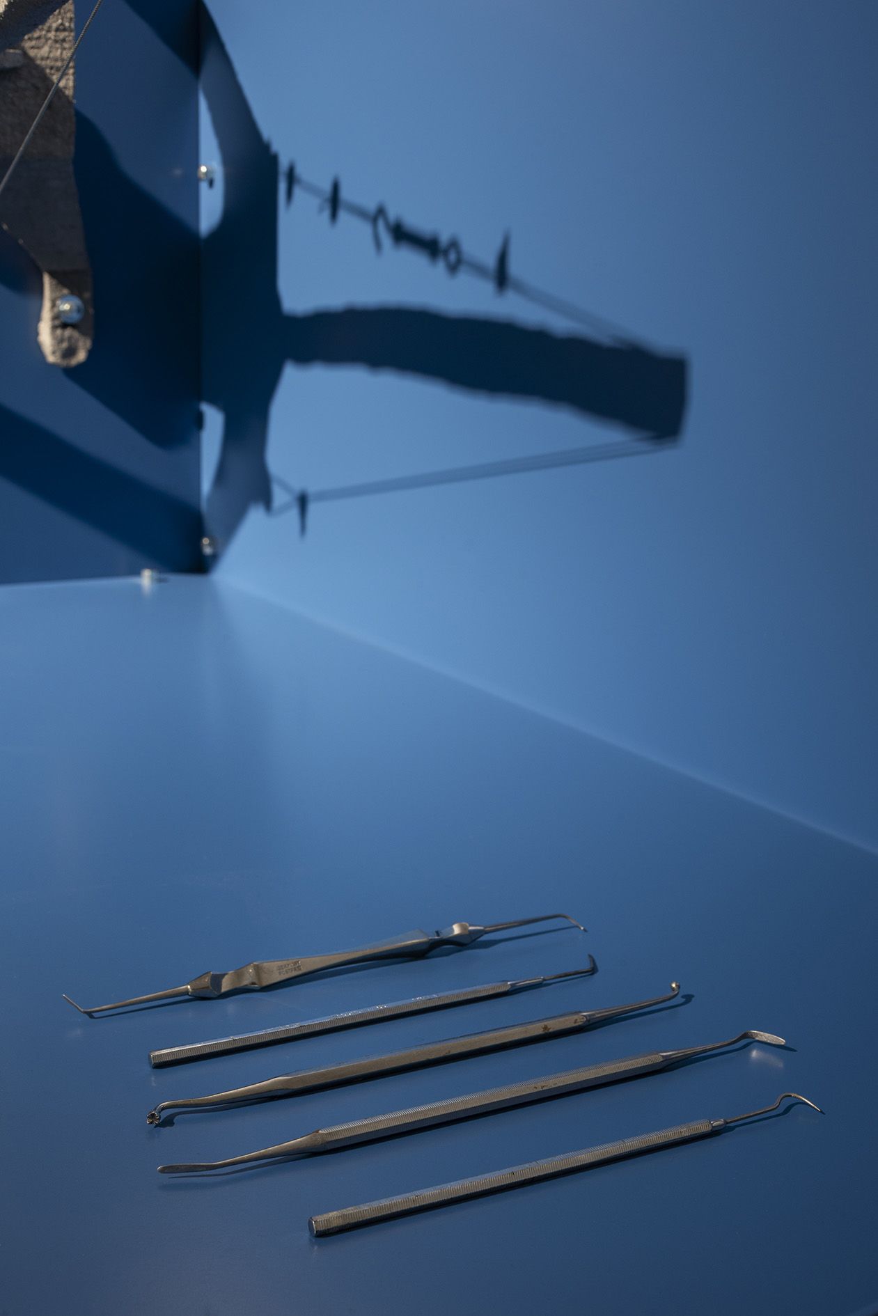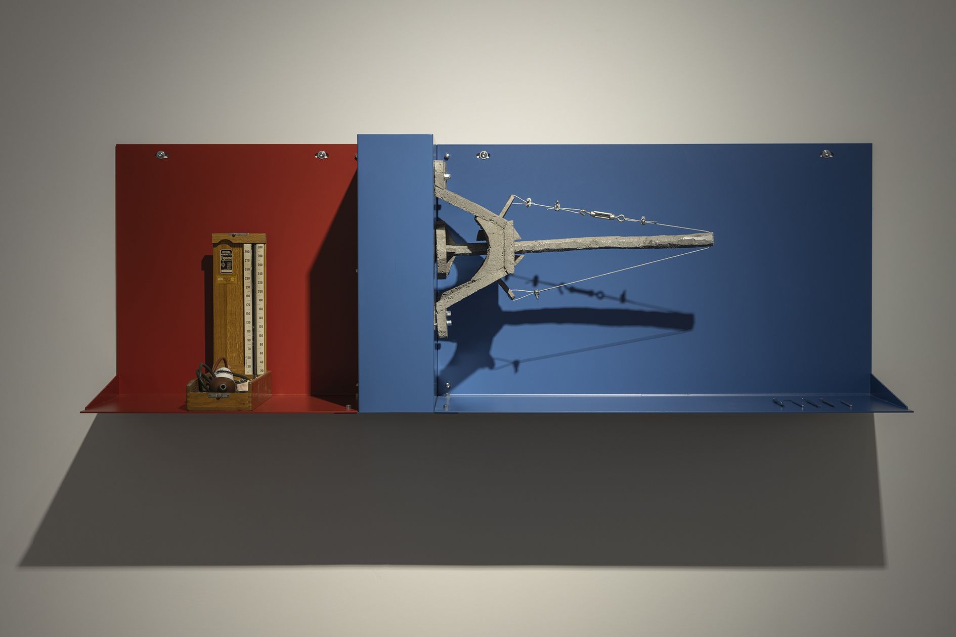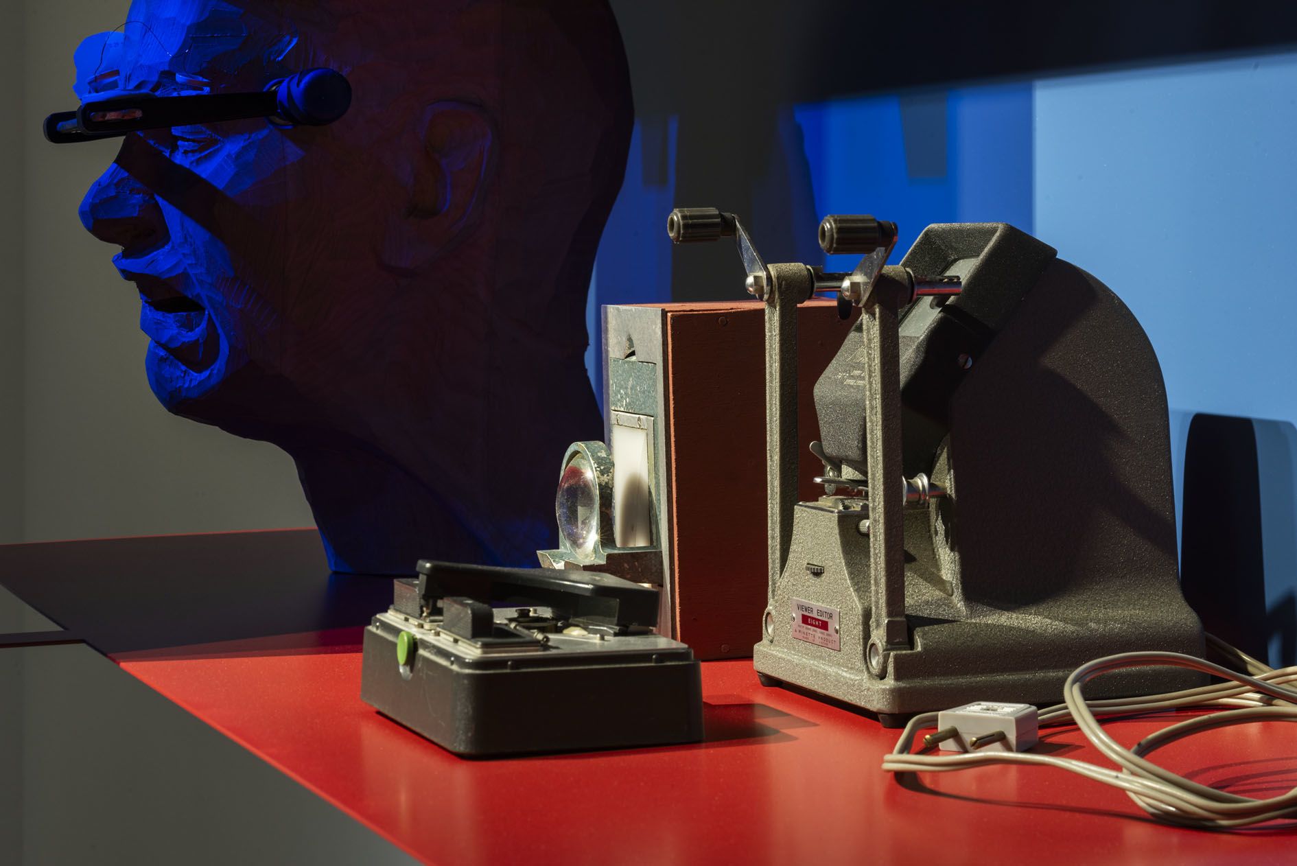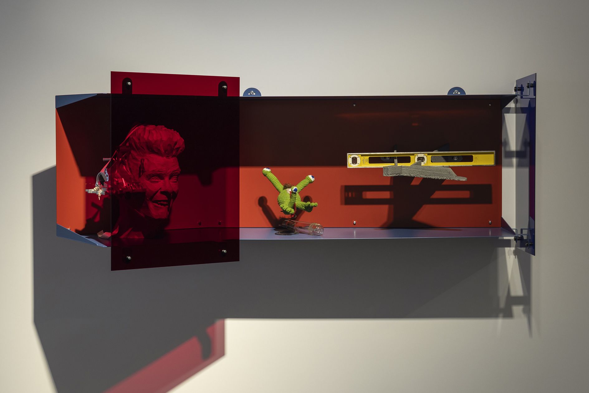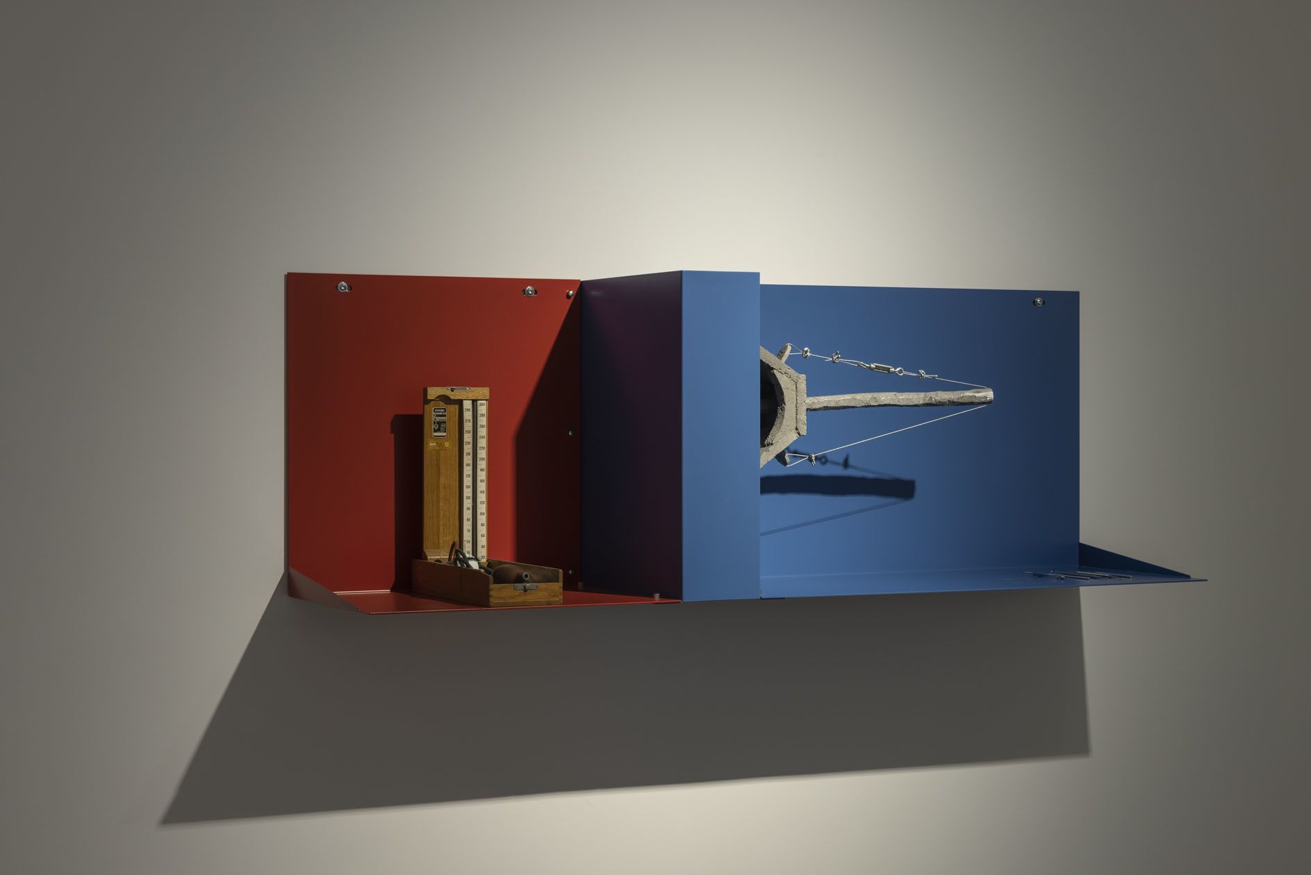 Red and blue powder-coated steel display case with blue Plexiglas, wooden head with razor blade in Babybel wax and screw clamp with small objects, old film editing equipment, aluminum object
