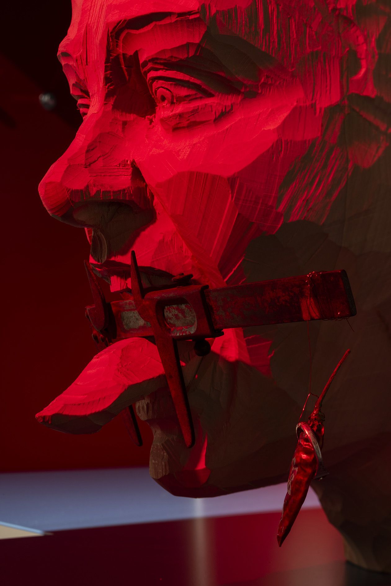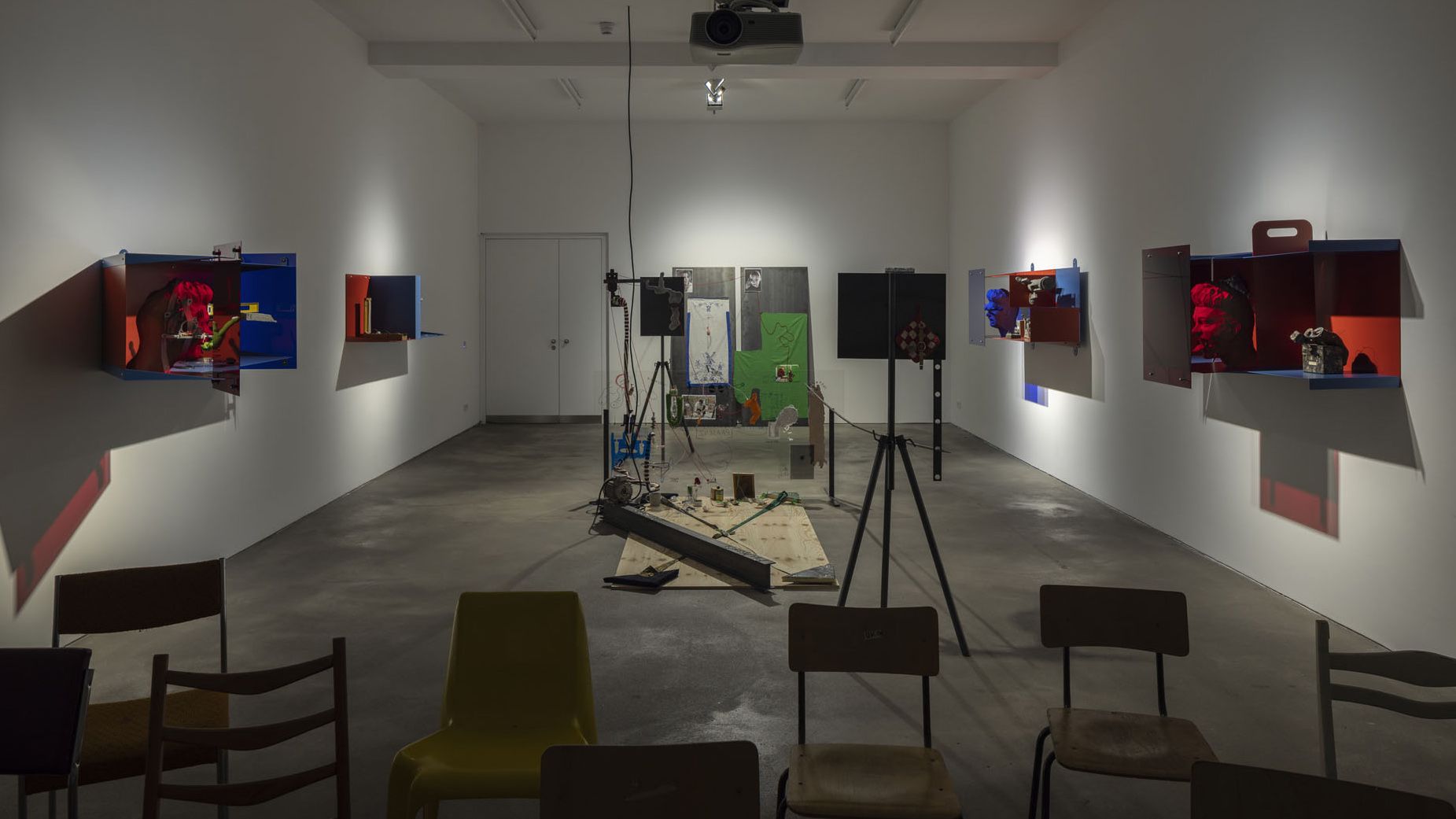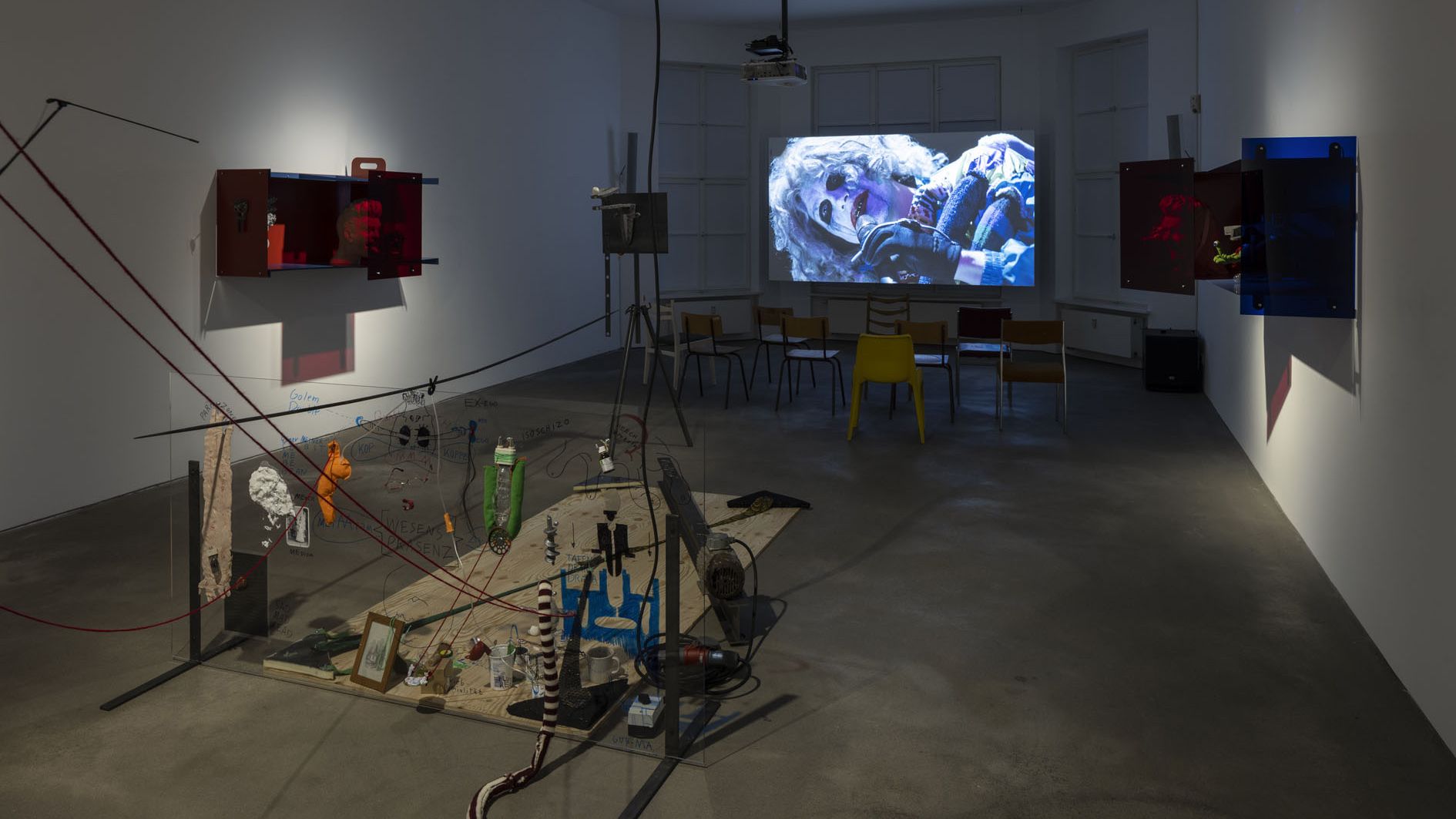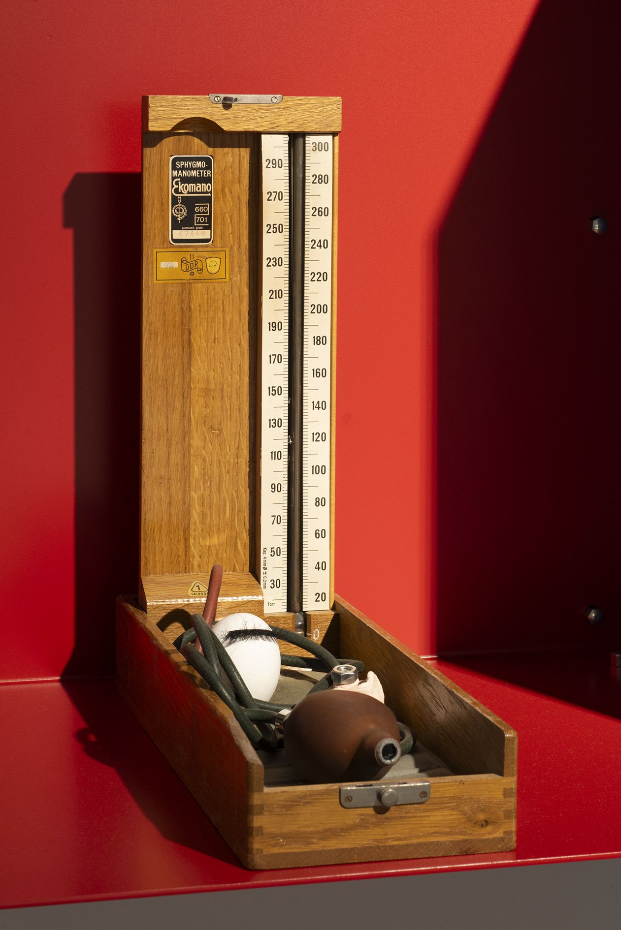 Red and blue powder-coated steel display case with blue Plexiglas, wooden head with razor blade in Babybel wax and screw clamp with small objects, old film editing equipment, aluminum object