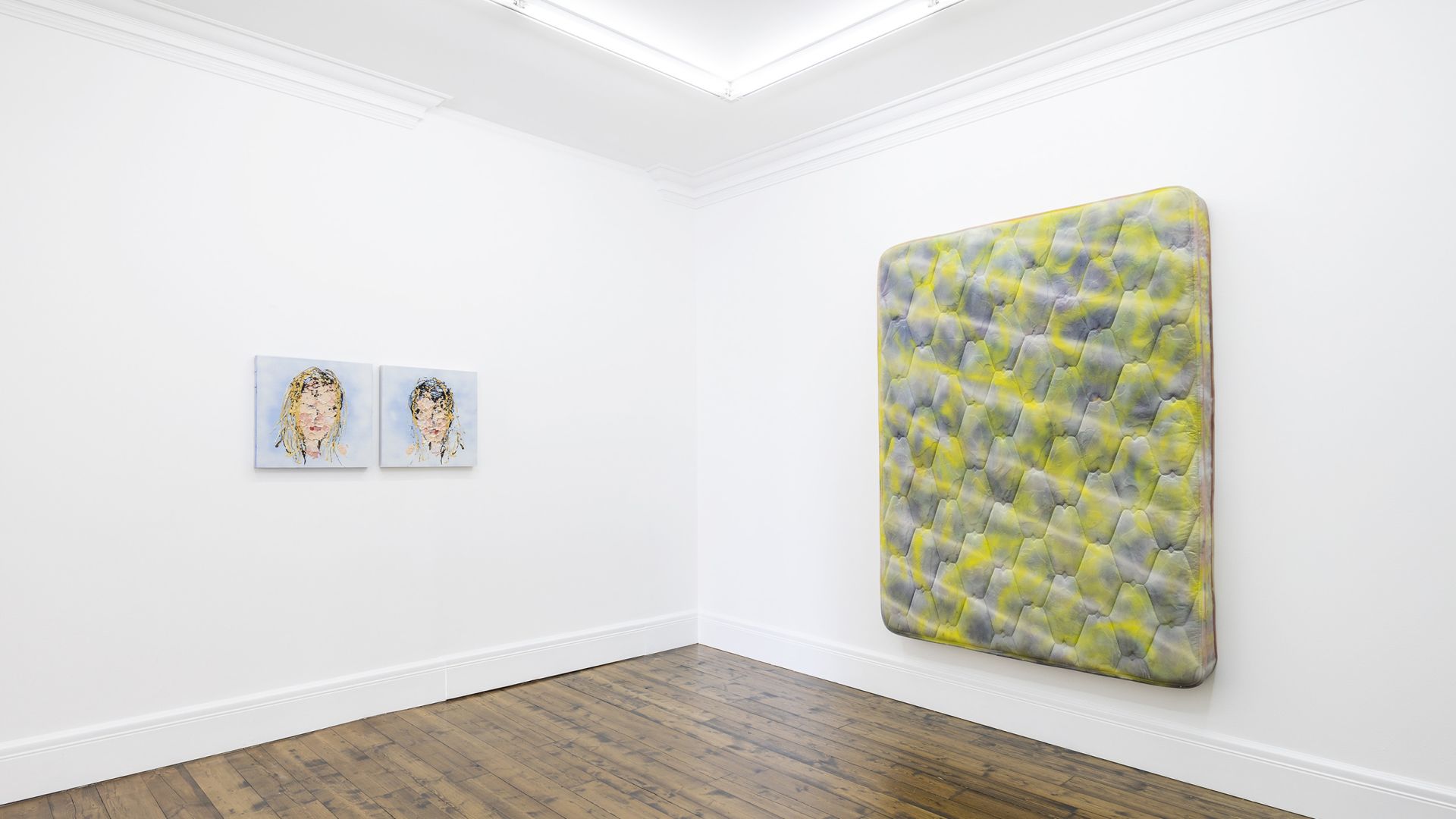 Upson’s dynamic application of pigment features in two works from 2013, 98 and 156, twin- and queen-sized mattresses rendered in bright tones of green, blue and yellow that illustrate her vivid exploration of both beauty and the grotesque.