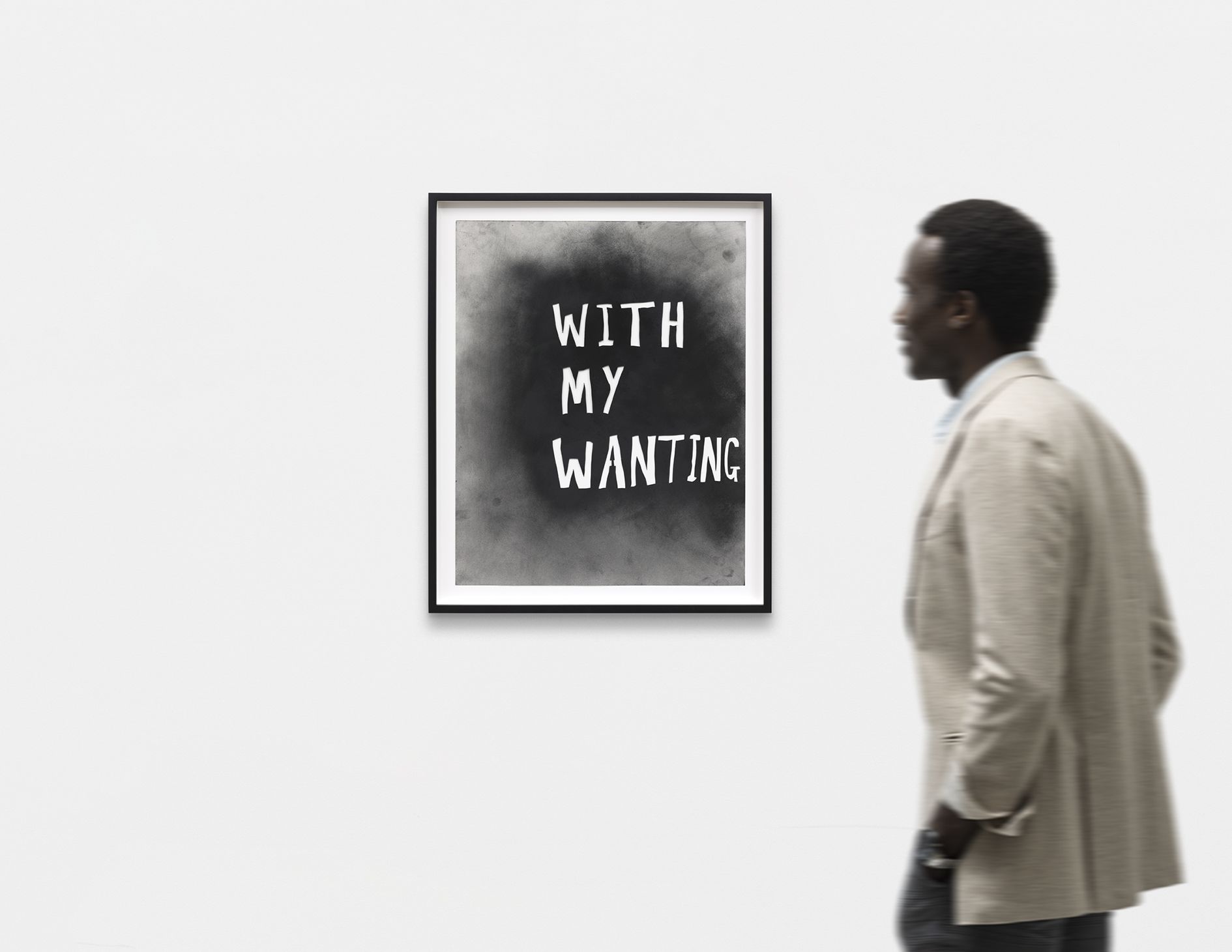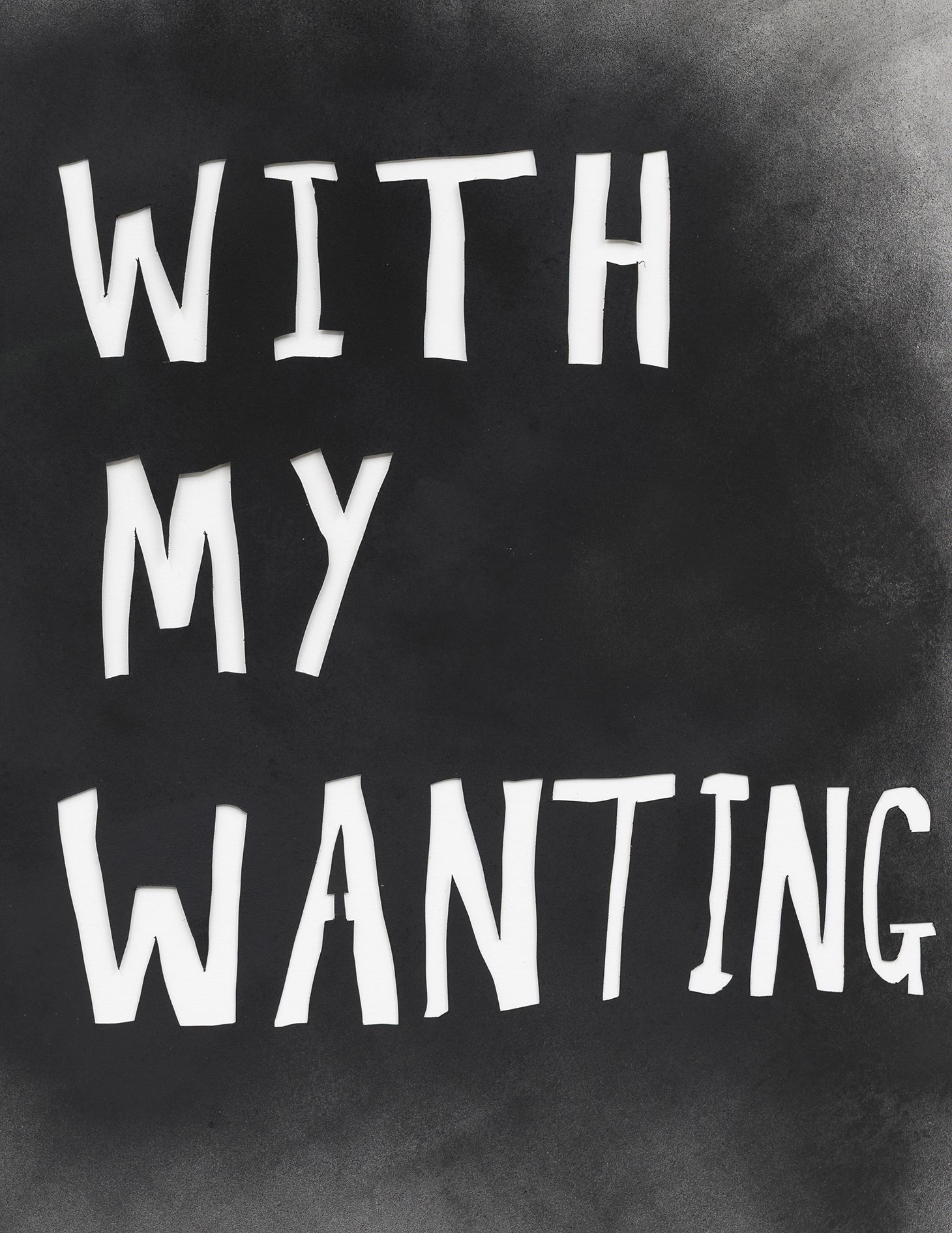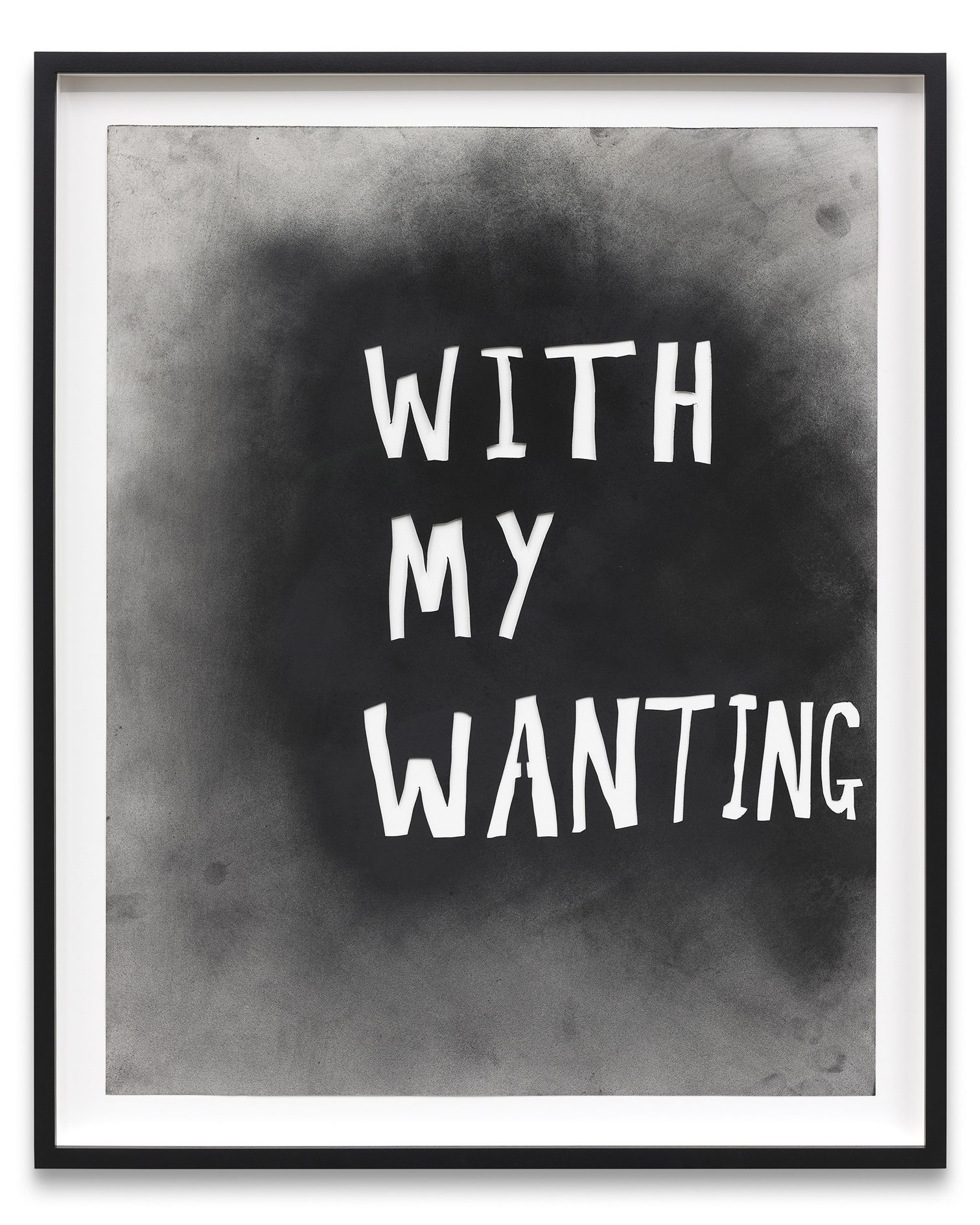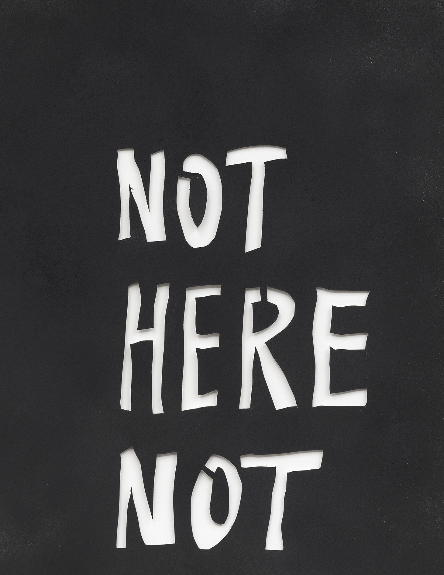 Because of the fire that consumed Larry’s house (first partially in 2003, and then completely in 2007), Upson frequently employed charcoal – the residue of fire – attracted by its deep, black tones and its metaphorical links to destruction, transformation and rebirth. A series of text-based drawings from 2009 feature phrases and commands filtered from past relationships, both real and dramatized (“Go Inside”, “Not Here Not Now”) and are made from charcoal and cutouts to echo burnt paper.