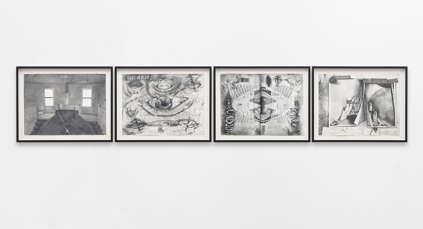 This became a recurring image in Upson’s drawings, including in the four-part House to Body Shift (2012) that gives this exhibition its title. There, the staircase is now on its side, mirrored and doubled, creating an ocular presence alongside notations of “fold” and “unfold,” referring perhaps to the folds of paper or skin.