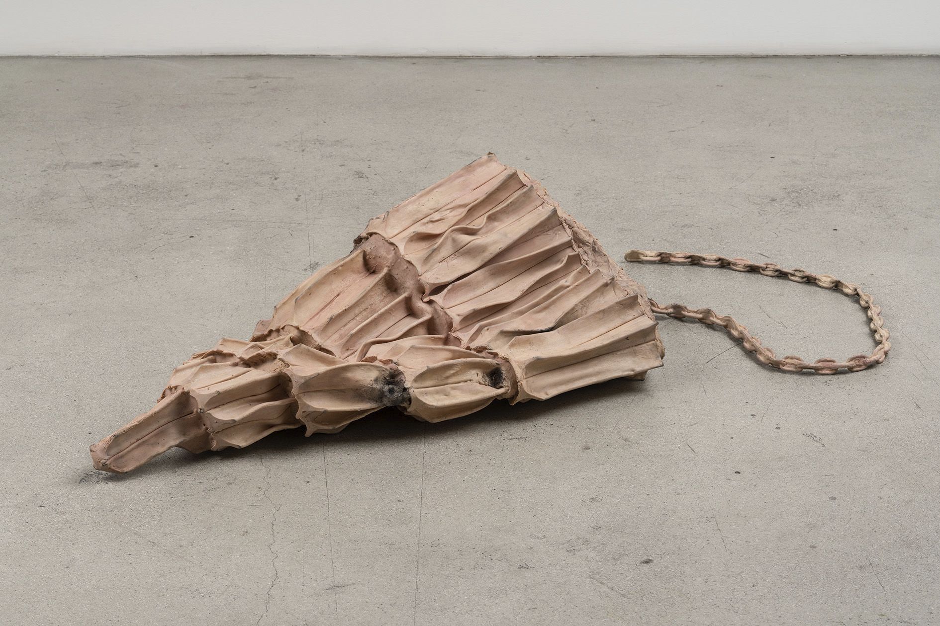 In 2012, Upson turned to working with soft furniture, including mattresses, sofas and other objects found discarded near her studio in Los Angeles. The artist cast these forms out of silicone and urethane, fascinated with the possibility of lifting and replicating not only their surfaces and “skins,” but also the emotional, psychological and physical traces of those who had used them (she had also earlier encountered an unusual number of mattresses in the rooms of Larry’s house).