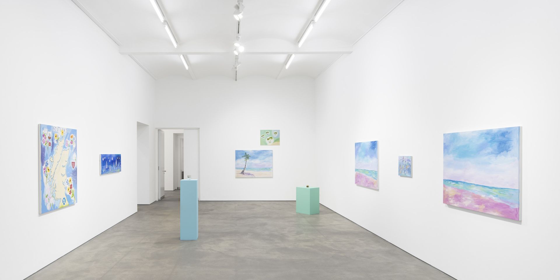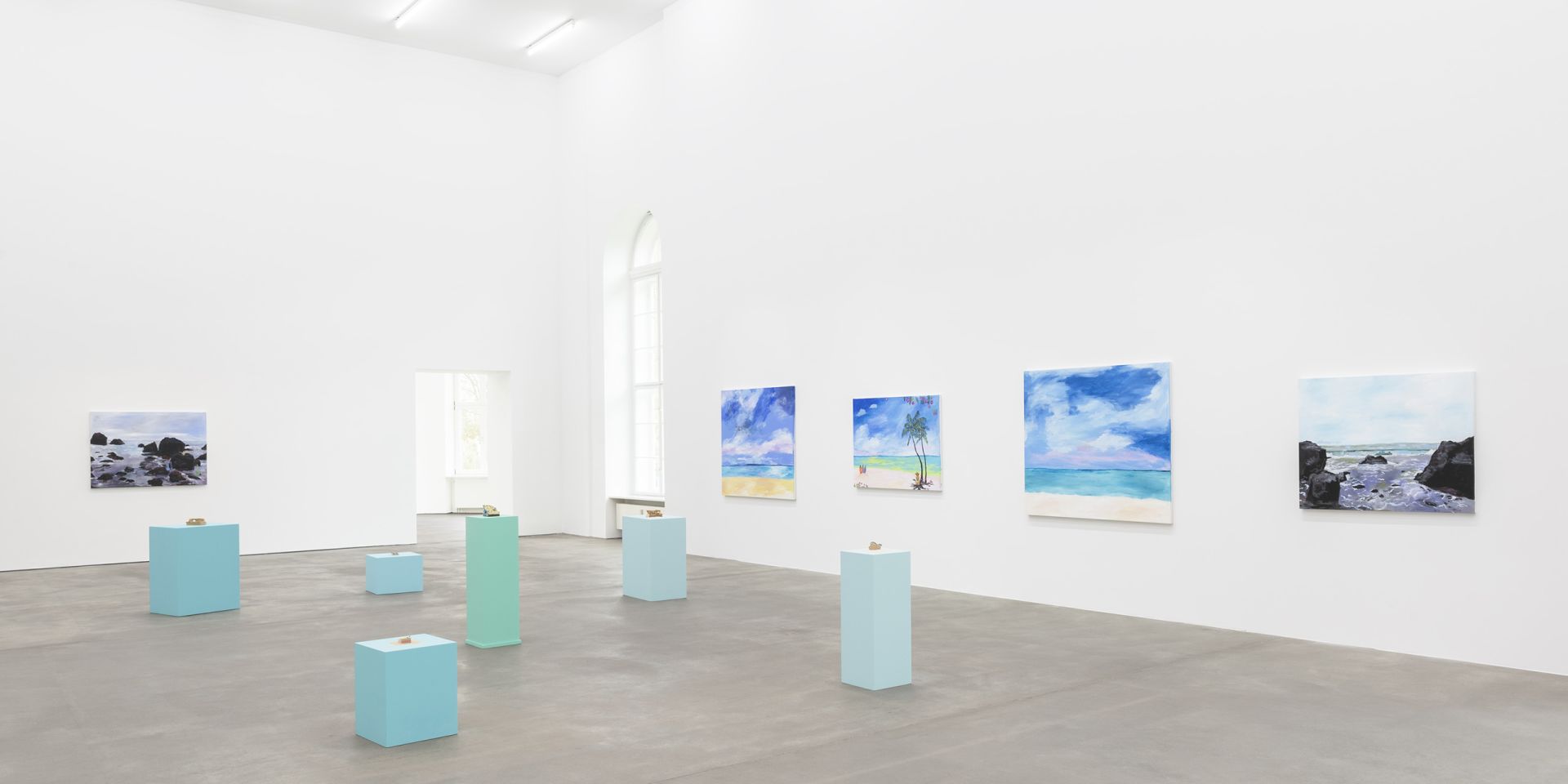 The exhibition presents beach paintings by Karen Kilimnik for a winter escape.